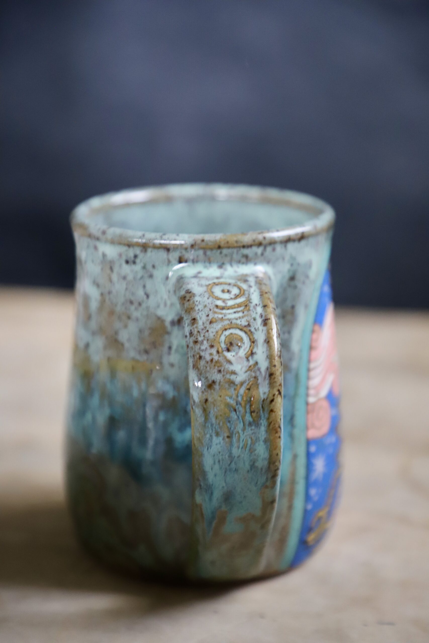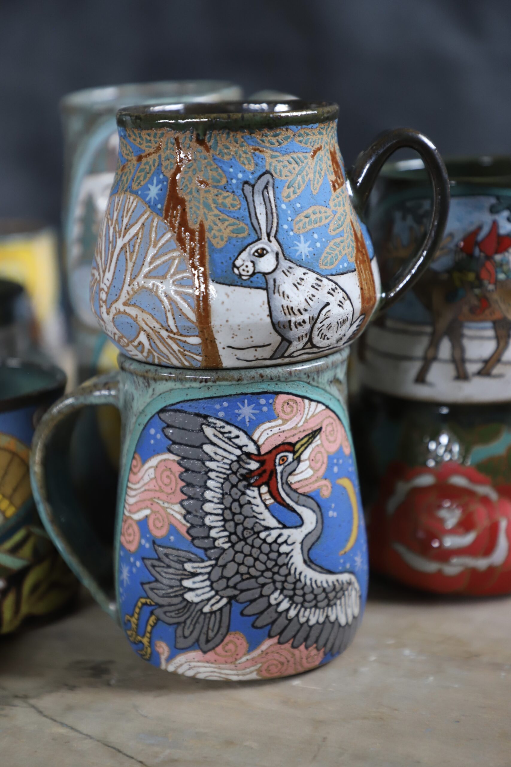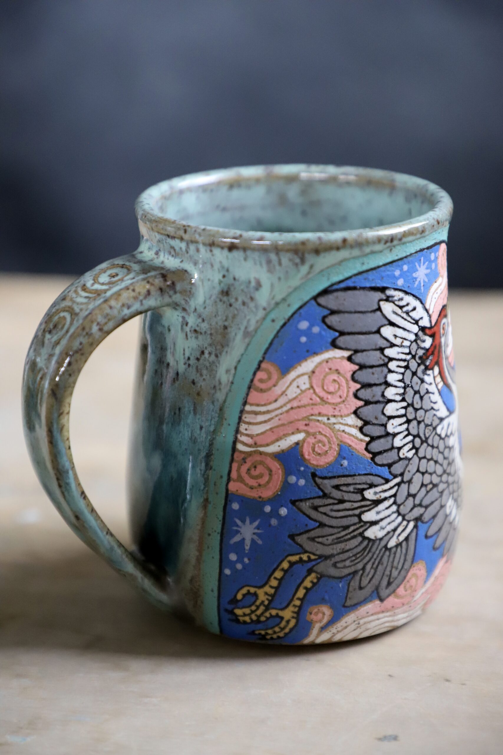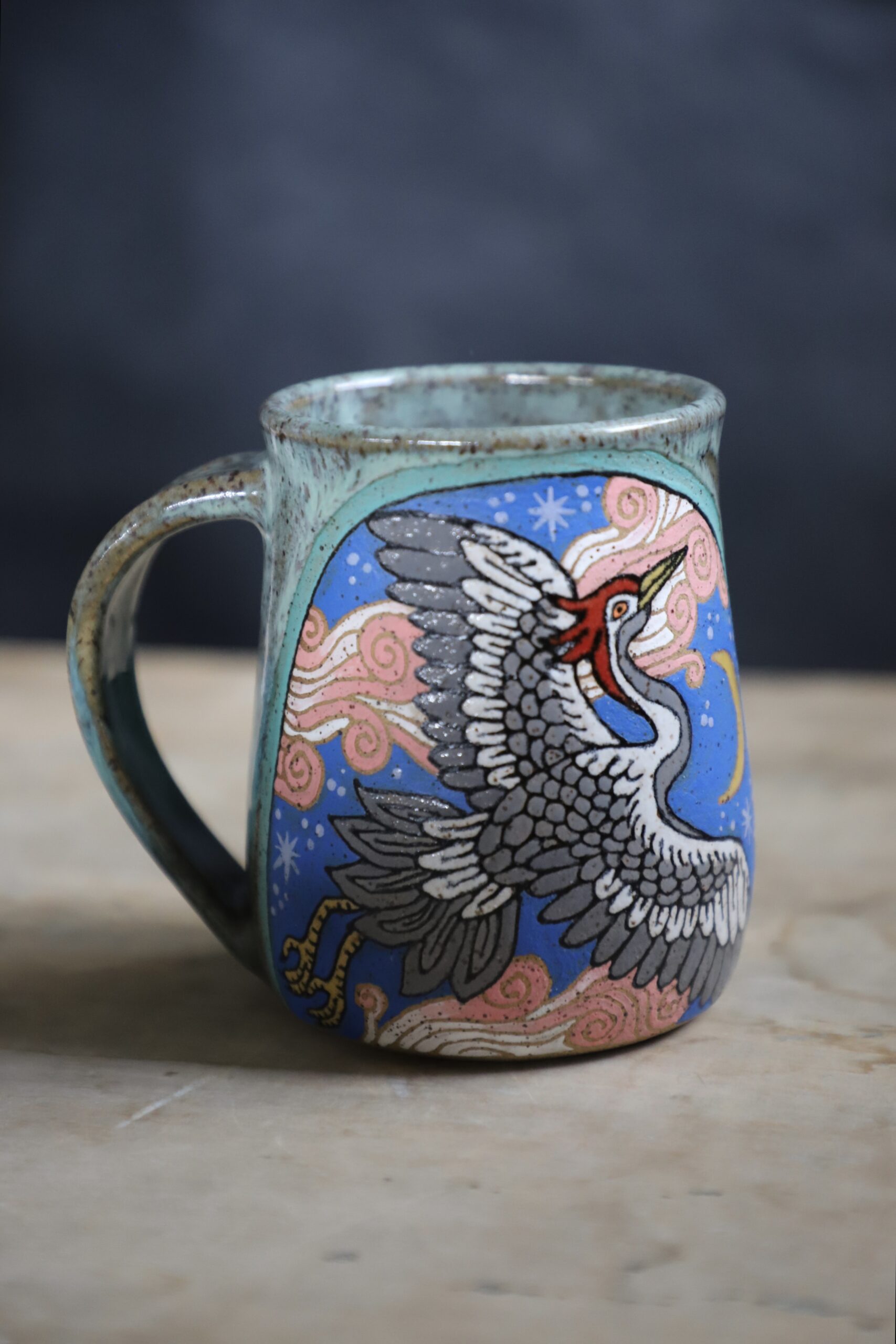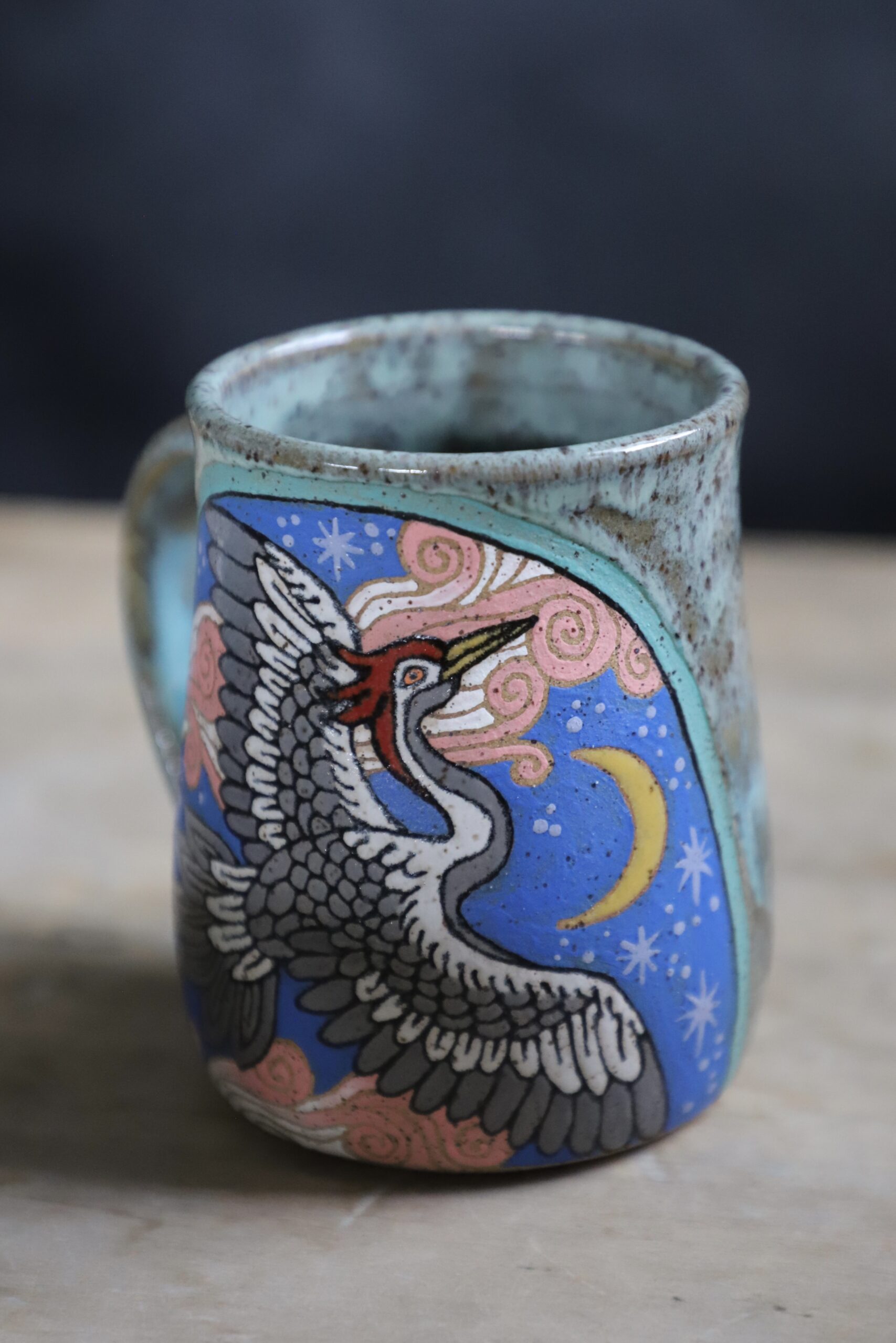 Crane mug holds 19oz. From my heART to you, made with joyful hands. Top rack dishwasher & microwave safe. As with any handmade item handwashing is best to ensure longevity.