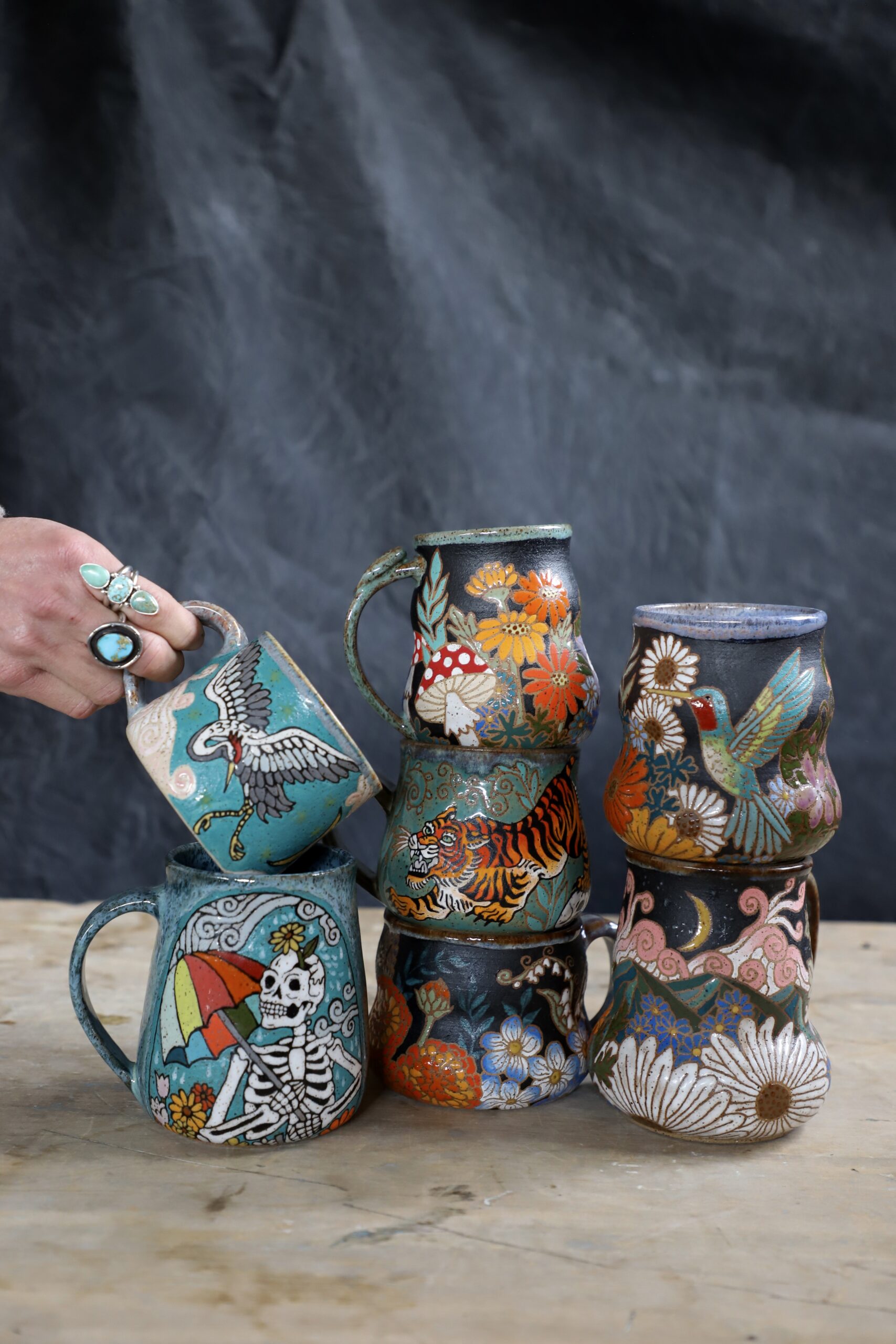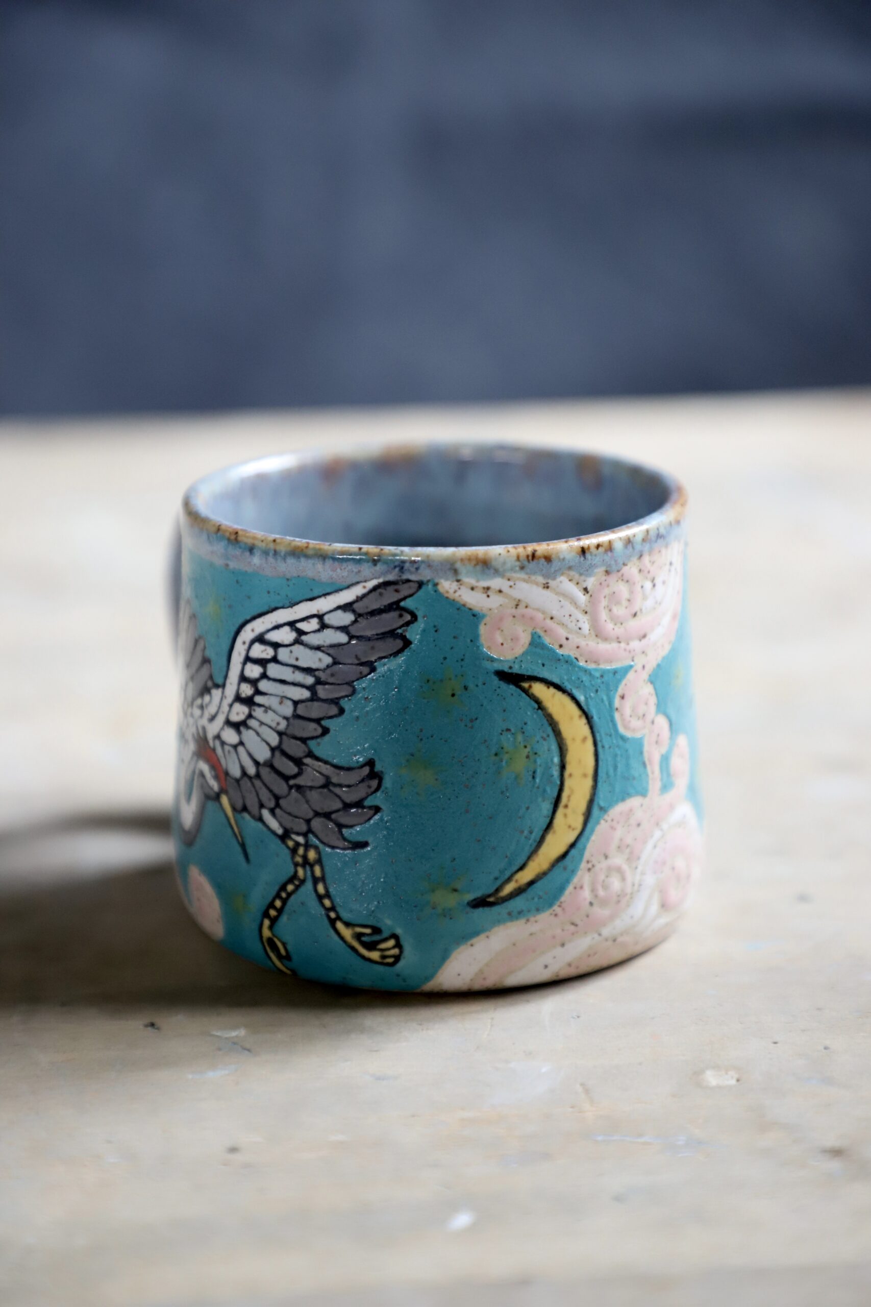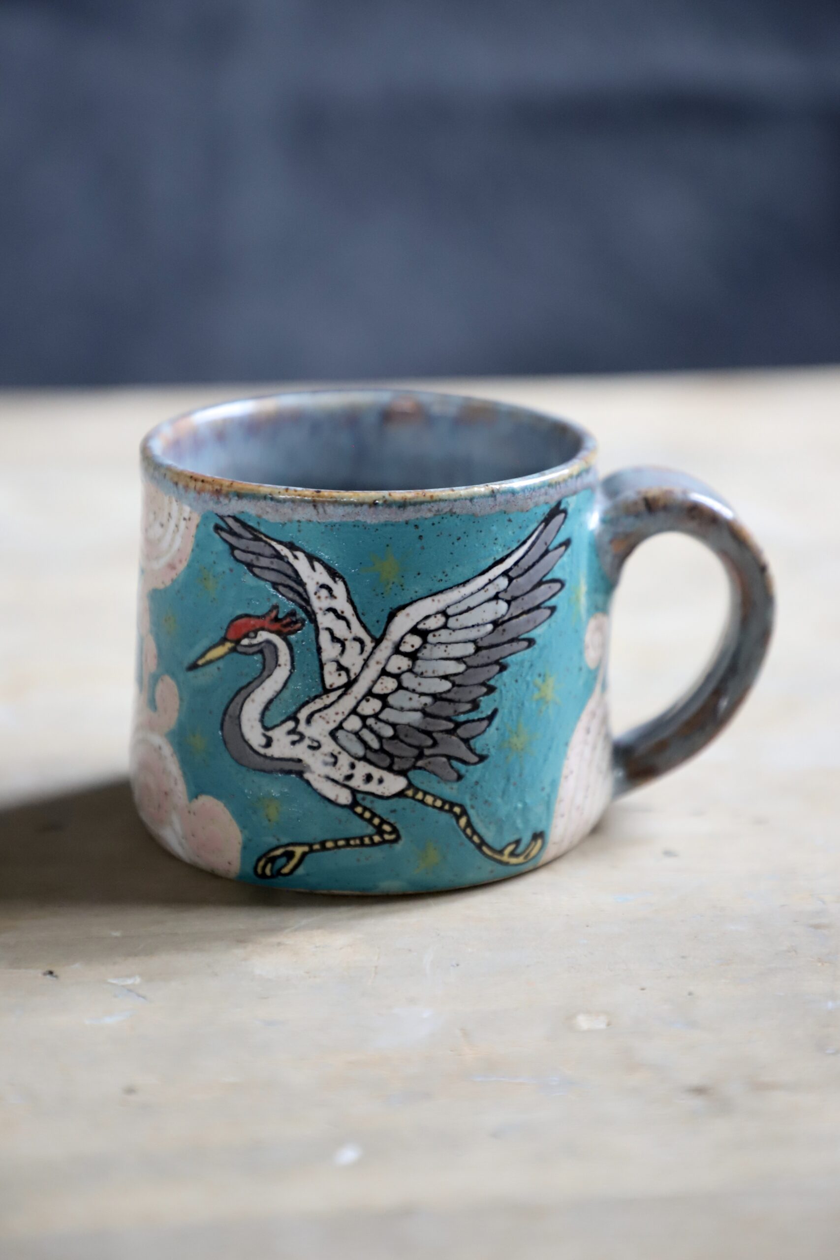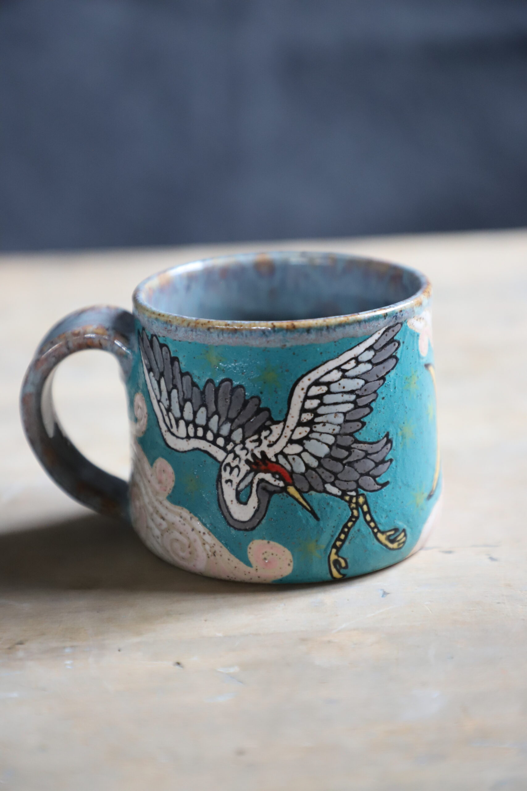 Crane & sunset mug holds 12oz. Handmade with love with joyful hands. Microwave & dishwasher safe. Although handwashing is best for the longevity of handmade pieces.