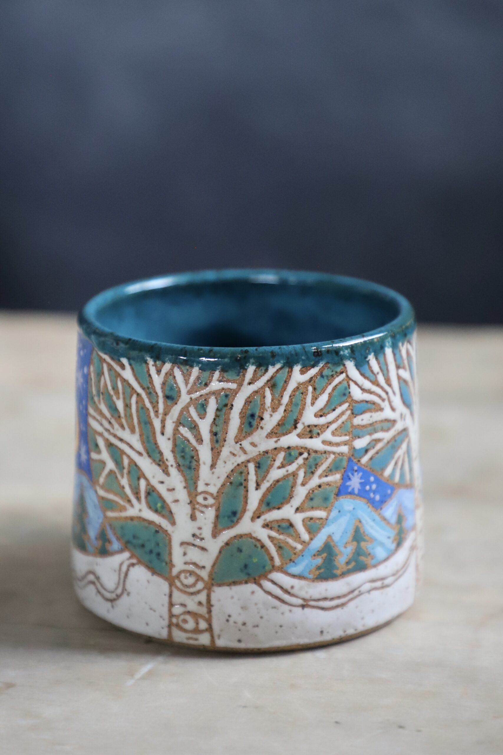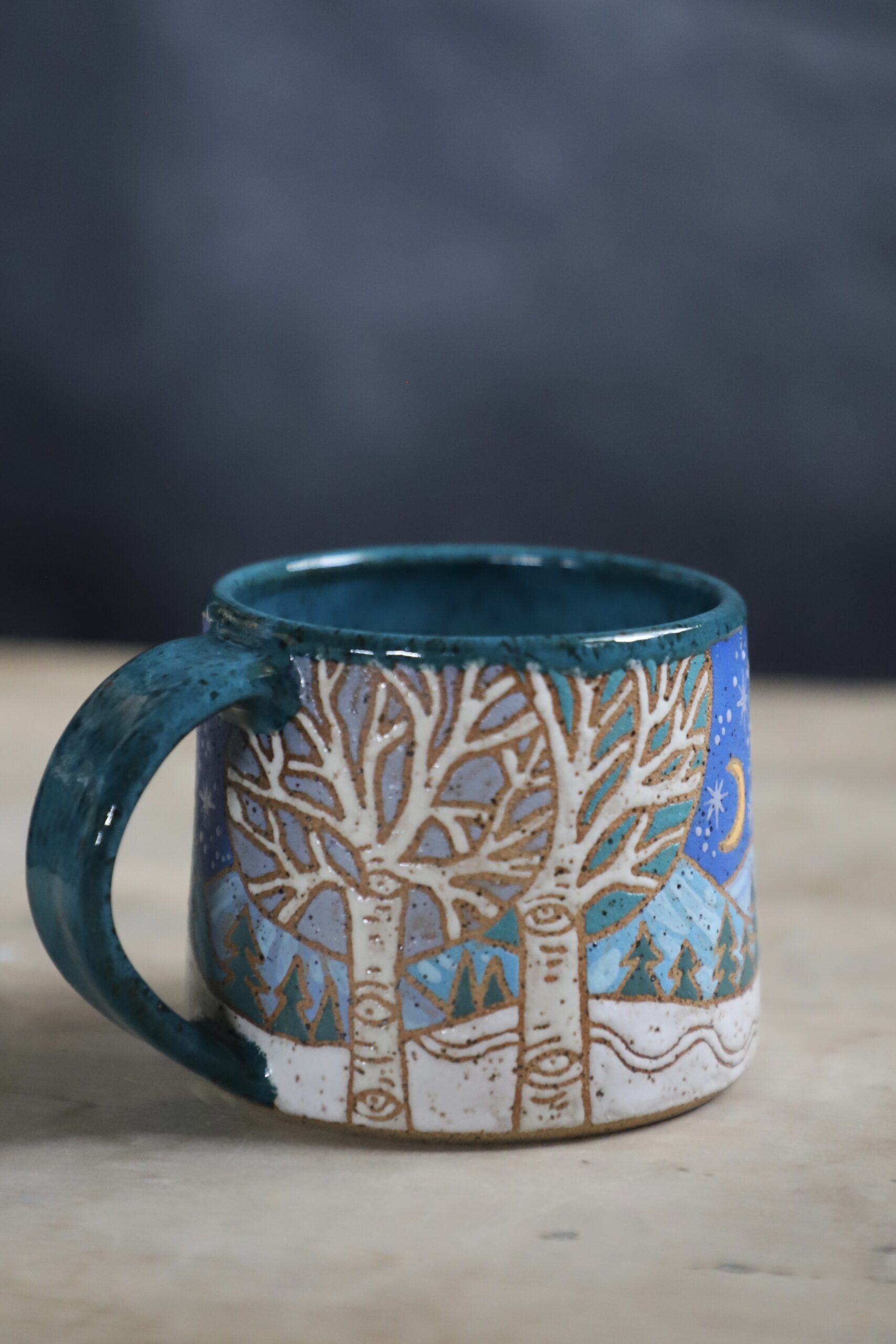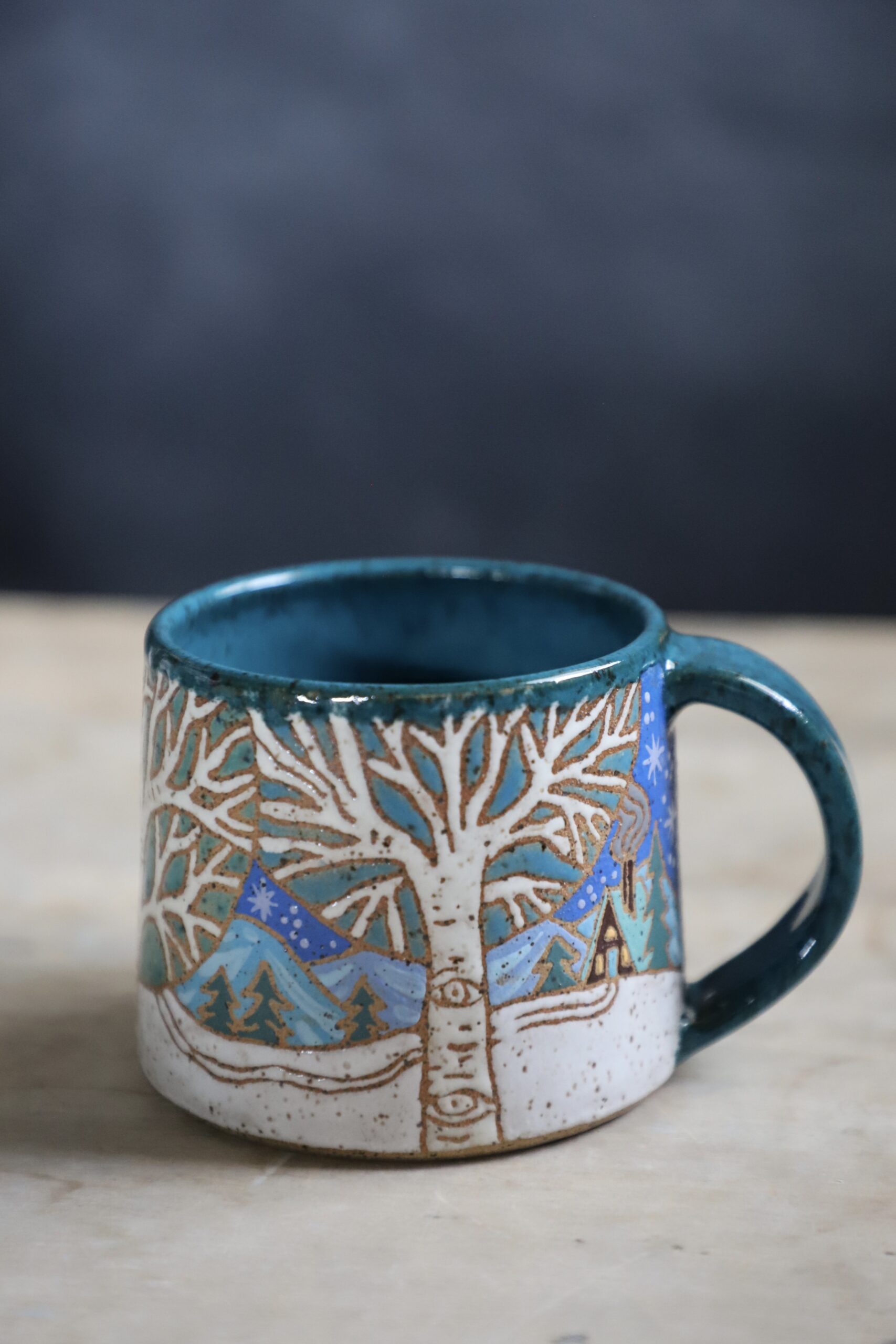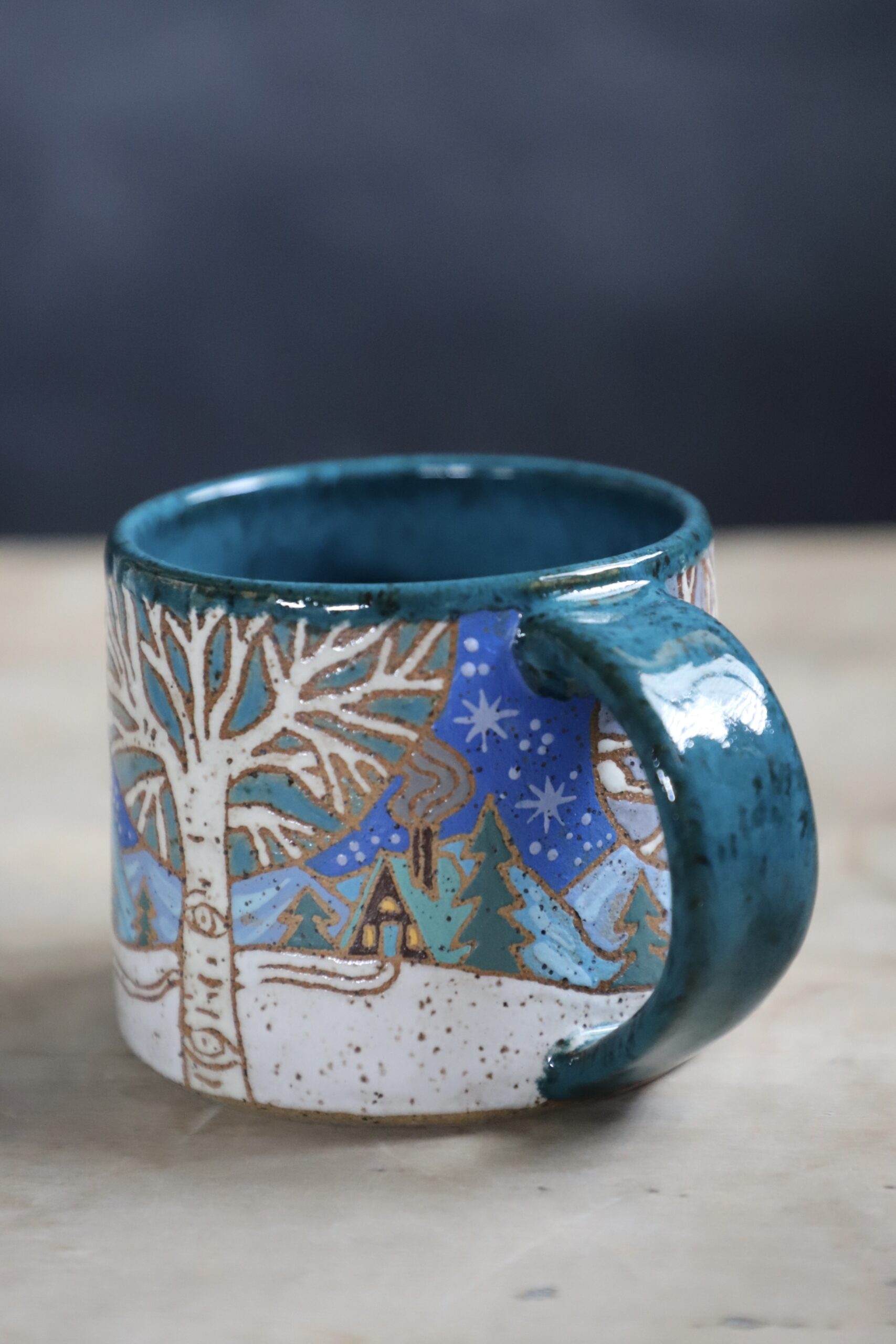Crescent moon & winter cabin mug holds 13oz. From my heART to you, made with joyful hands. Top rack dishwasher & microwave safe. As with any handmade item handwashing is best to ensure longevity.