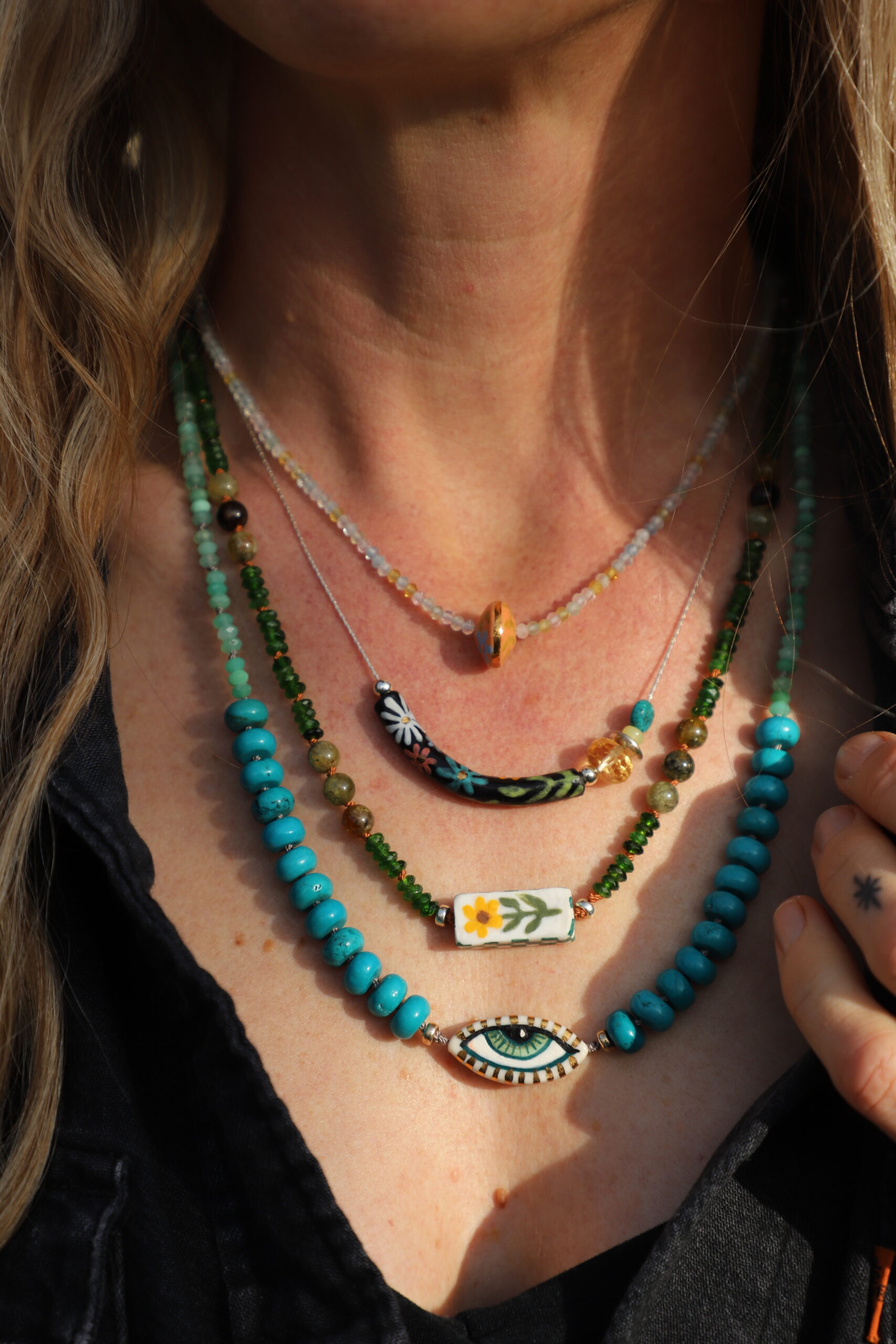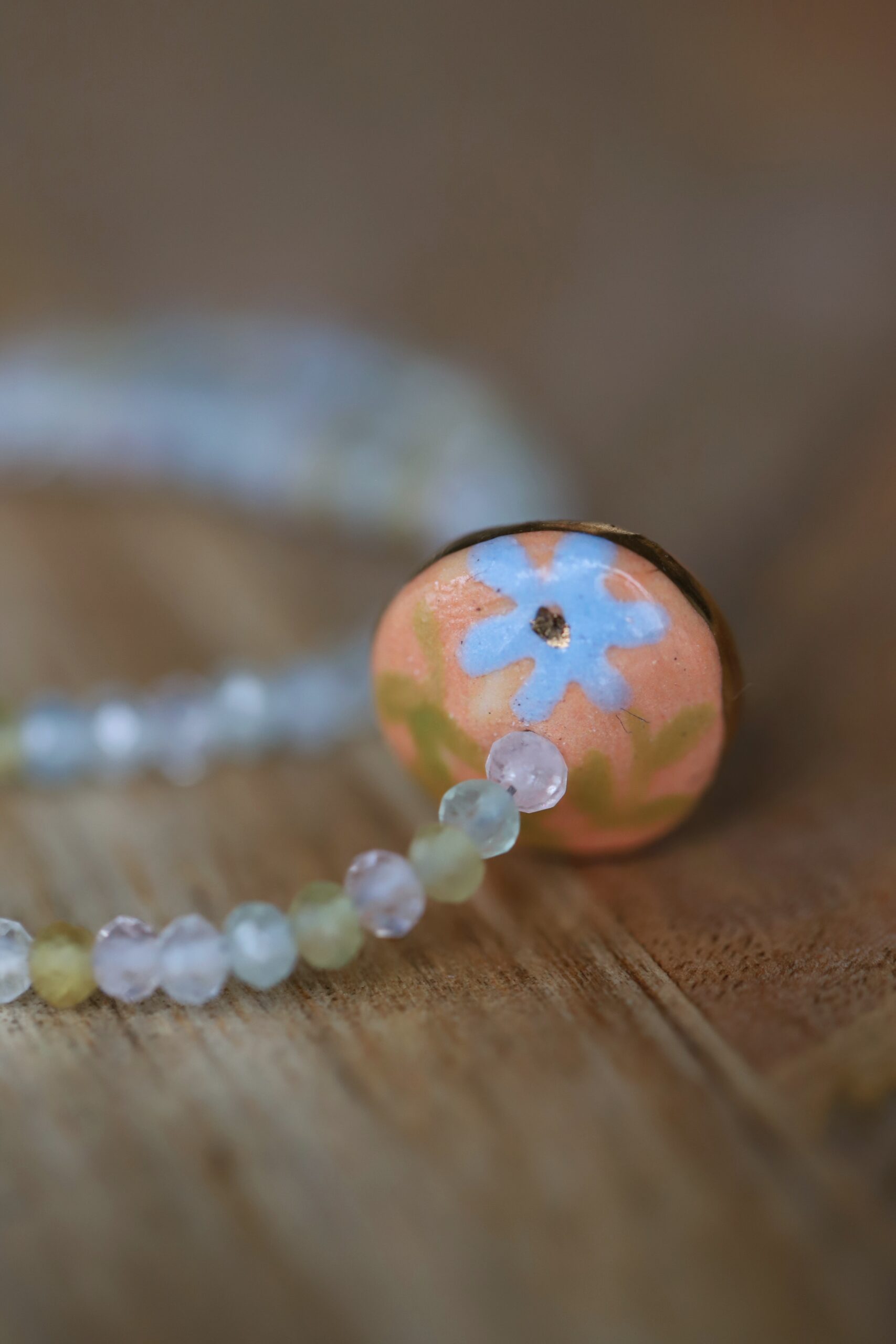 Porcelain, hand painted bead and semi precious stones. Necklace is strung on wire with high grade faceted aquamarine. Measures 8″ bead measures .5″ Hand made with love & joyful hands.