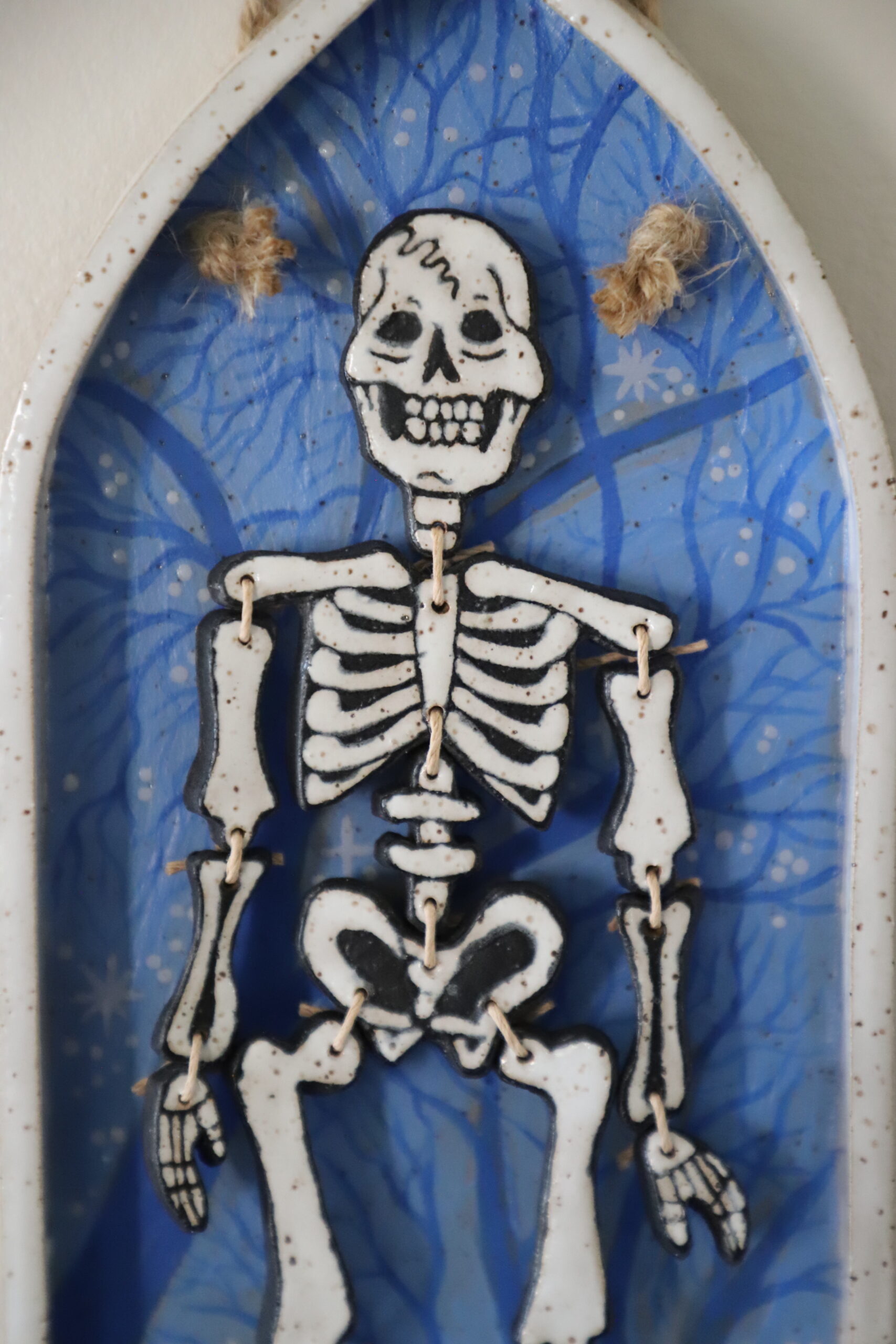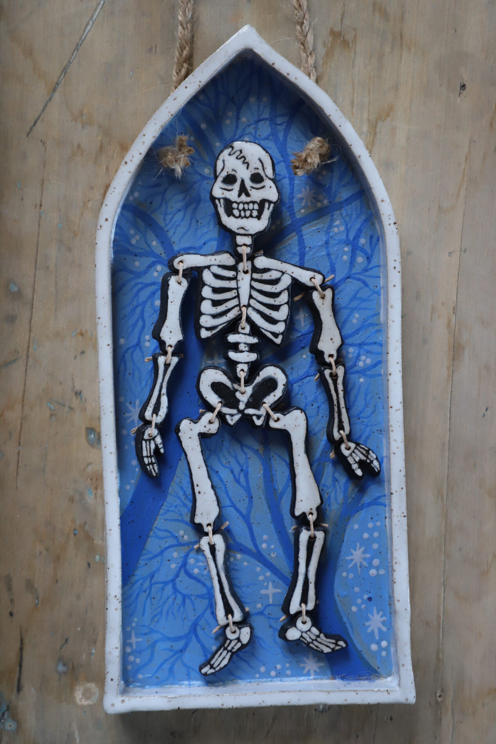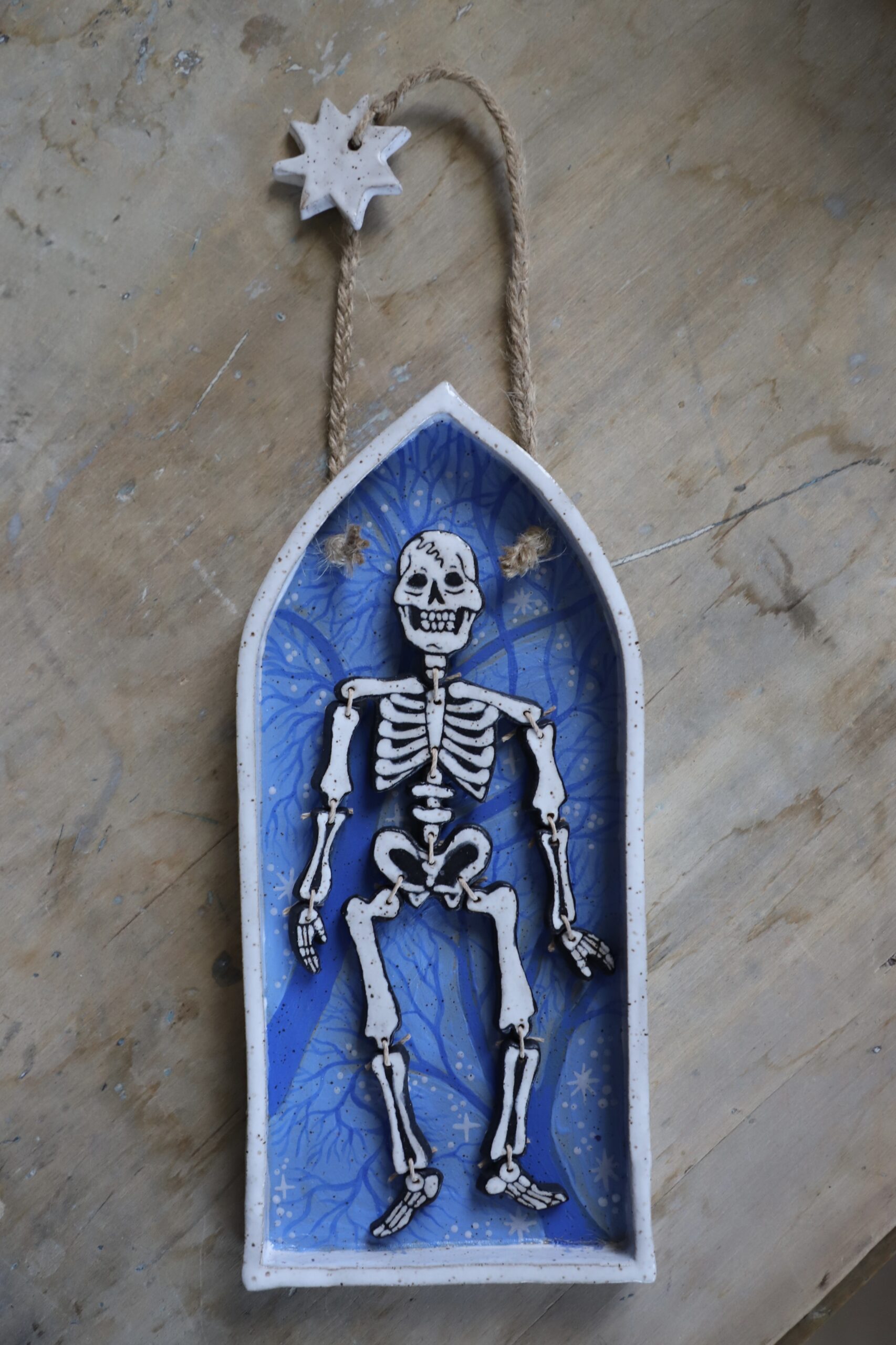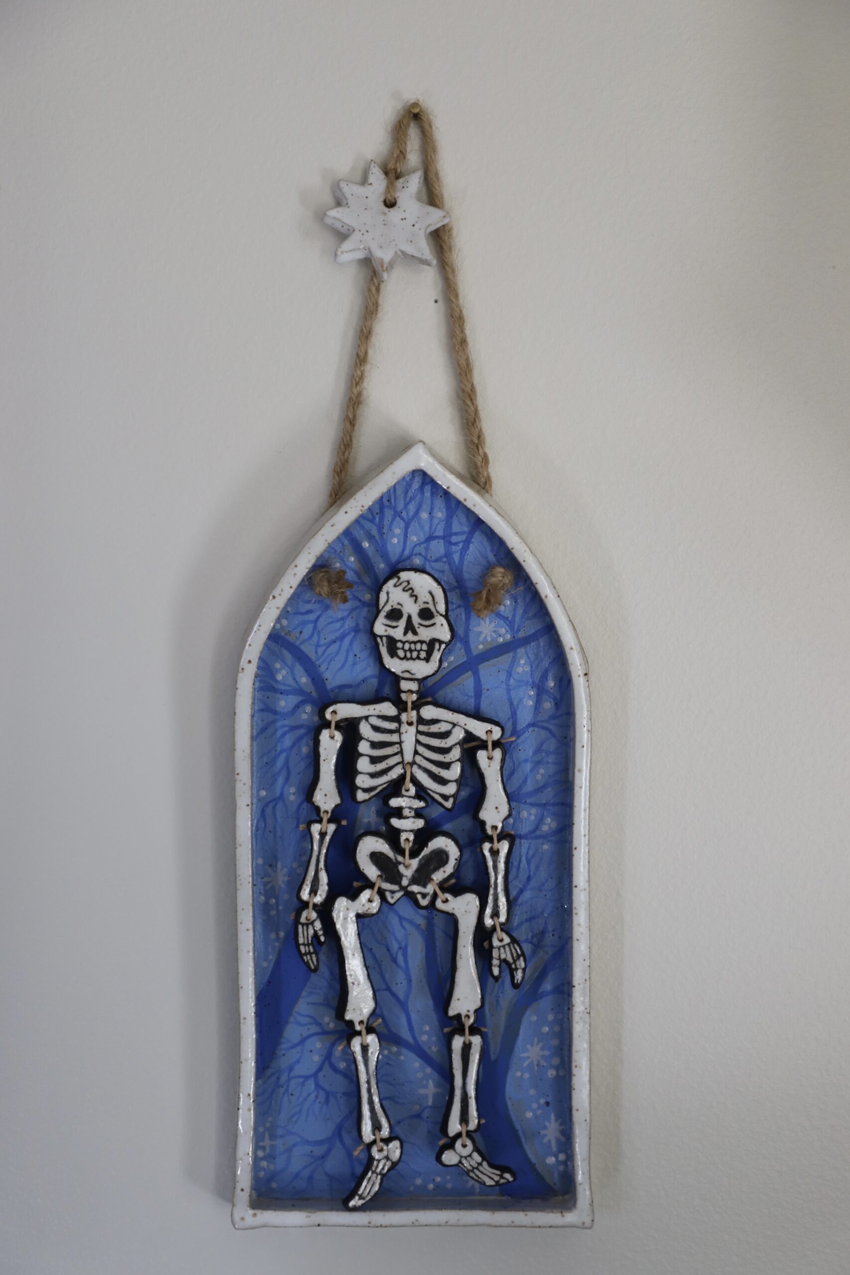 Dancing skeleton measures 11″x5″ 1″ deep. Hangs from braided cord with star detail. Made by joyful hands.