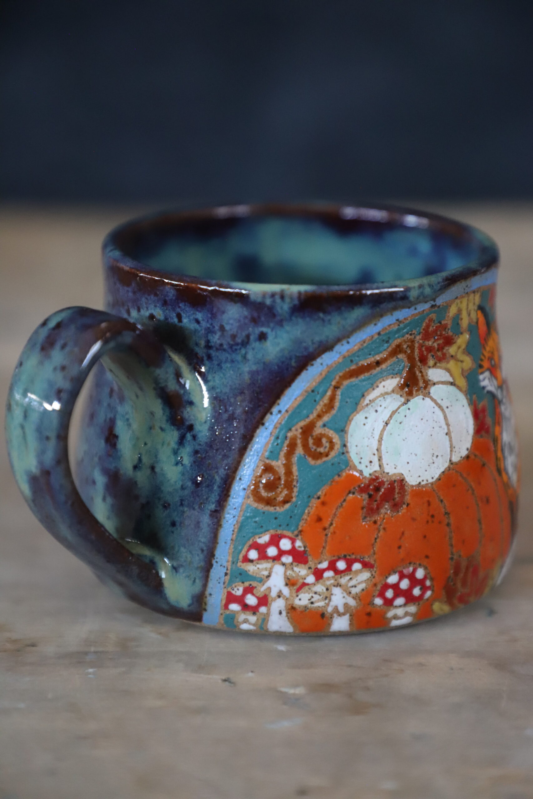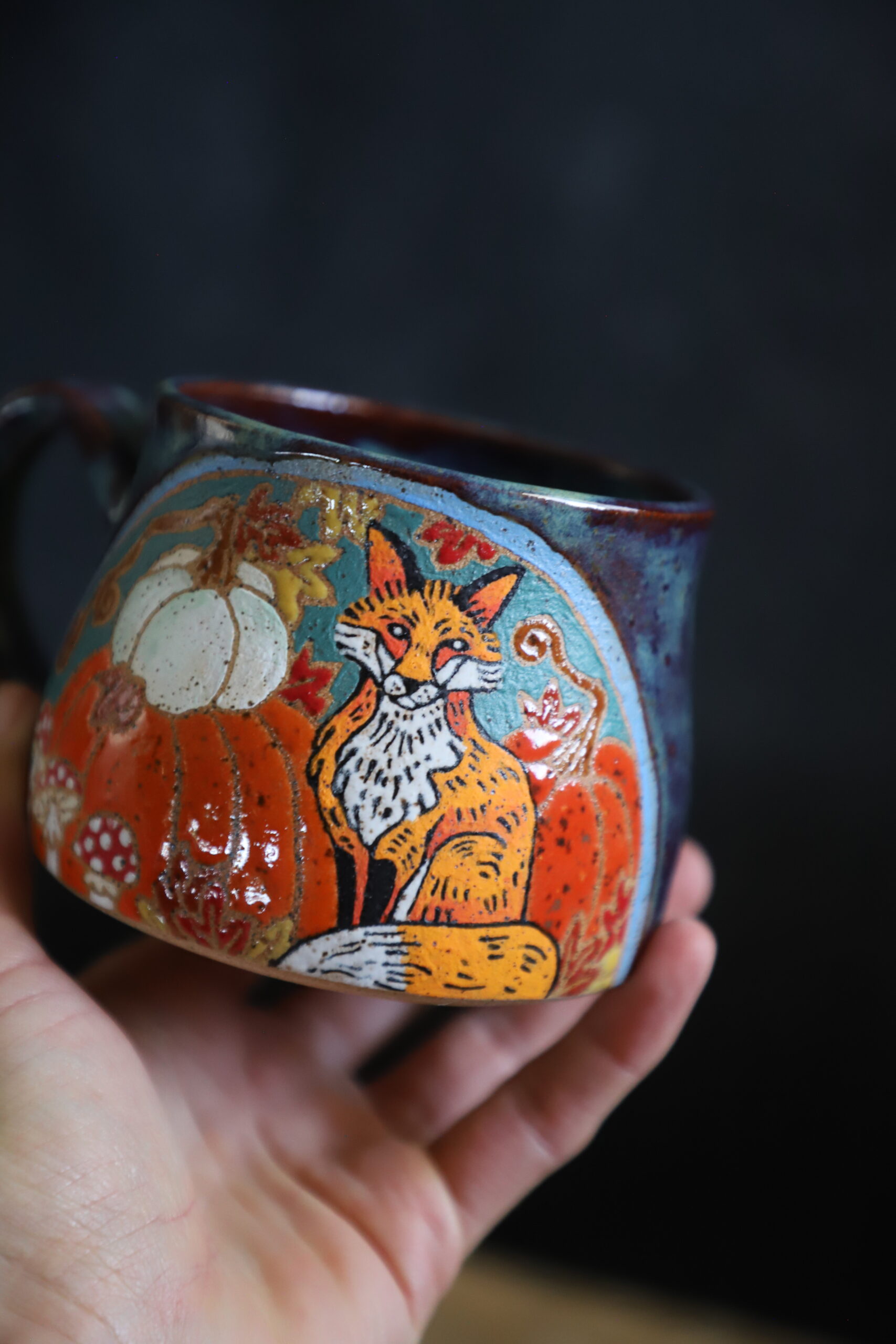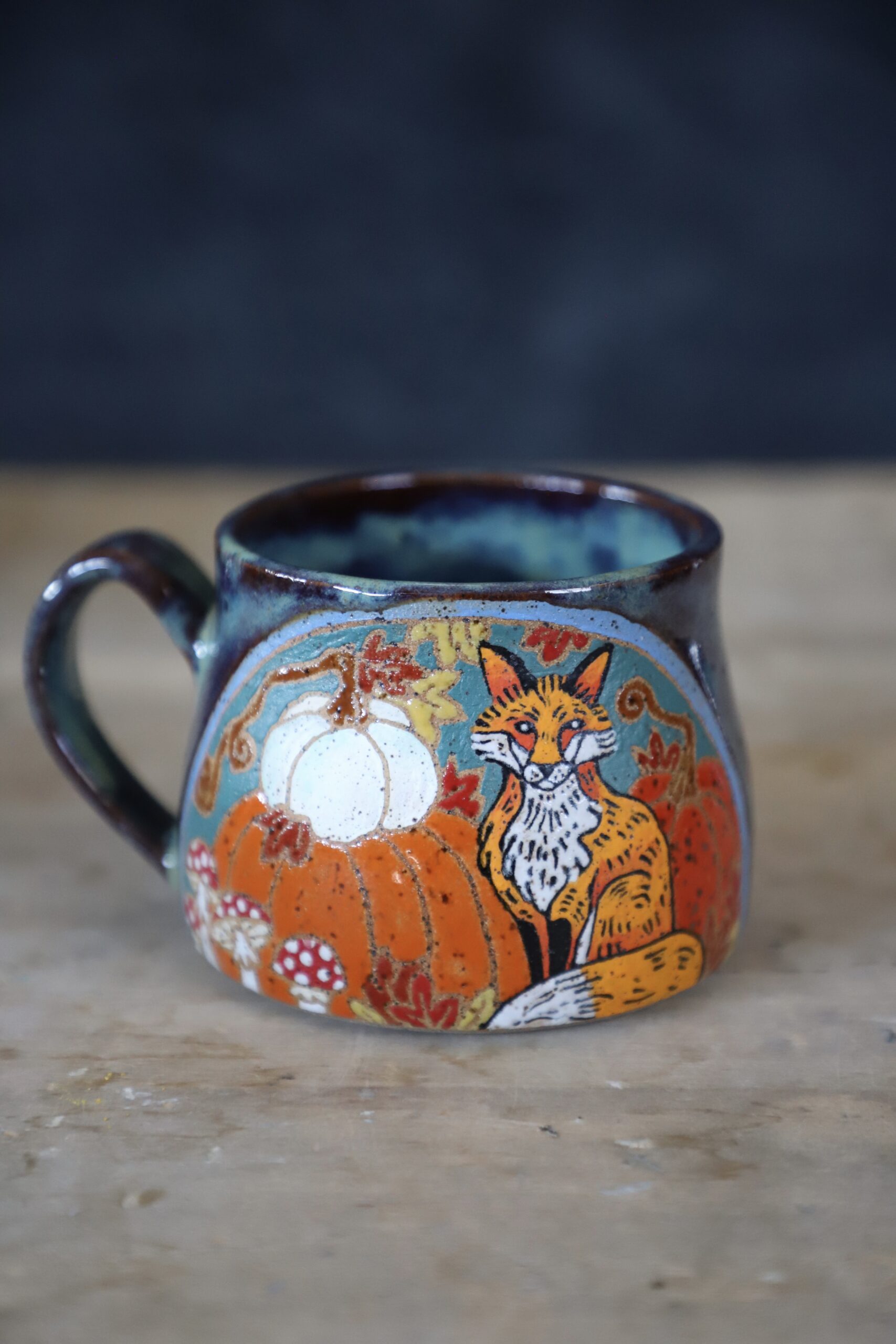 Fall fox mug holds 16oz. Made by joyful hands with love. With all handmade goods handwashing is best. Top rack dishwasher and microwave safe.