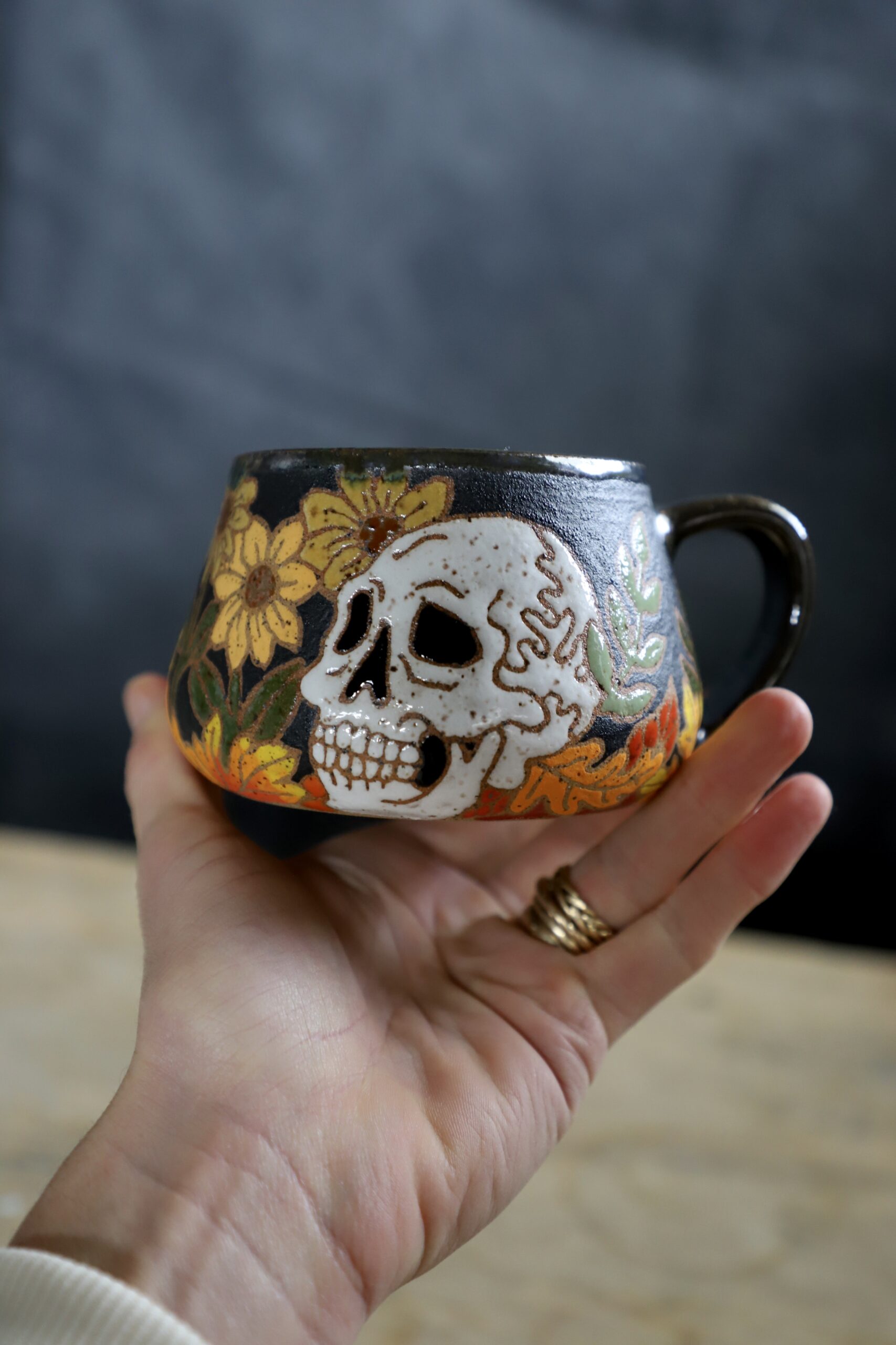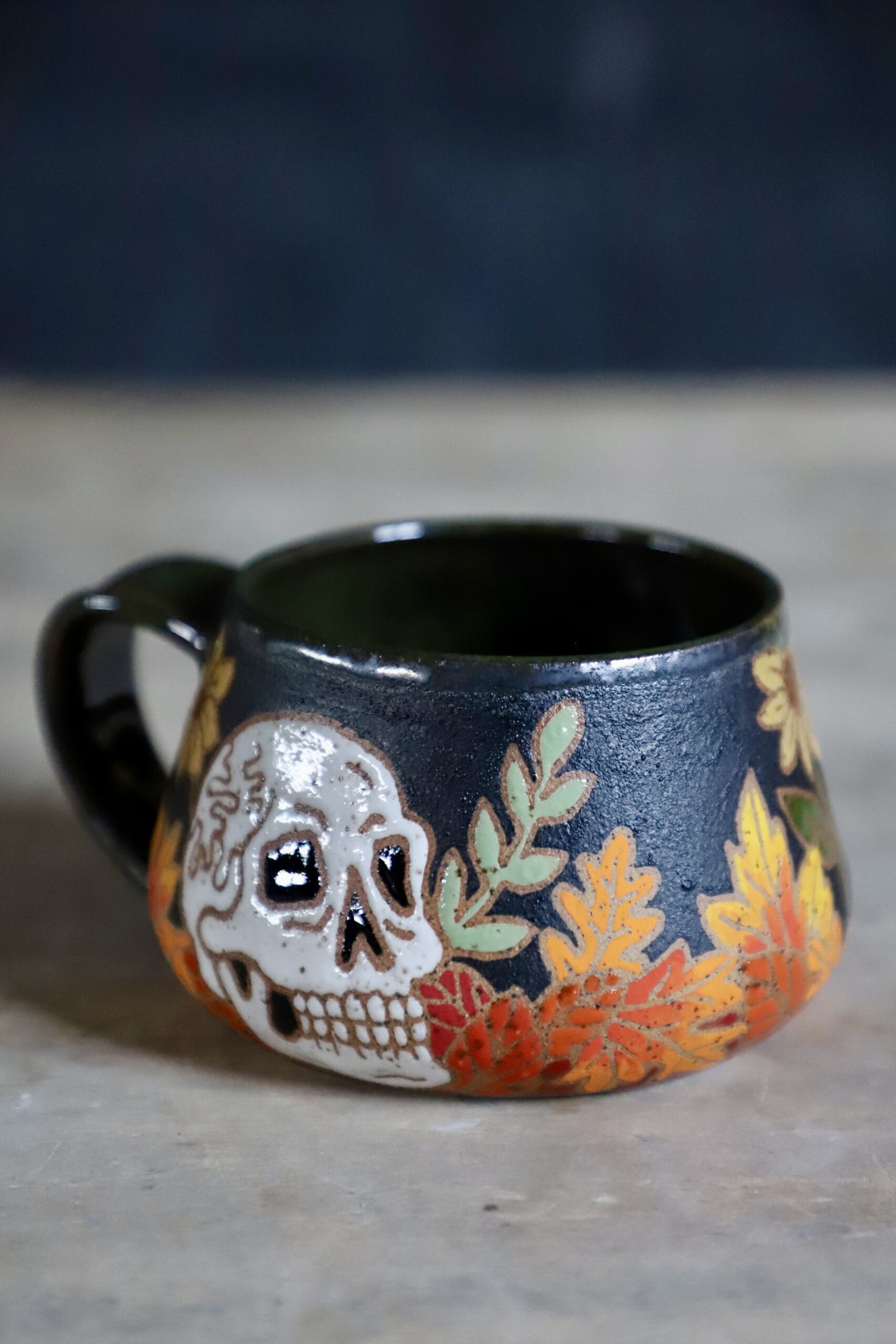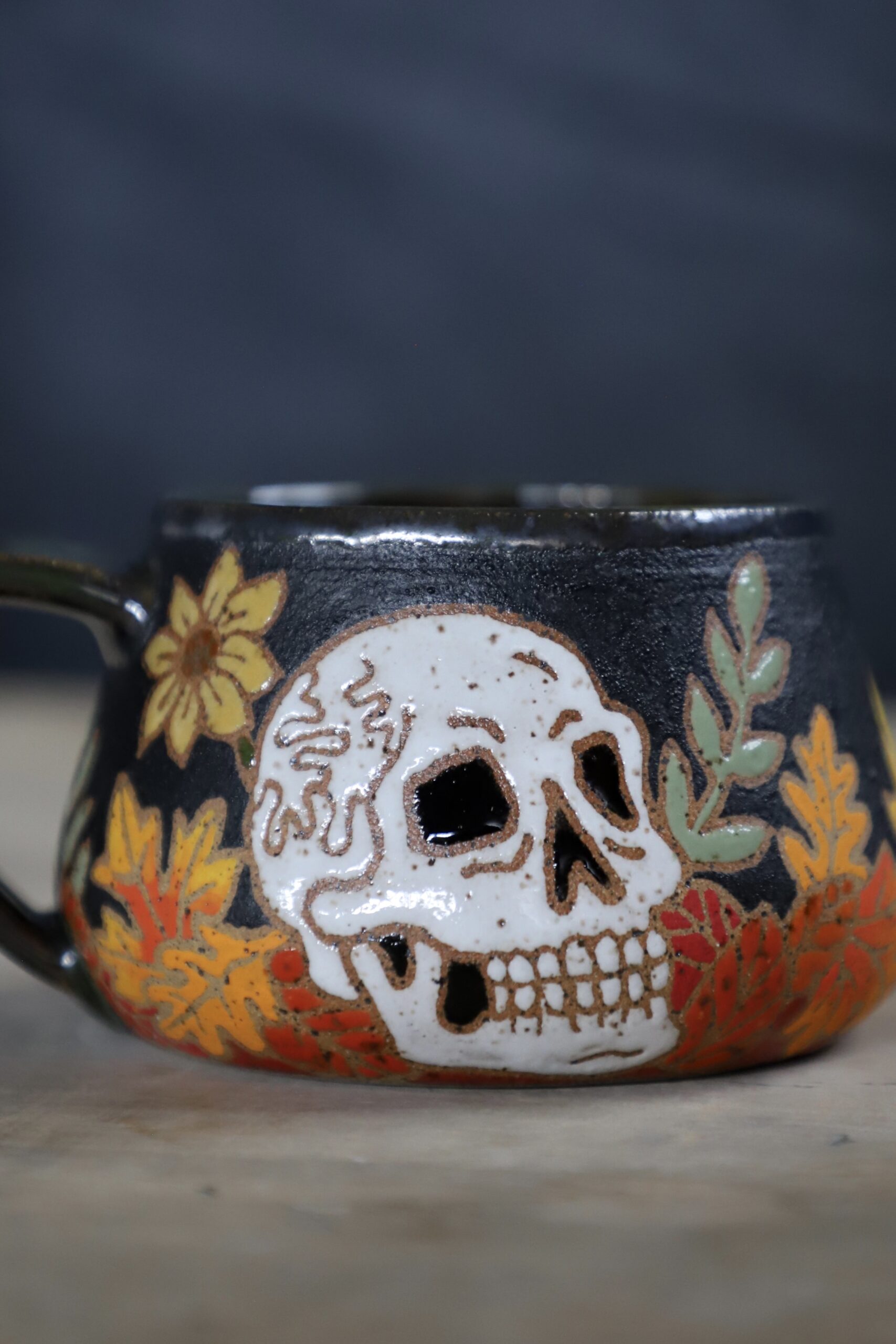 Fall skull mug holds 14oz. From my heART to you, made with joyful hands. Top rack dishwasher & microwave safe. Handwashing is always best for handmade goods.