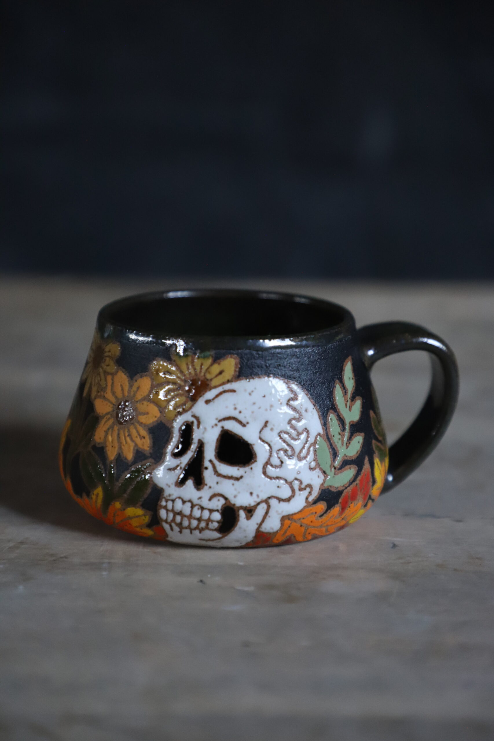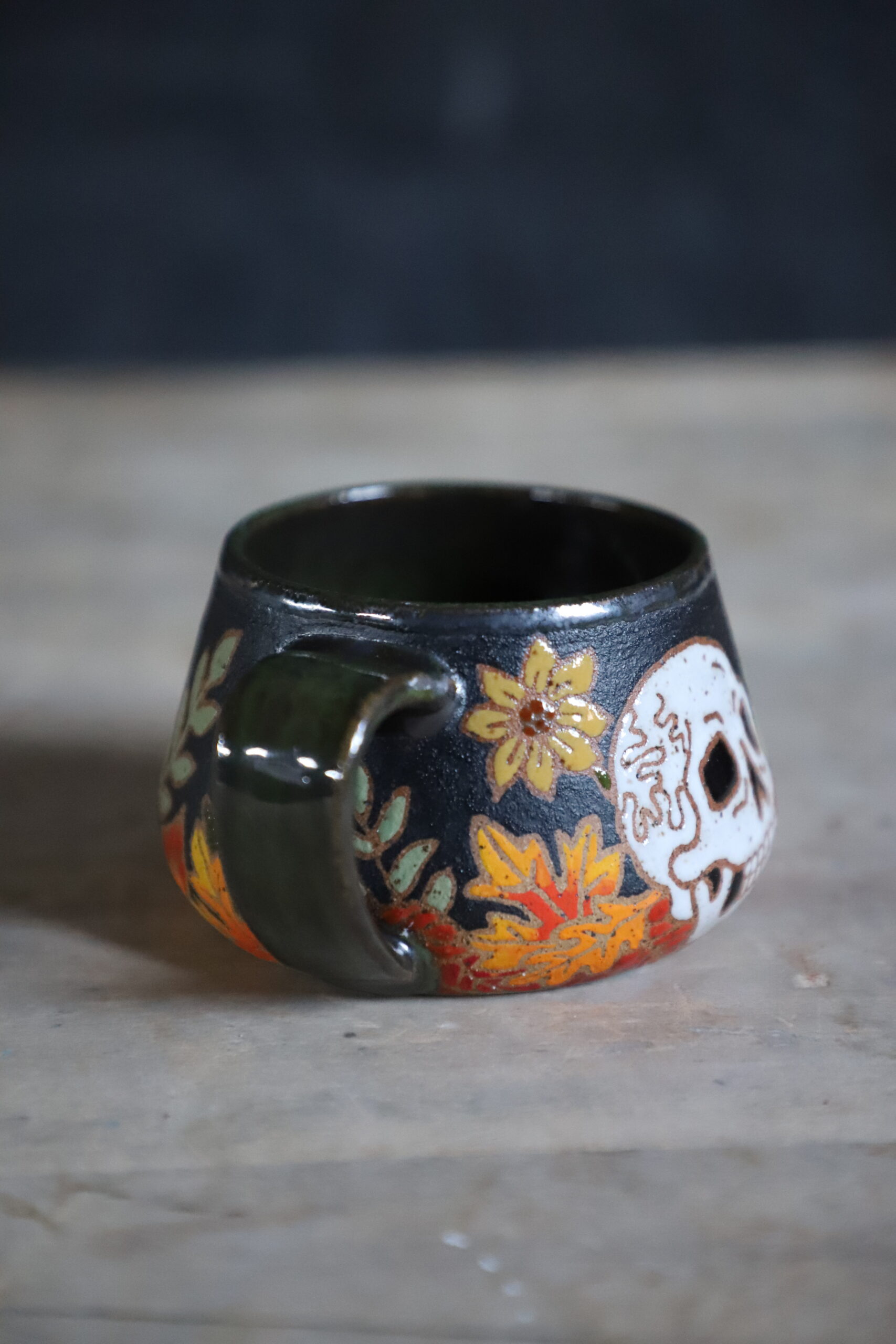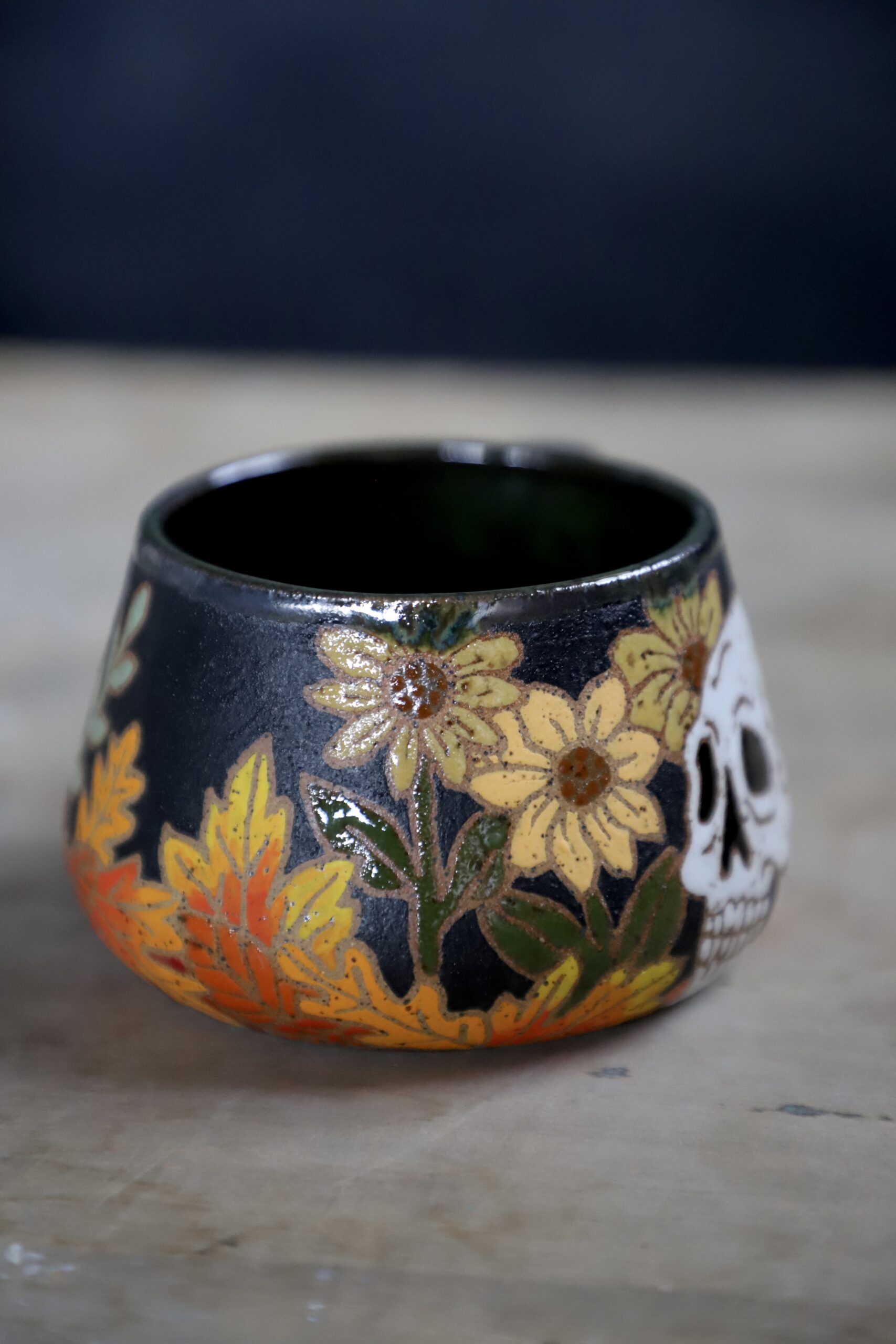 Fall skull mug holds 14oz. From my heART to you, made with joyful hands. Top rack dishwasher & microwave safe. Handwashing is always best for handmade goods.