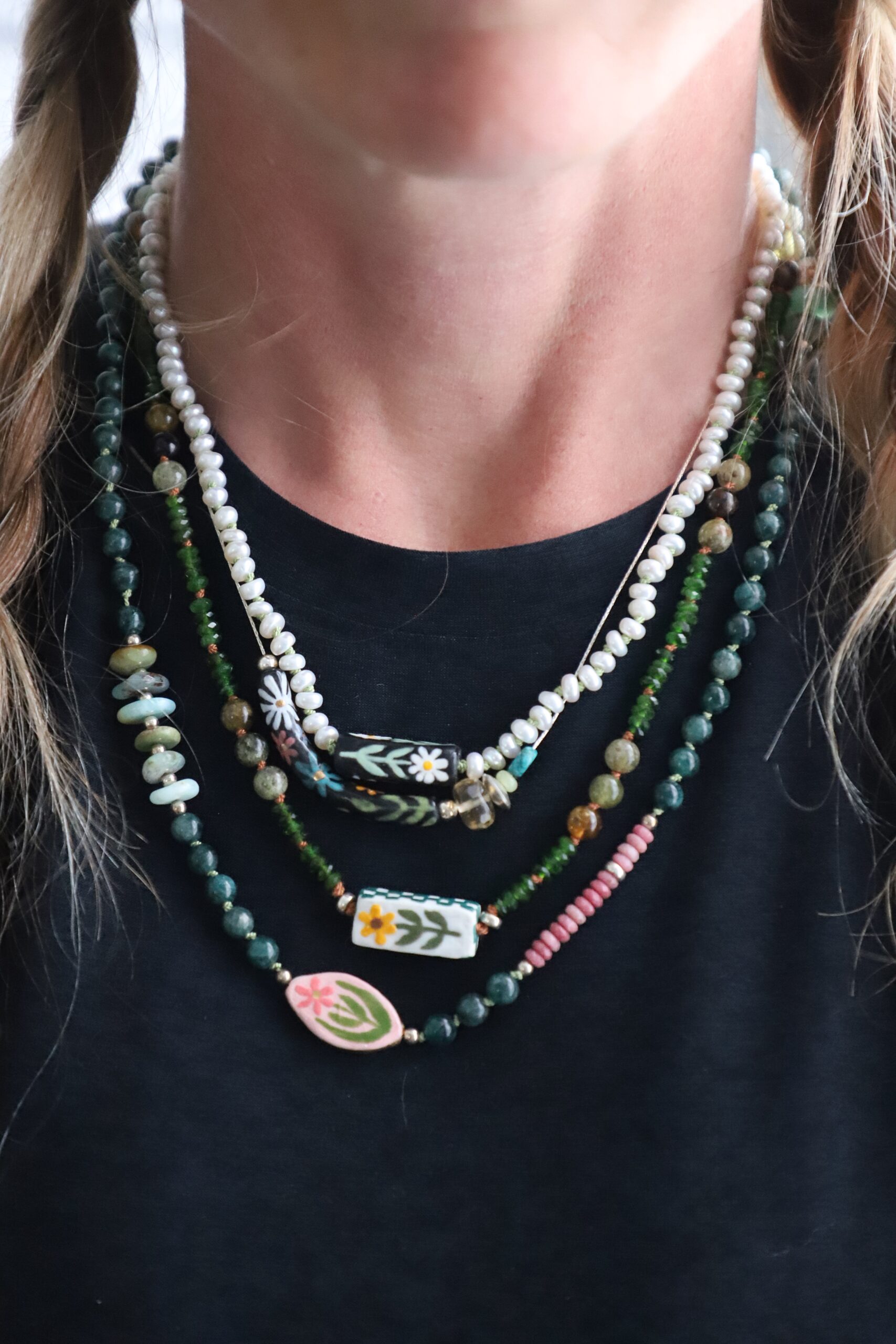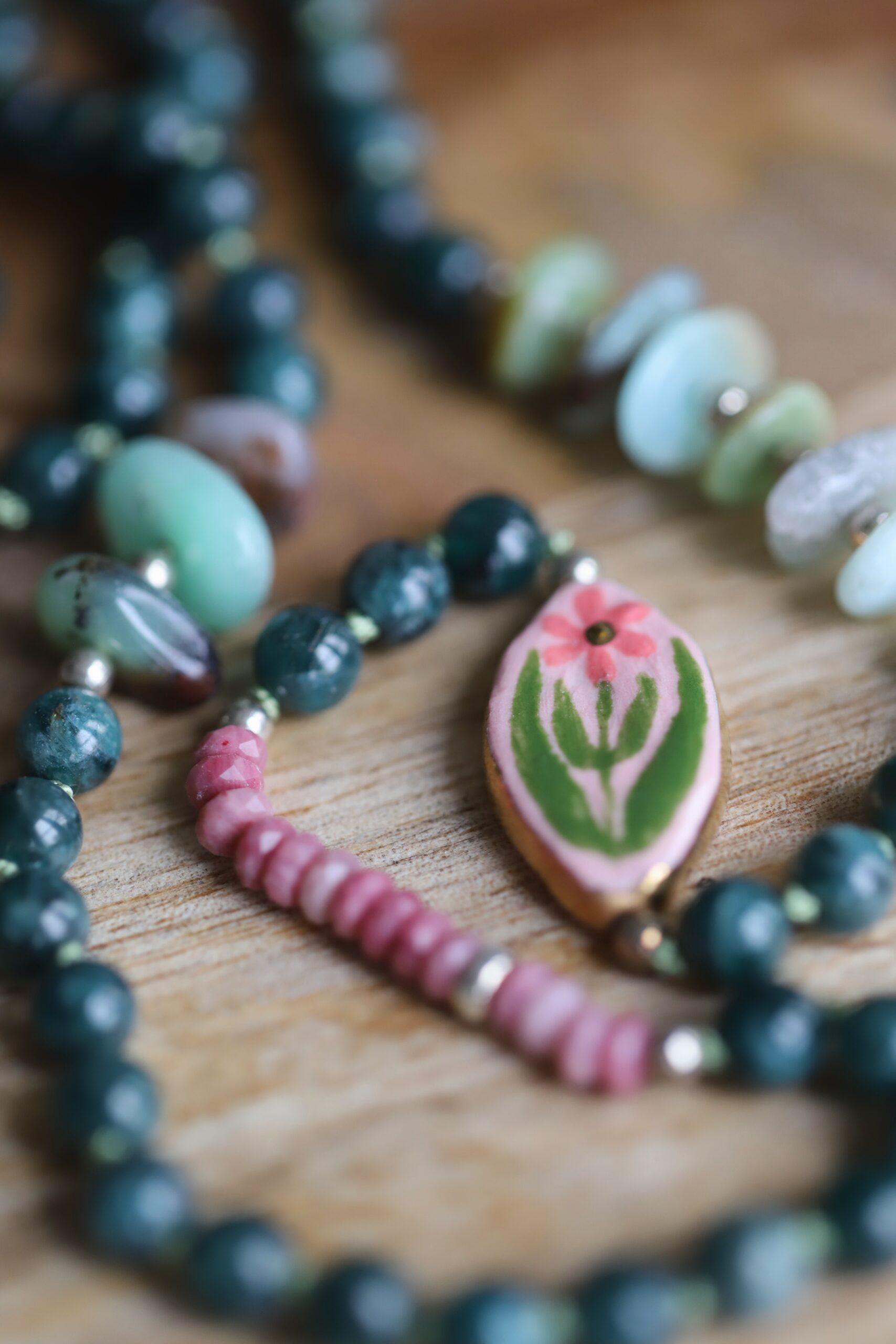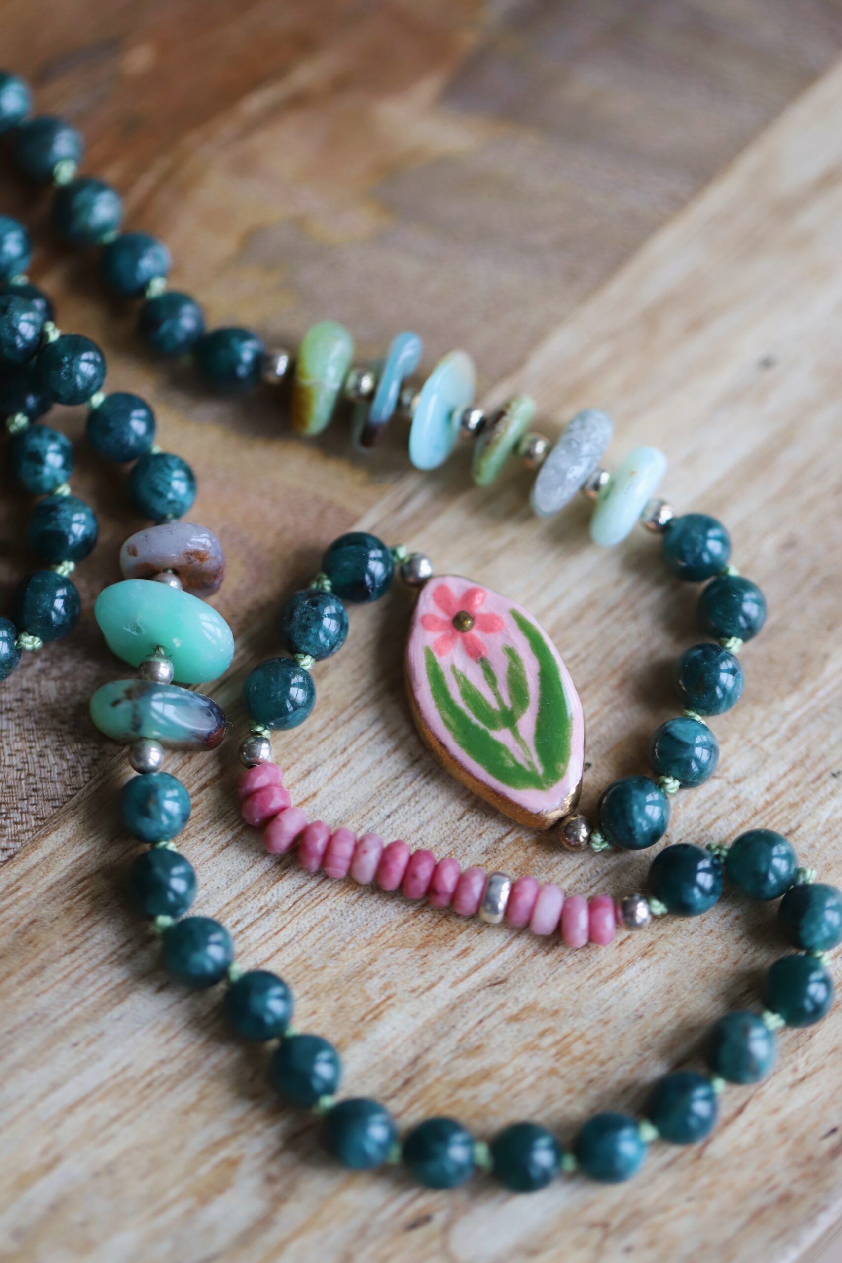 Porcelain, hand painted bead and semi precious stones. Necklace is strung on silk with rhodochrosite, chrysoprase and teal green kyanite. Measures 11″ bead measures 1″ Hand made with love & joyful hands. Be mindful not to snag or pull silk strung jewelry.