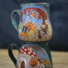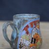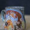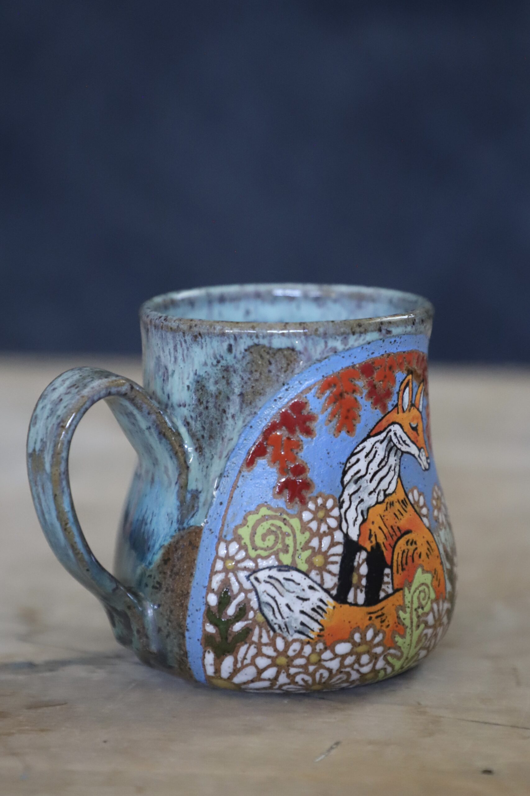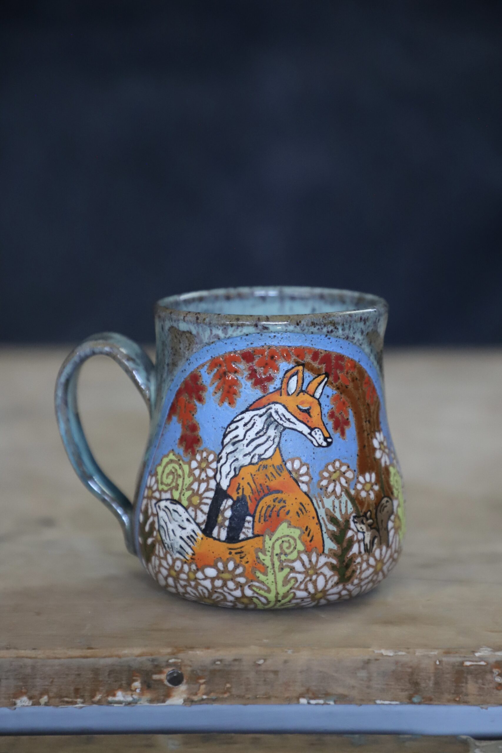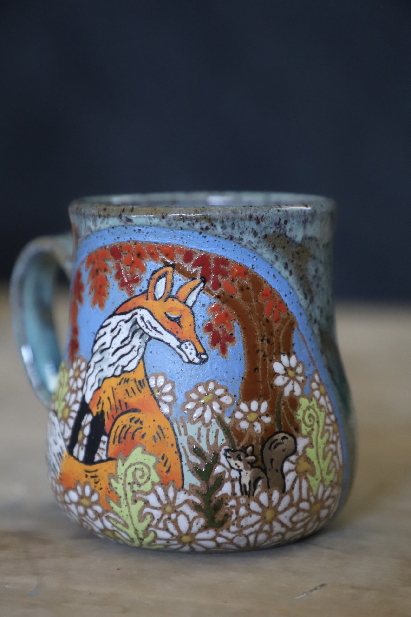 Fox & squirrel mug holds 18oz. Handwashing is always preferred for handmade items. Microwave & top rack dishwasher safe.