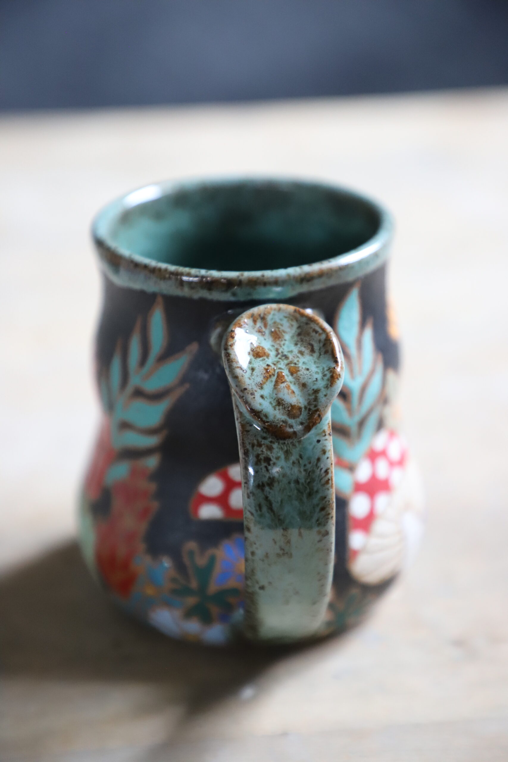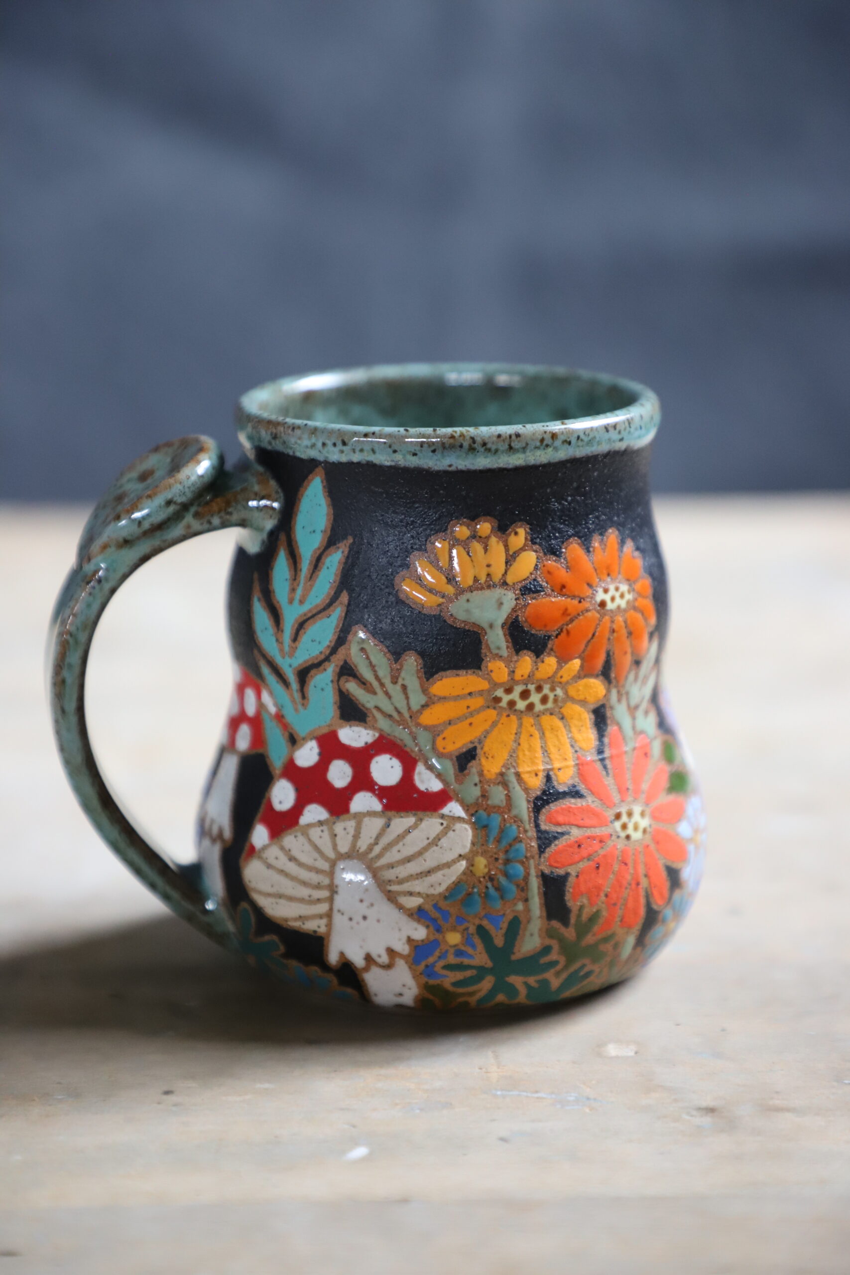 Fungi garden mug holds 14oz. Handmade with love with joyful hands. Microwave & dishwasher safe. Although handwashing is best for the longevity of handmade pieces.