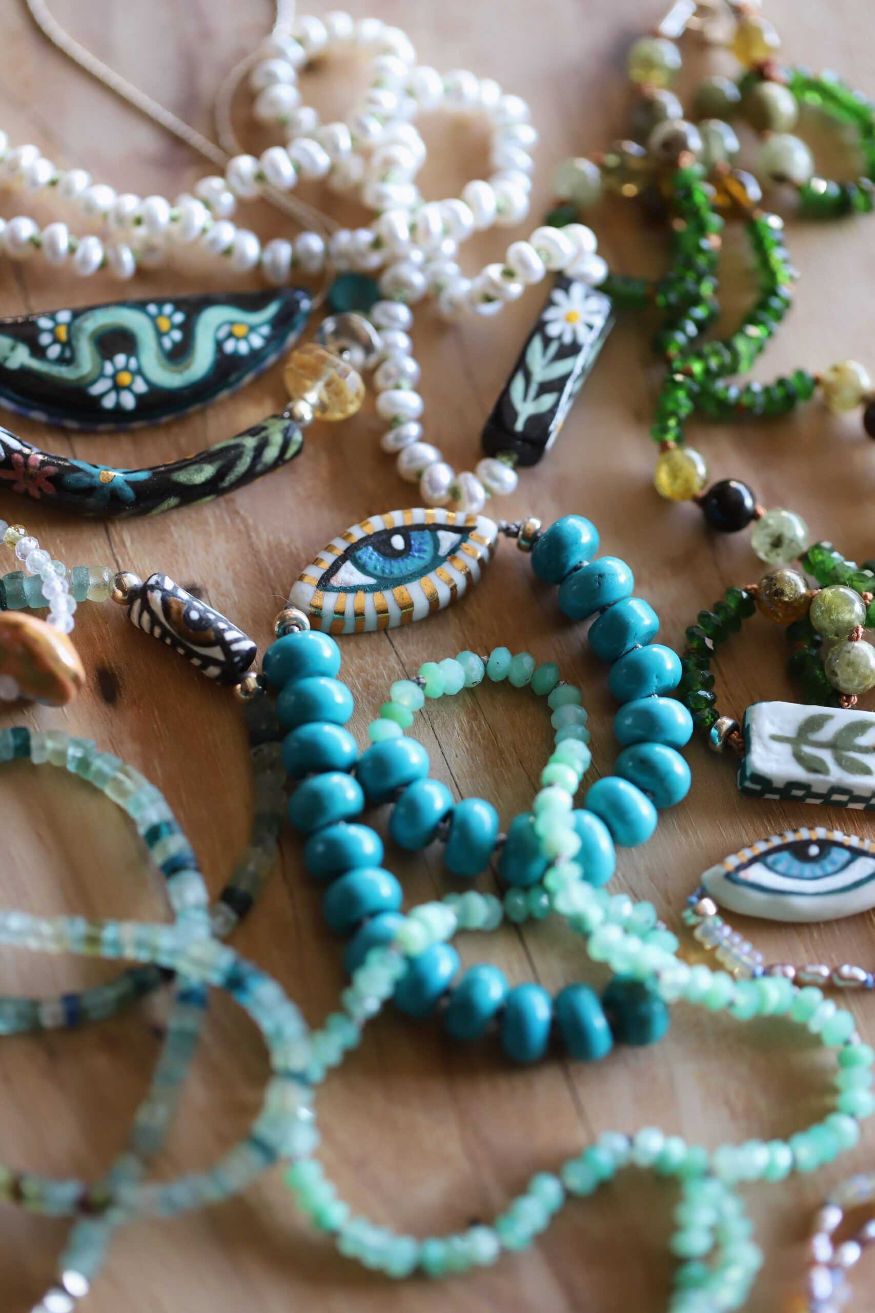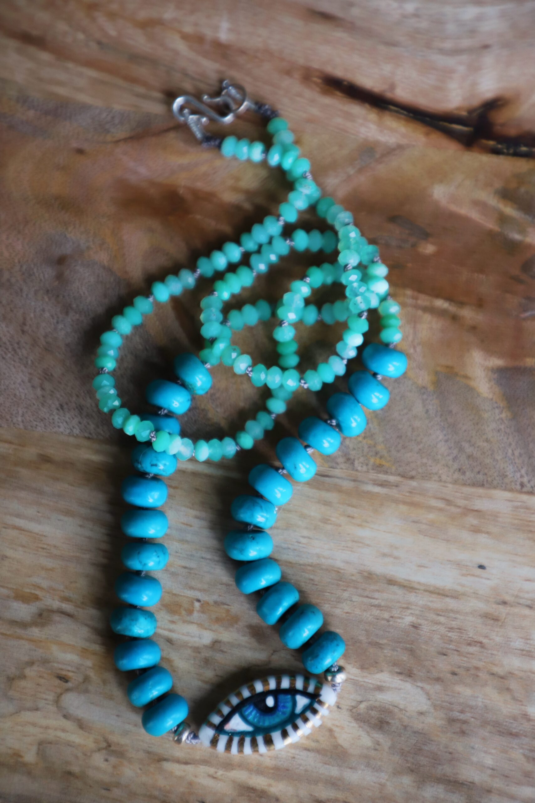 Porcelain, hand painted bead and semi precious stones. Necklace is strung on silk with bright blue turquoise and glowing chrysoprase. Measures 11″ bead measures 1″ Hand made with love & joyful hands. Be mindful not to snag or pull when wearing silk jewelry.