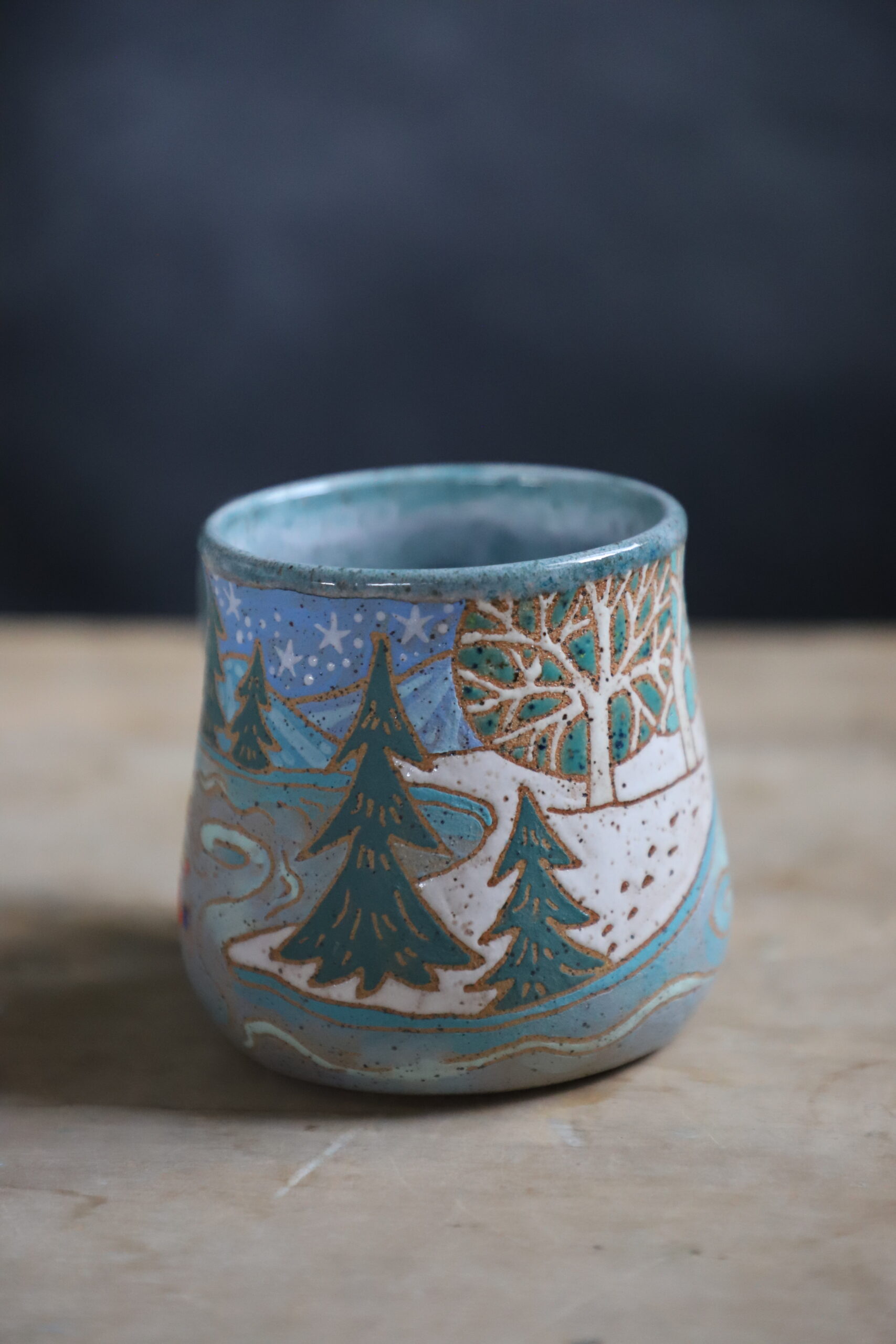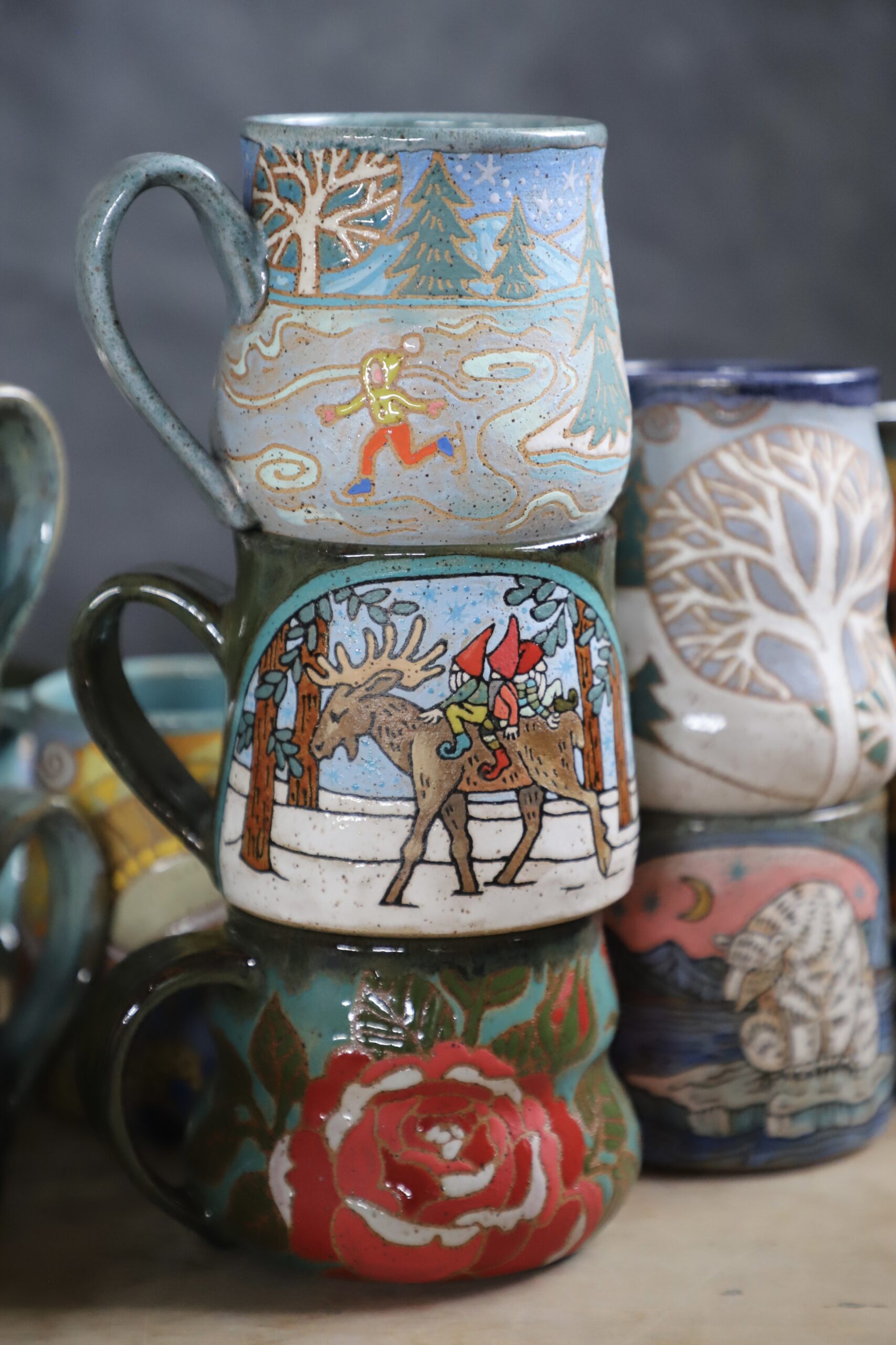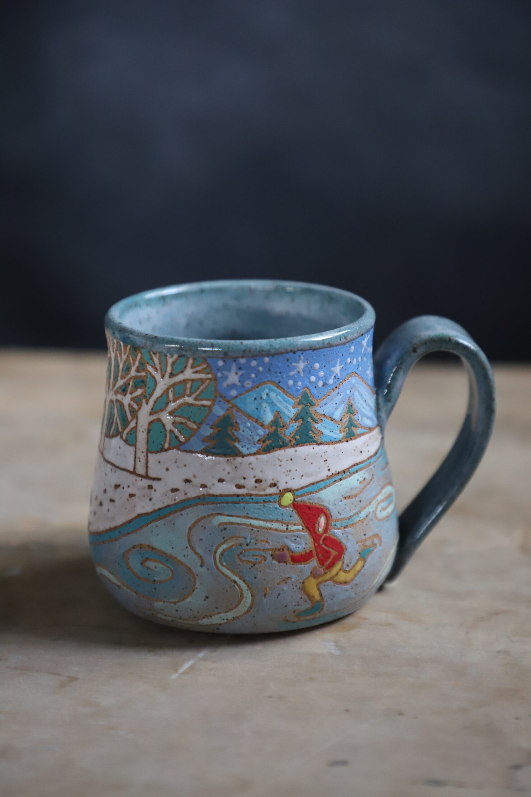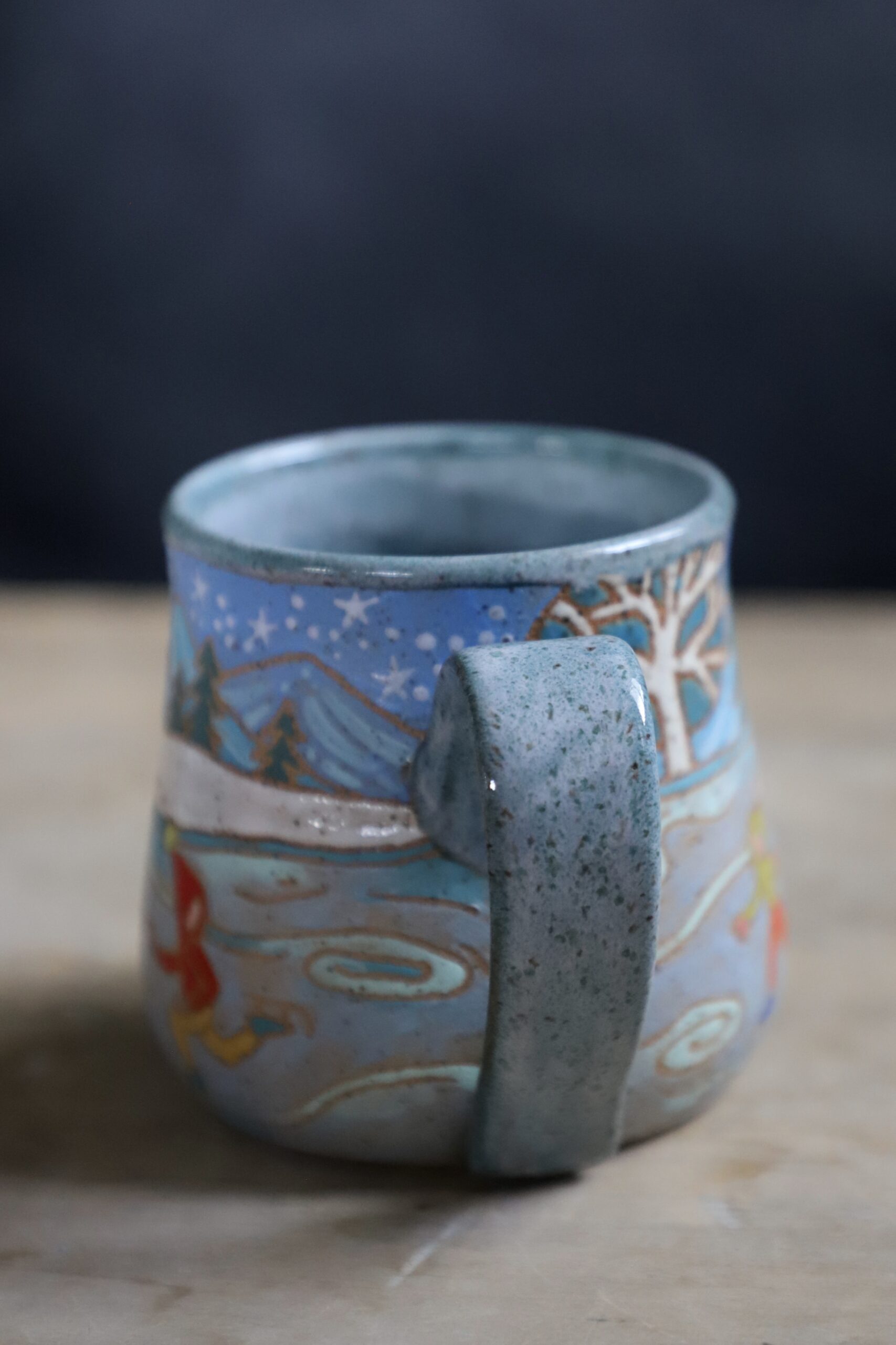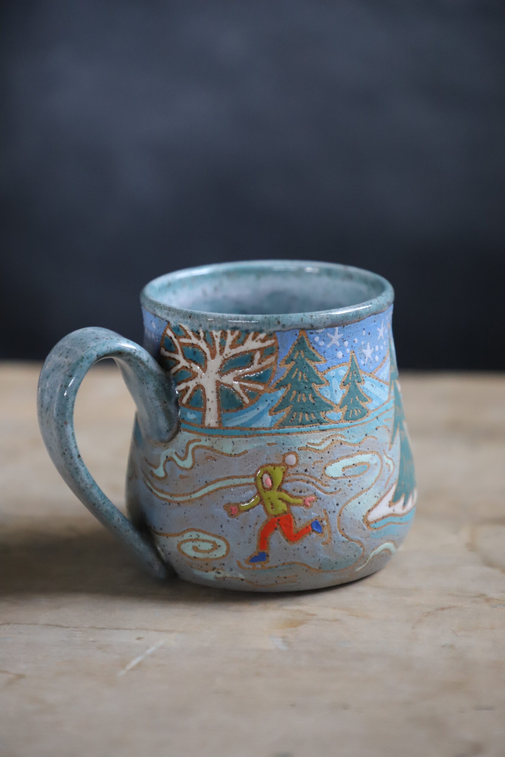 Ice skate mug holds 15.5oz. From my heART to you, made with joyful hands. Top rack dishwasher & microwave safe. As with any handmade item handwashing is best to ensure longevity.