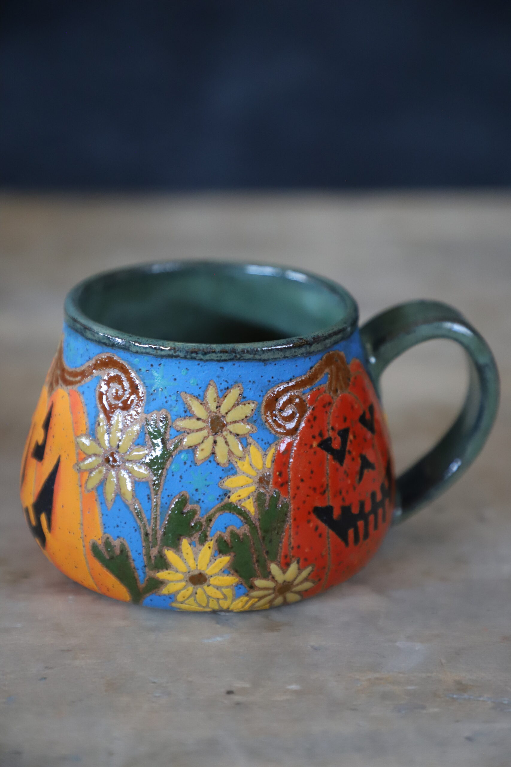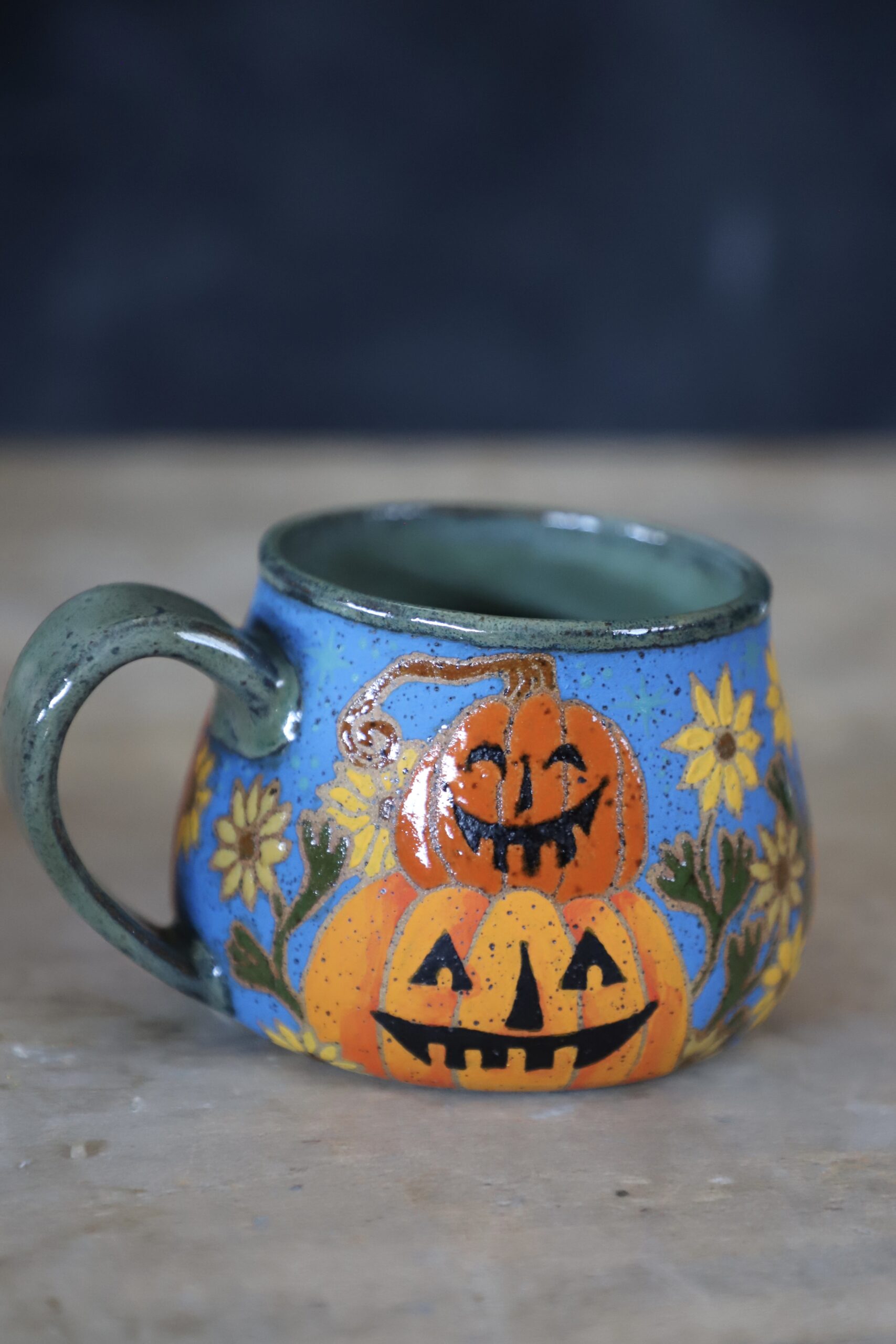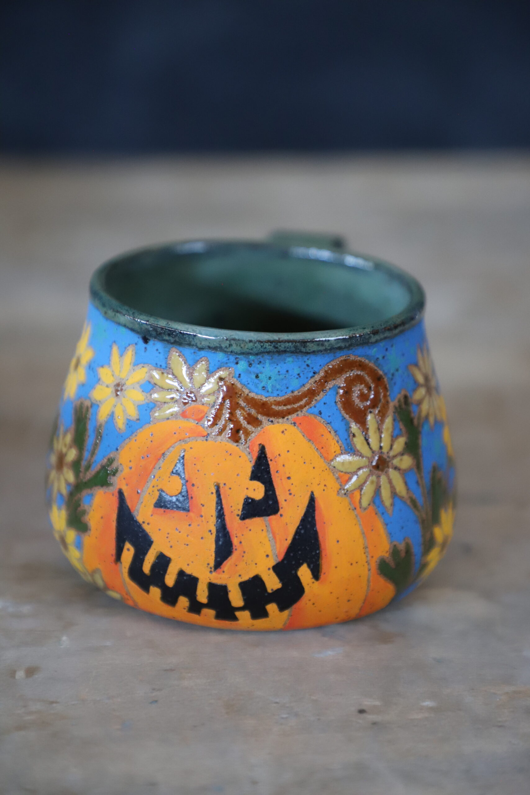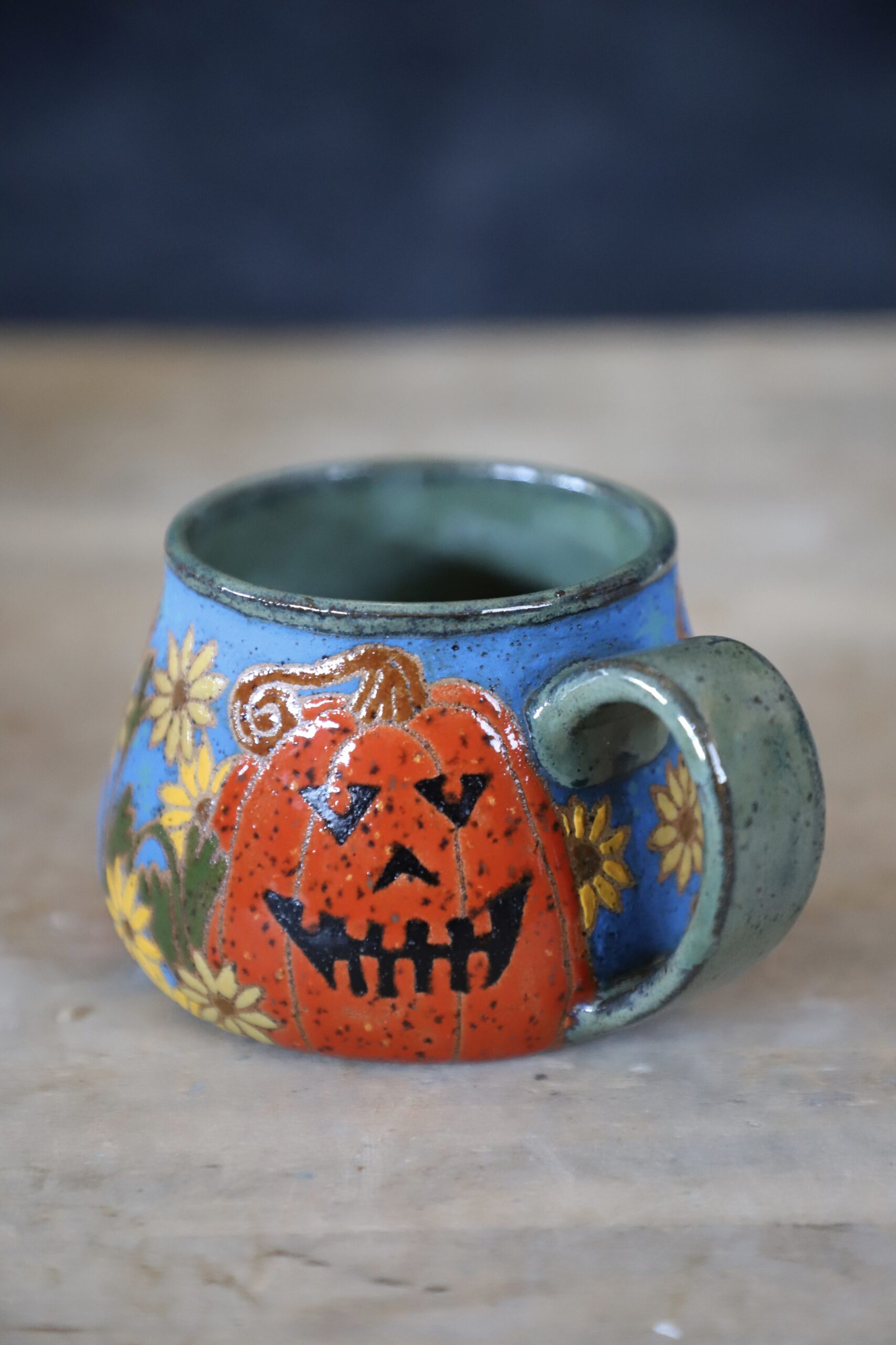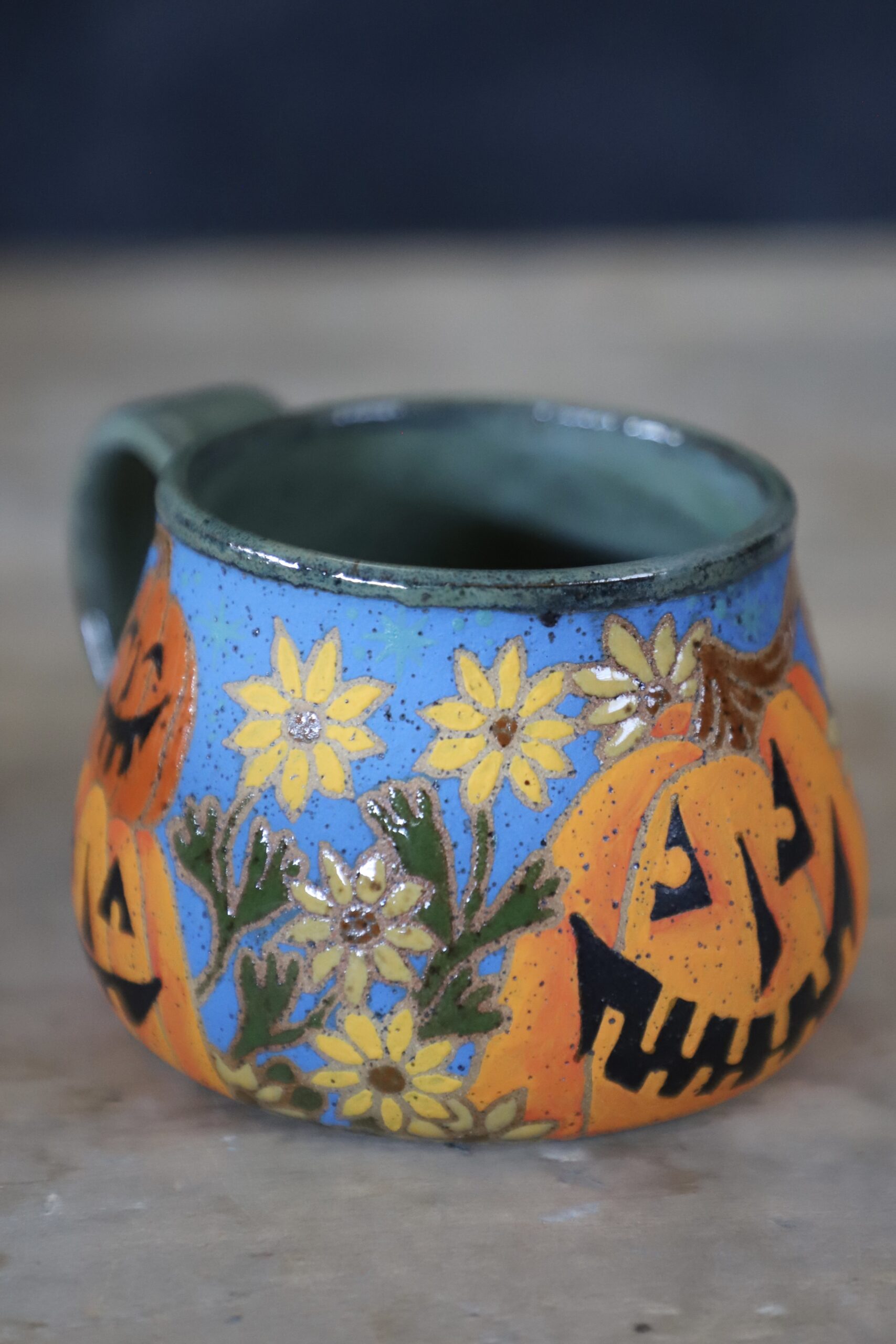 Jack-o-lanterns in the sunflowers mug holds 16oz. Made by joyful hands with love. With all handmade goods handwashing is best. Top rack dishwasher and microwave safe.