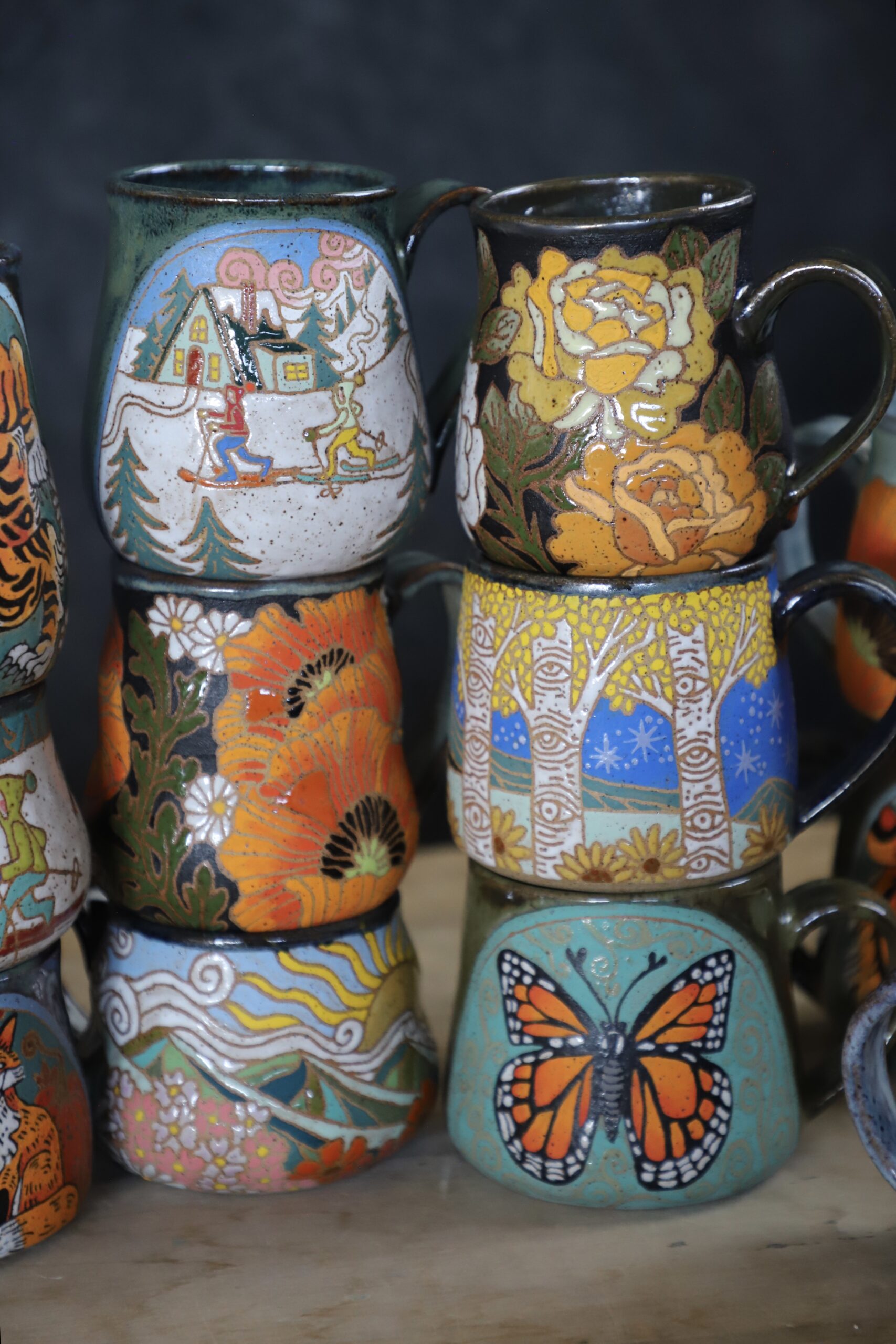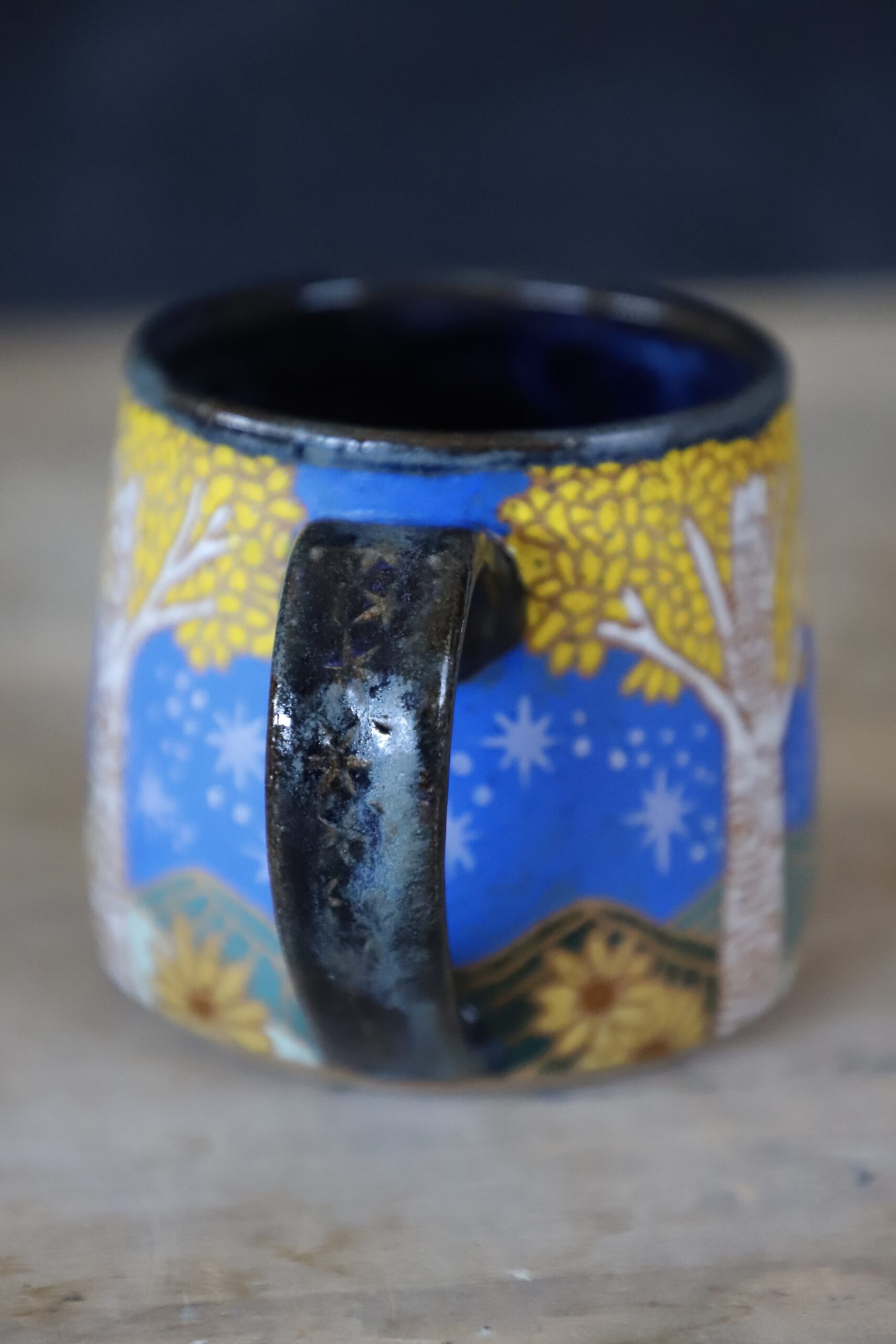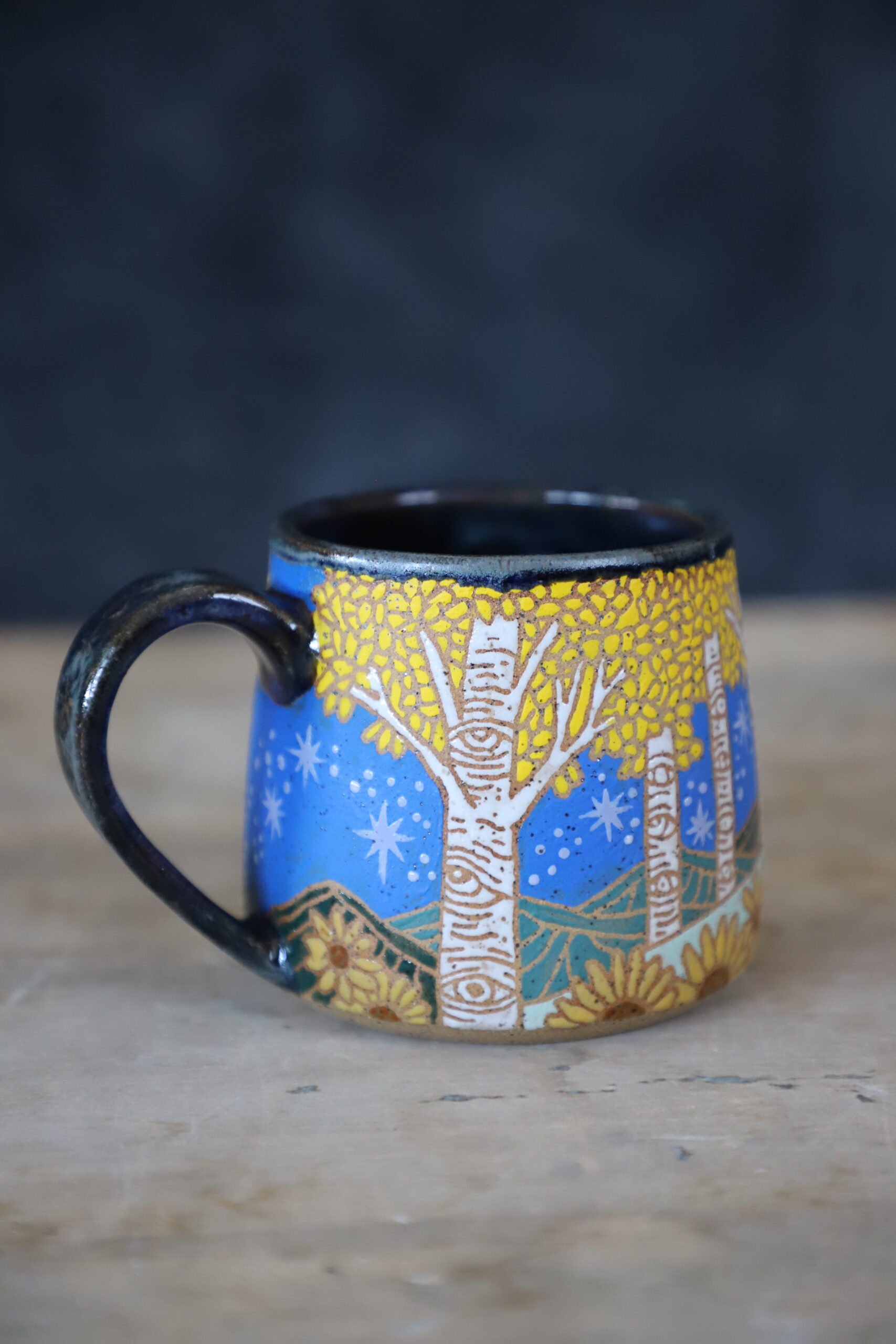 Midnight aspen mug holds 18oz. Made by joyful hands with love. With all handmade goods handwashing is best. Top rack dishwasher and microwave safe.