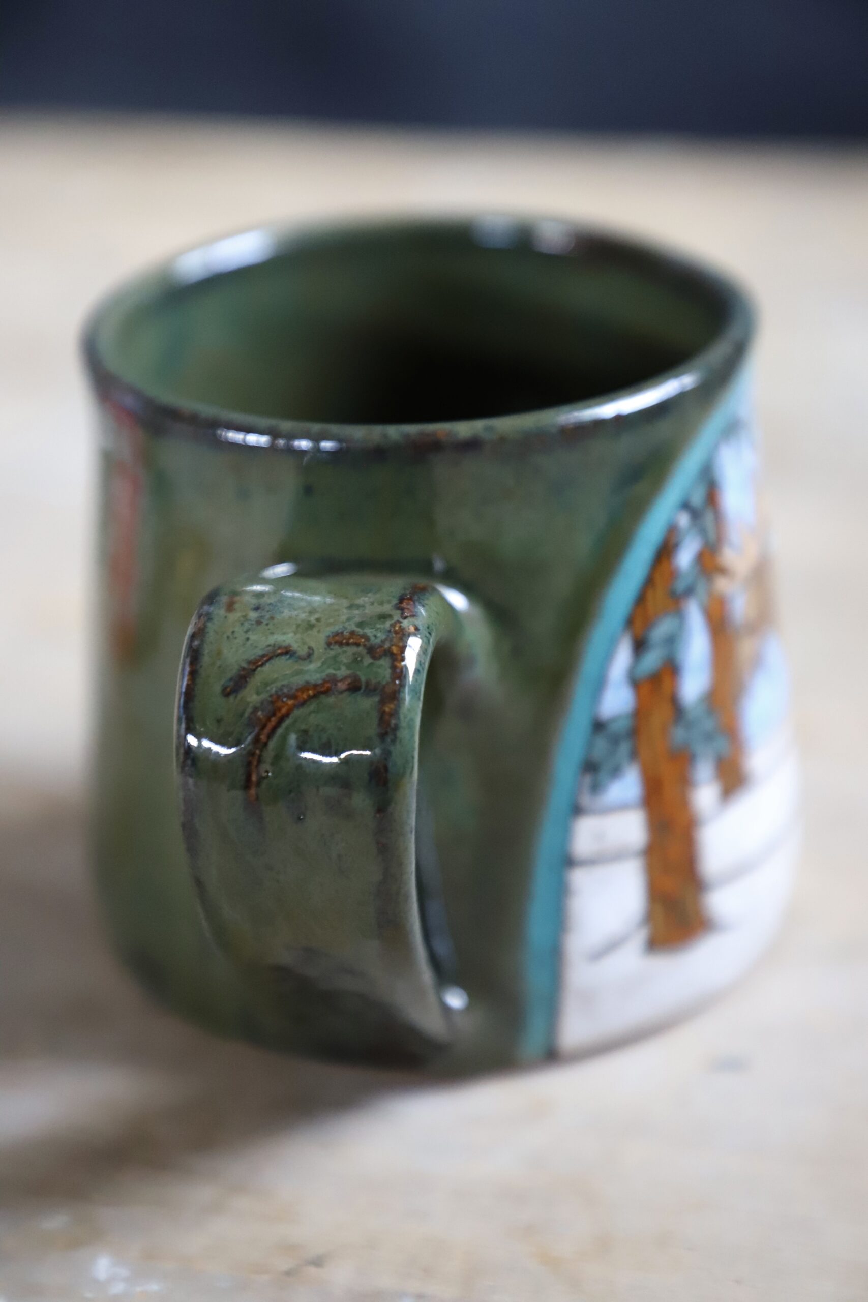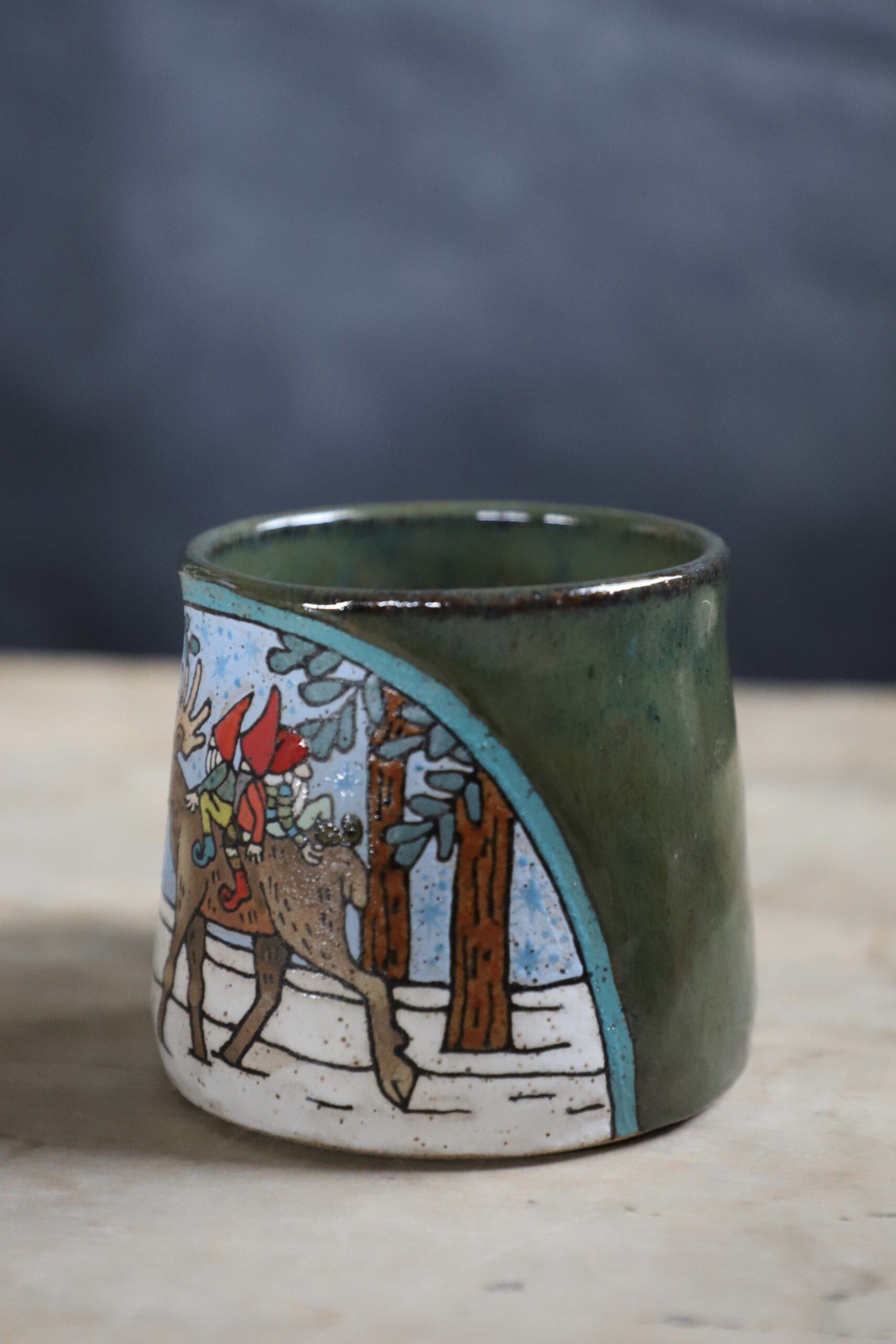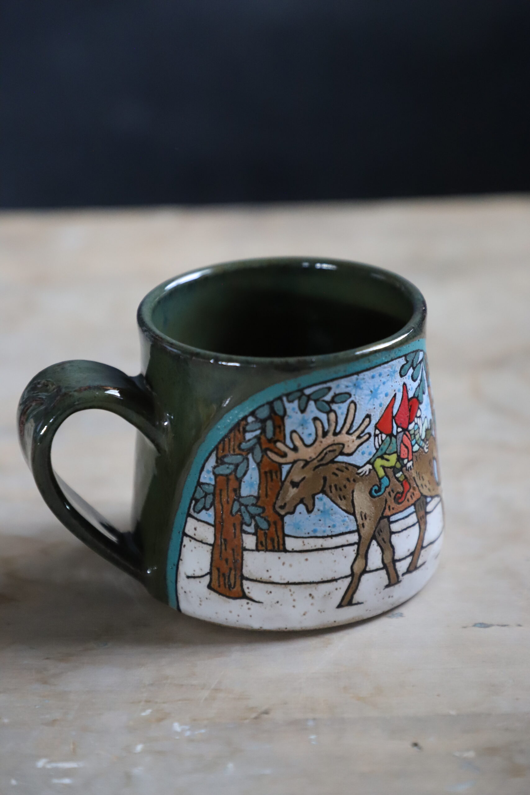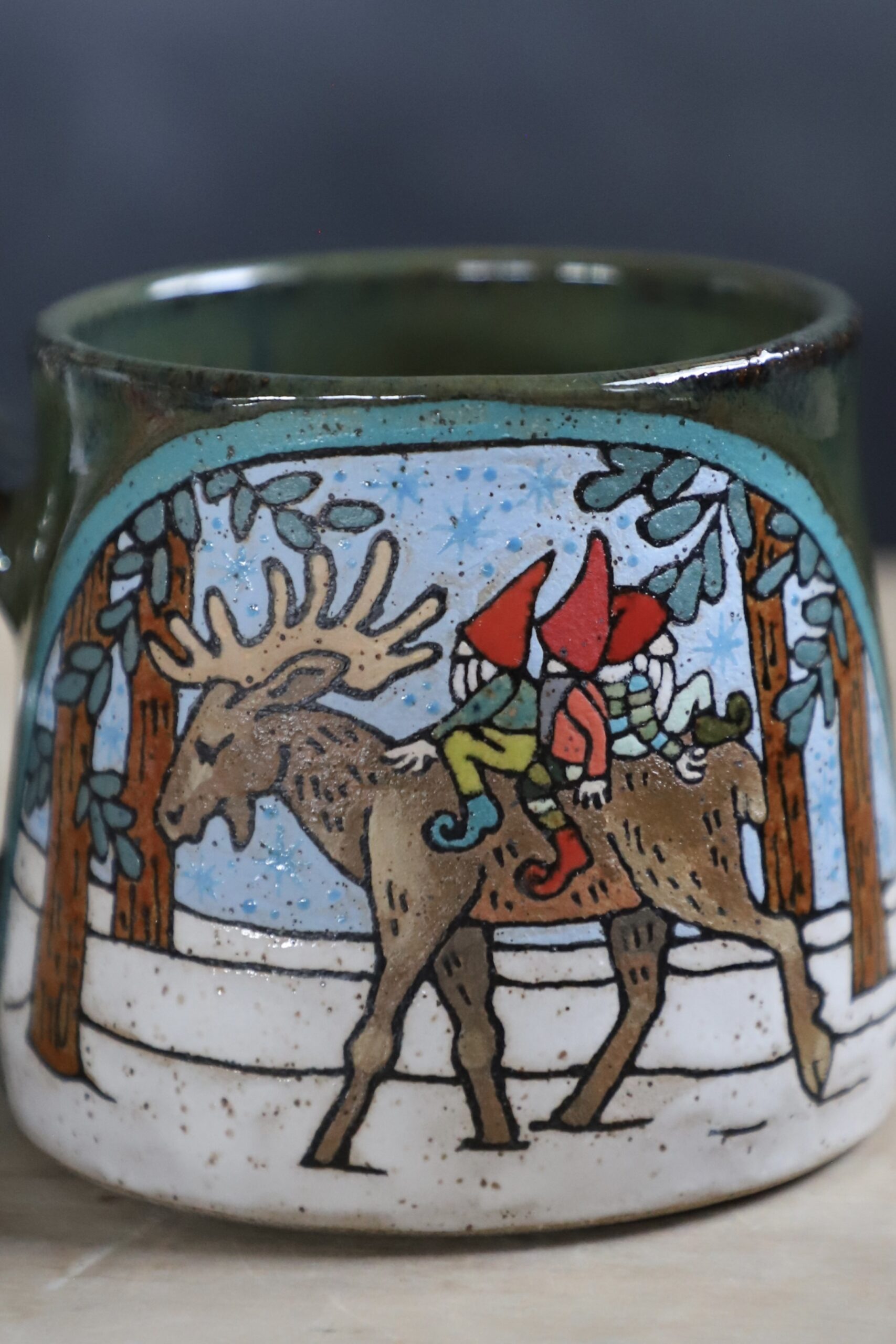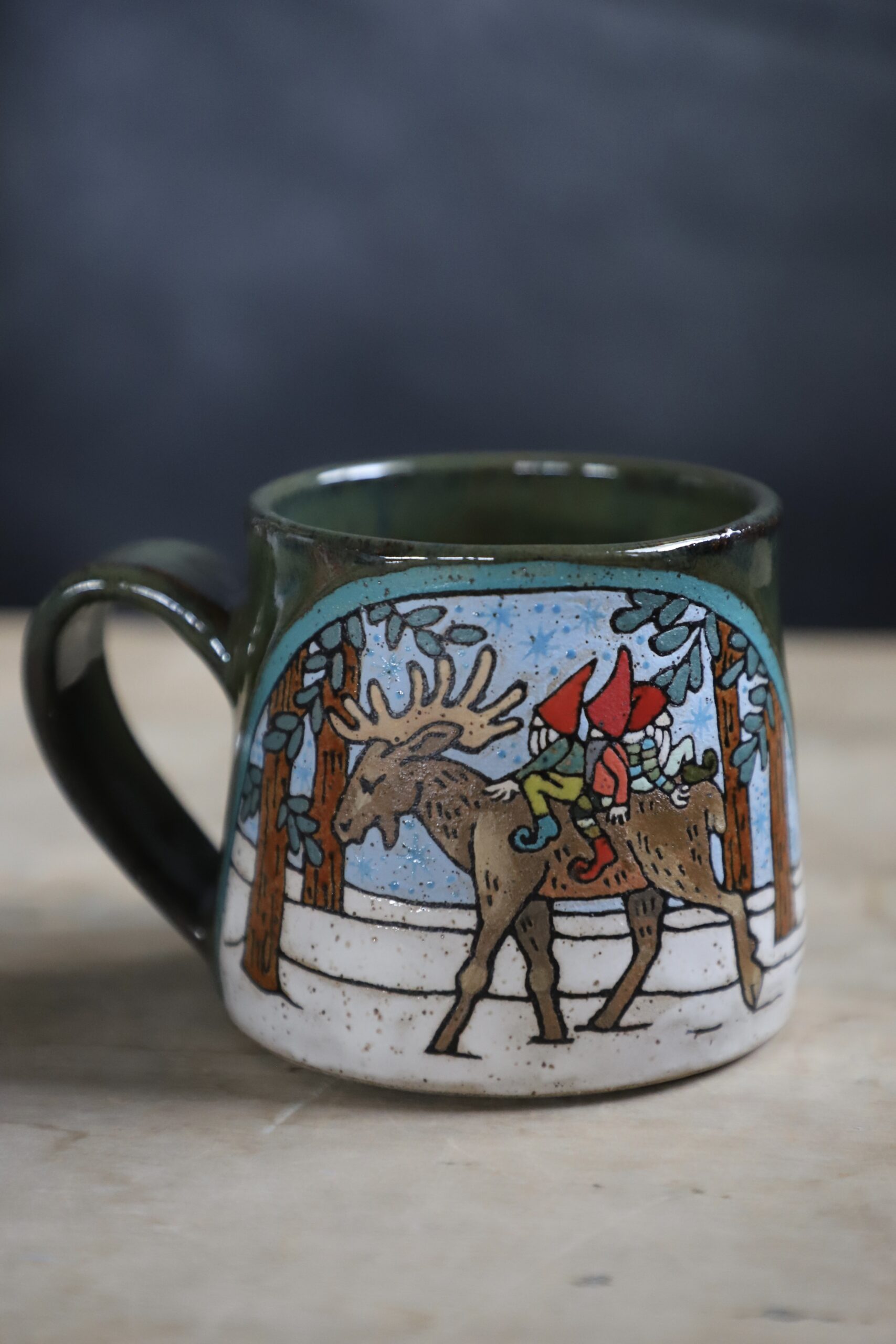 Moose & Nisse mug holds 16.5oz. From my heART to you, made with joyful hands. Top rack dishwasher & microwave safe. As with any handmade item handwashing is best to ensure longevity.