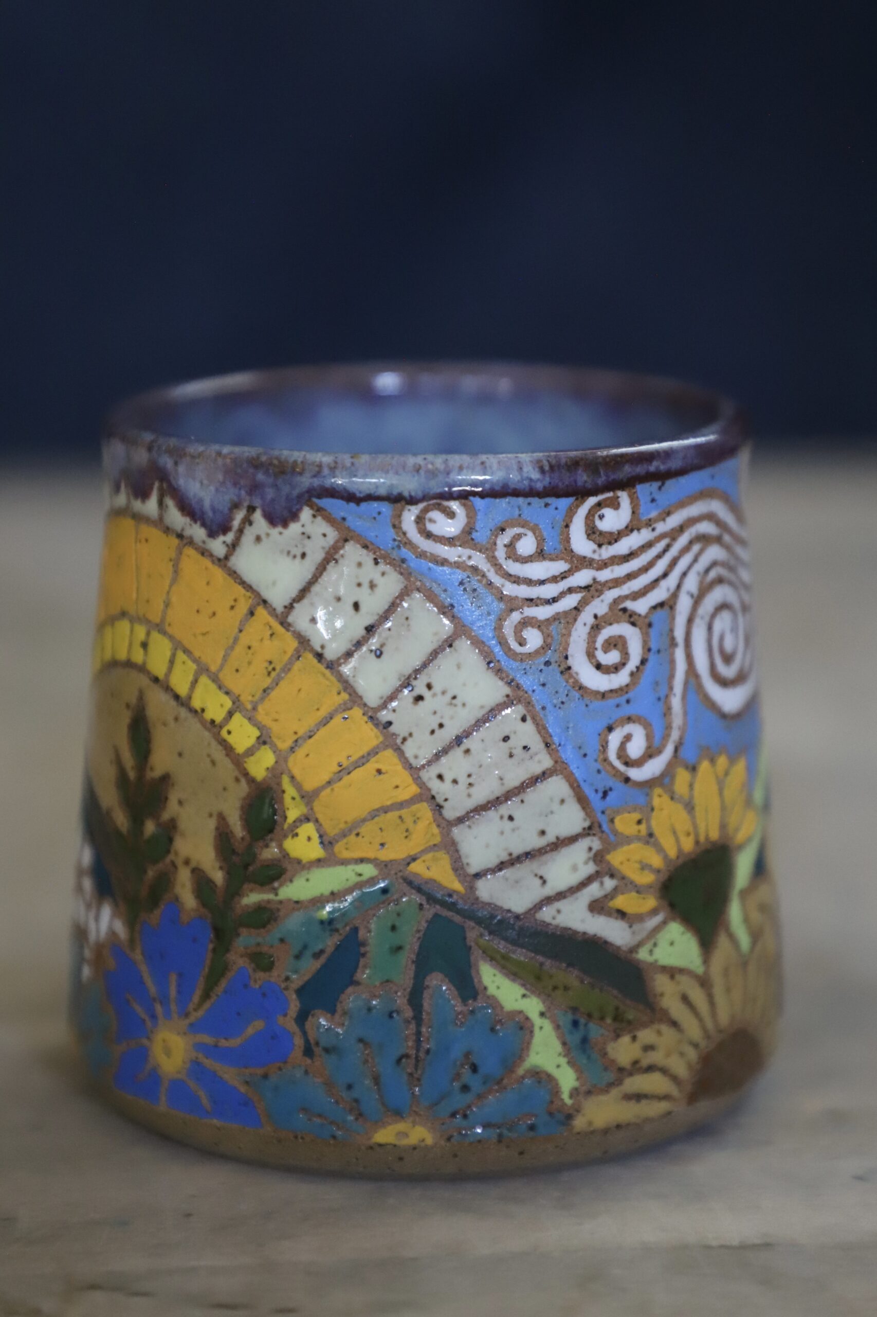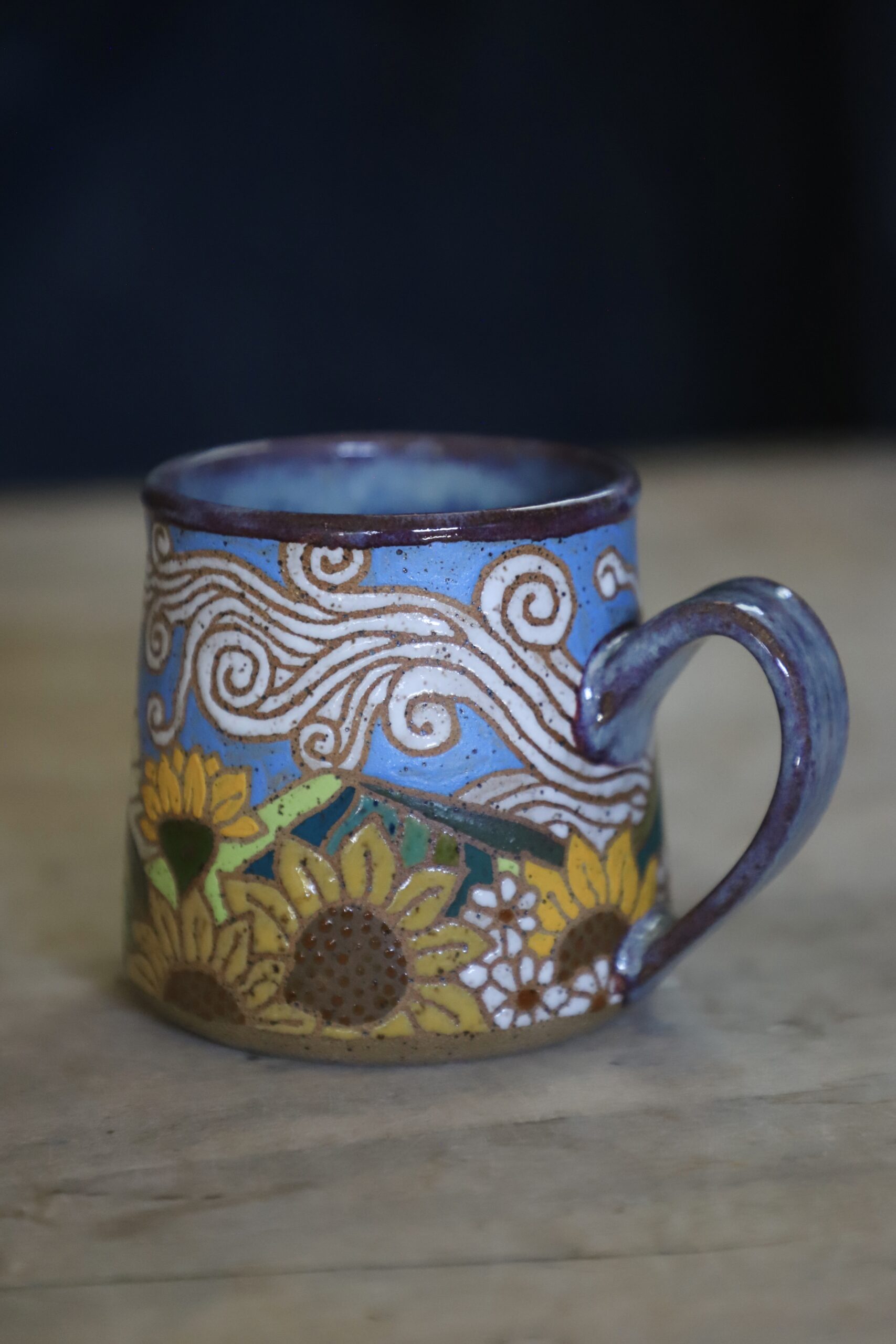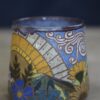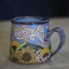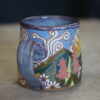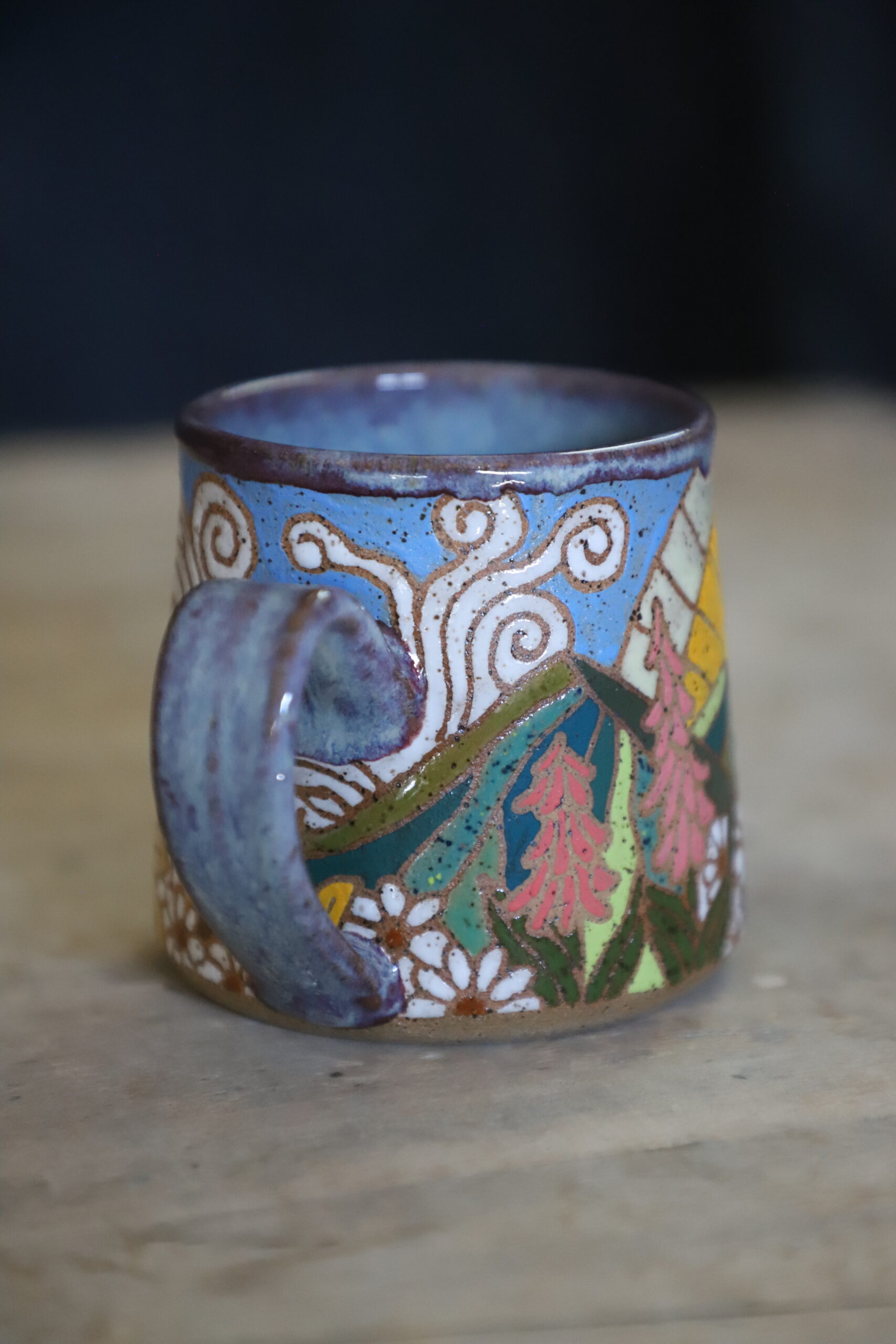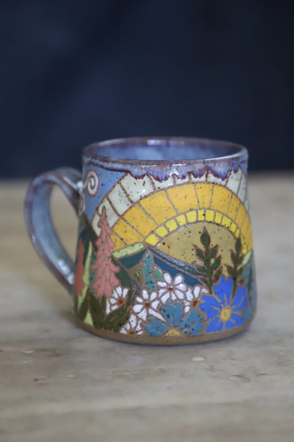 Mountain mug holds 15oz. Handwashing is always preferred for handmade items. Microwave & top rack dishwasher safe.