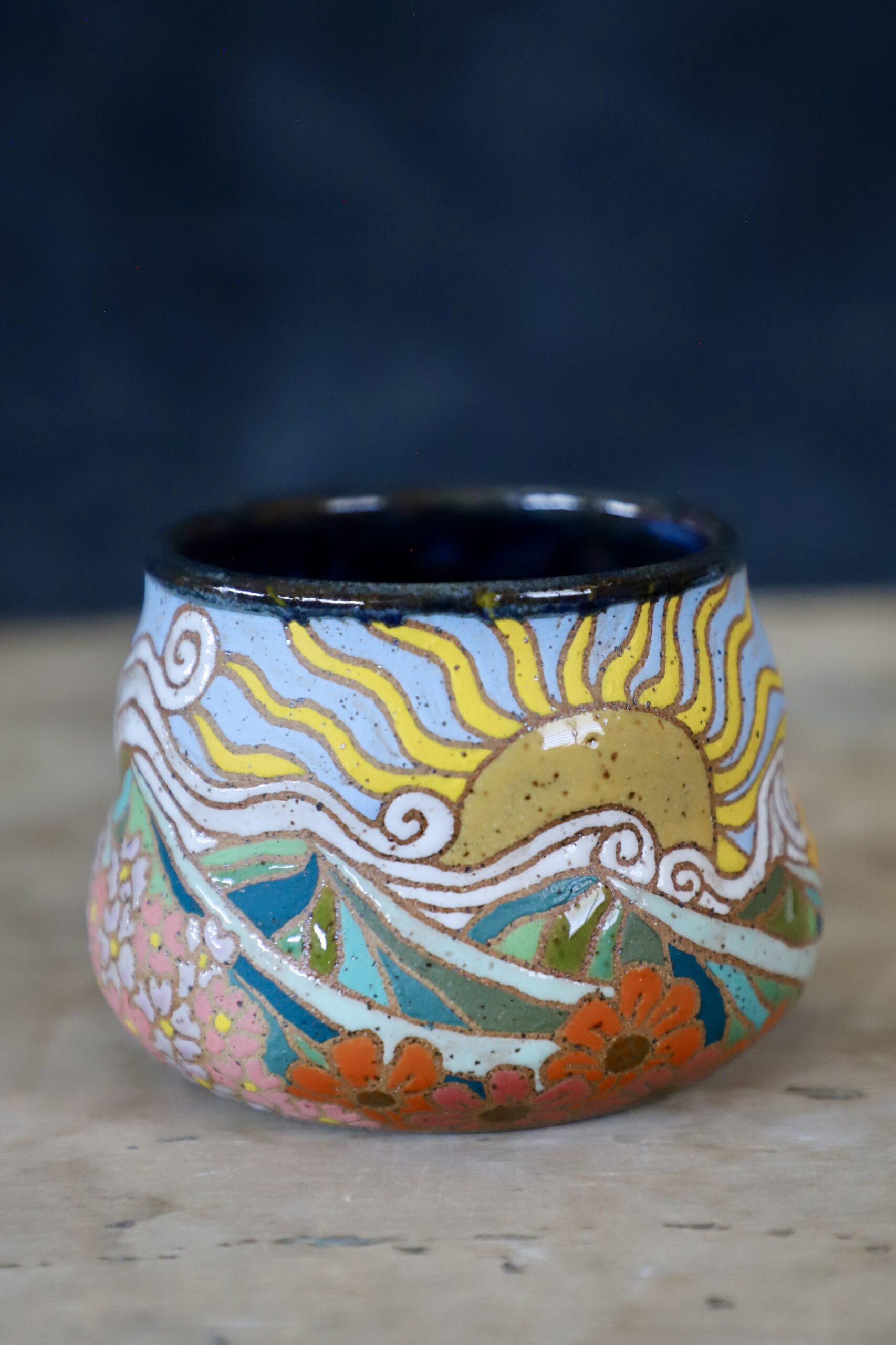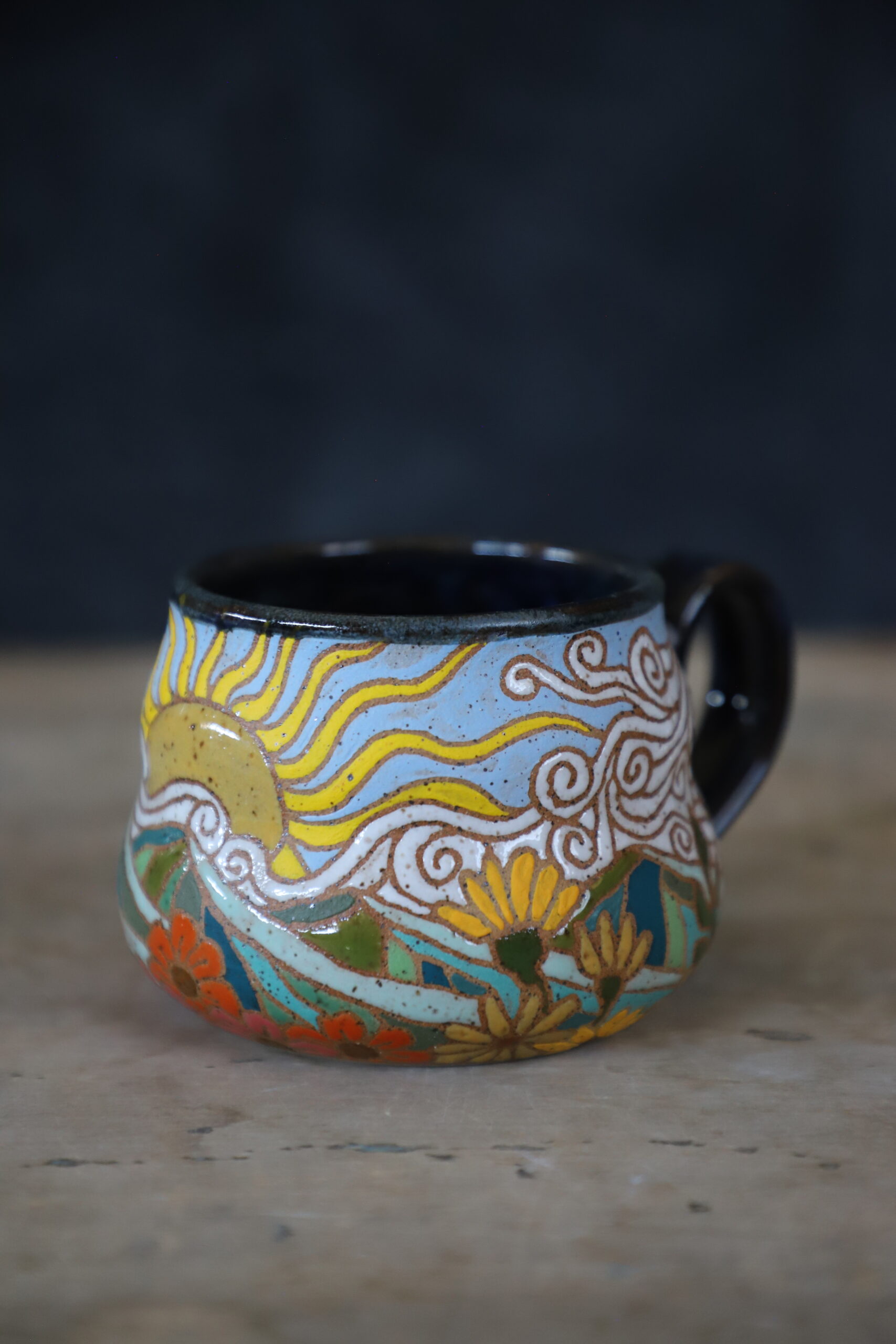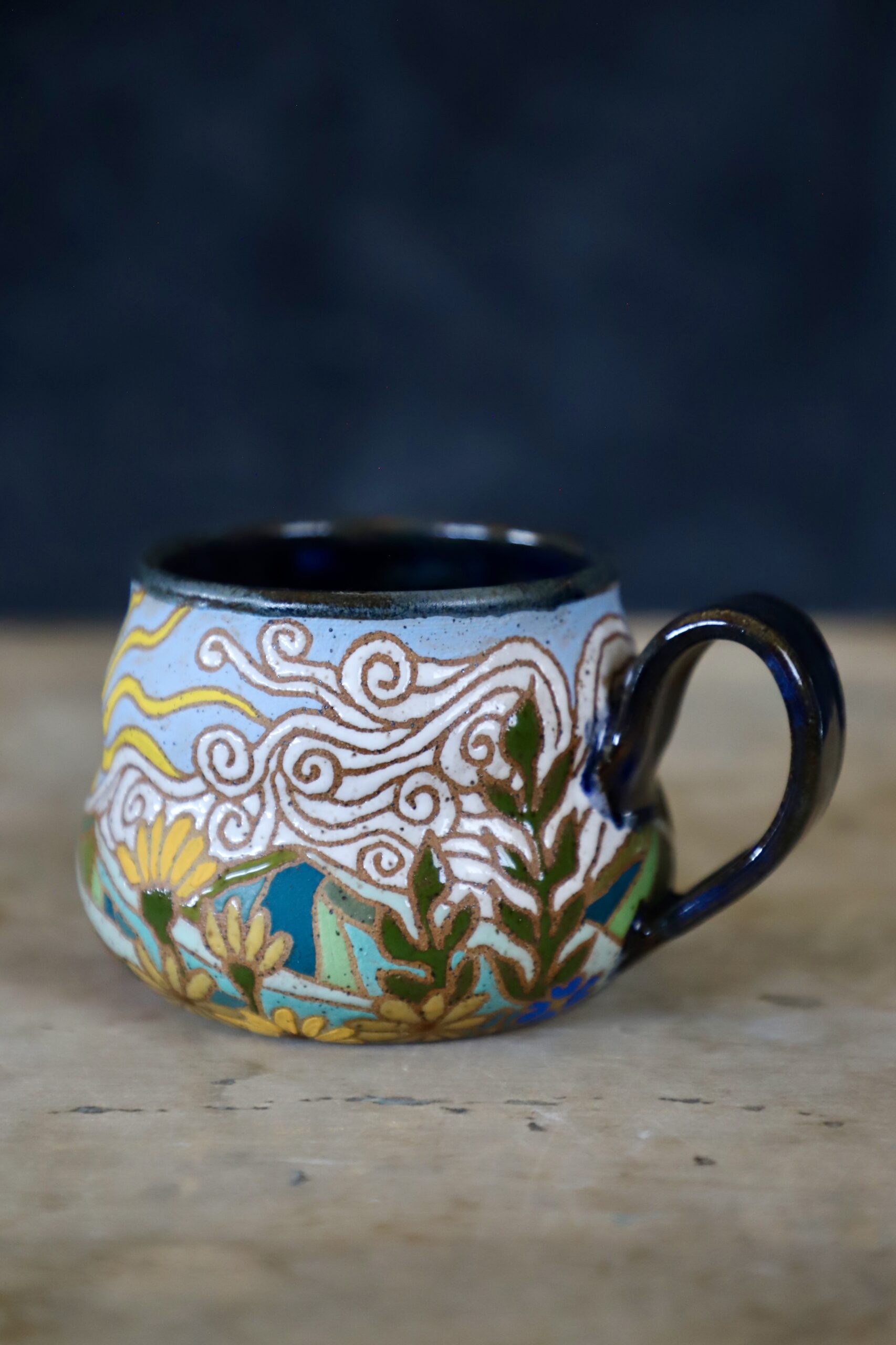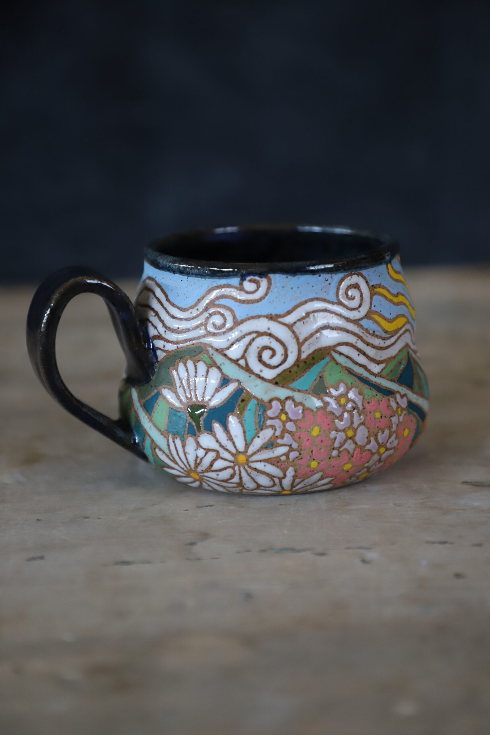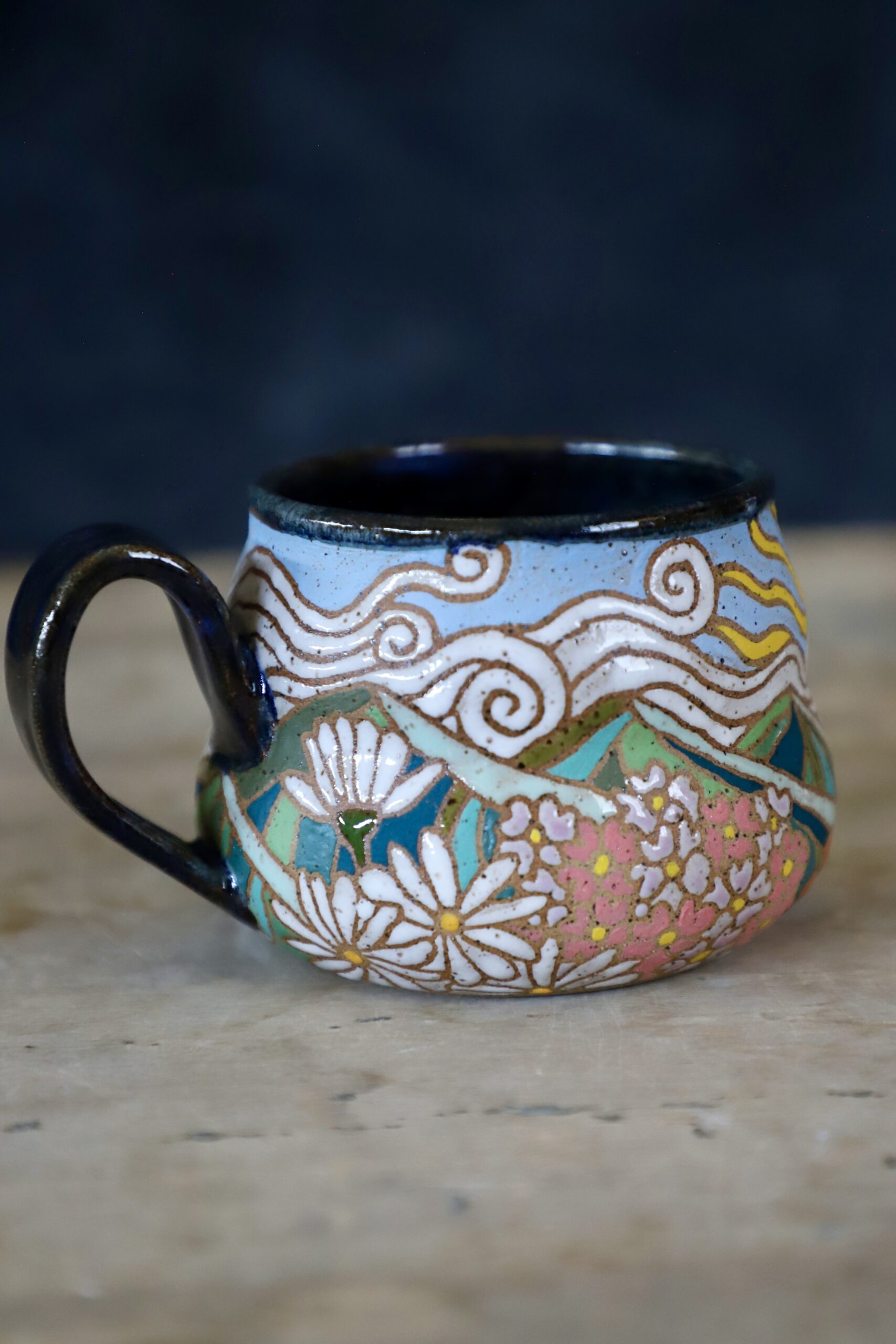 Mountain mug #3 holds 18.5oz. Made by joyful hands with love. With all handmade goods handwashing is best. Top rack dishwasher and microwave safe.