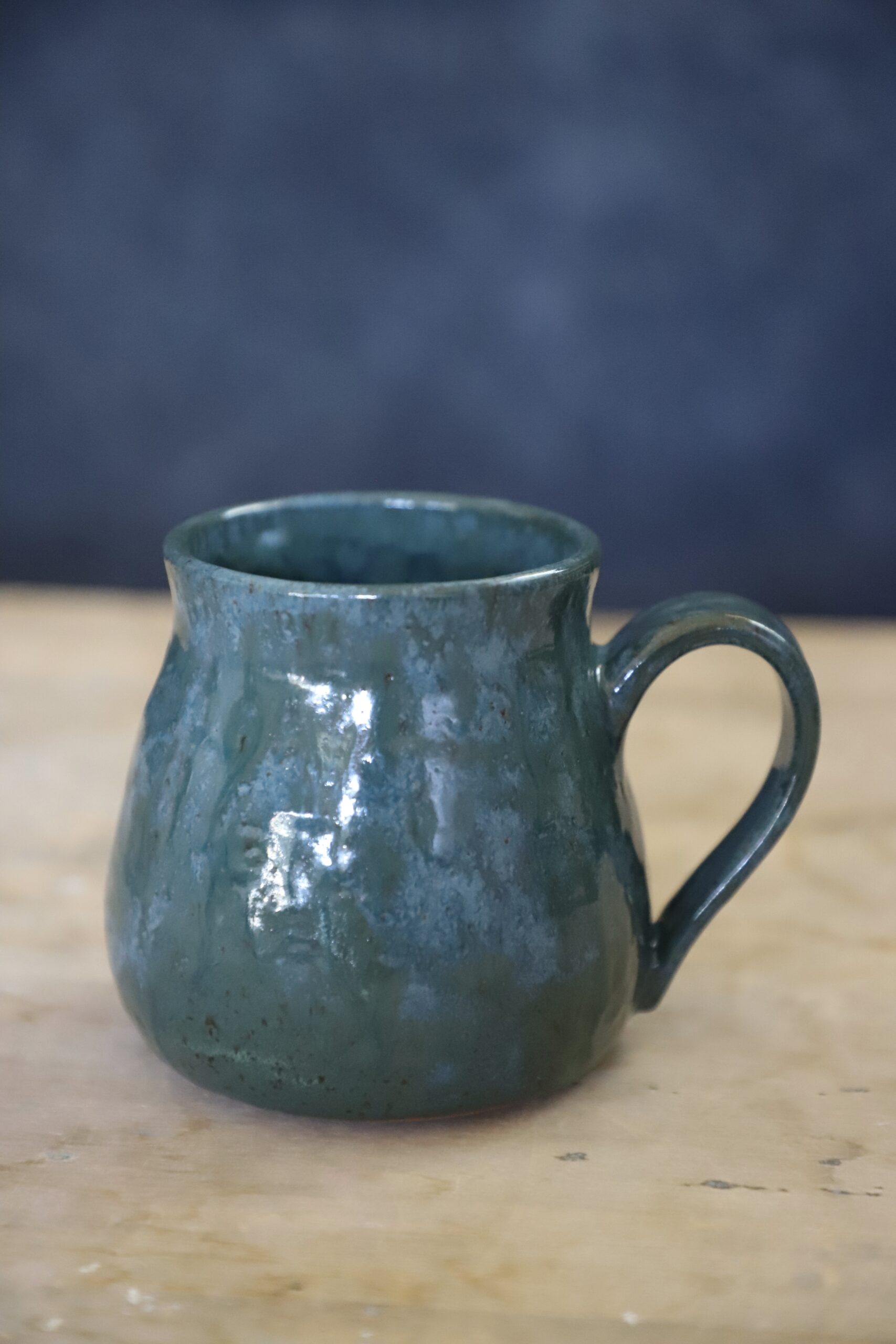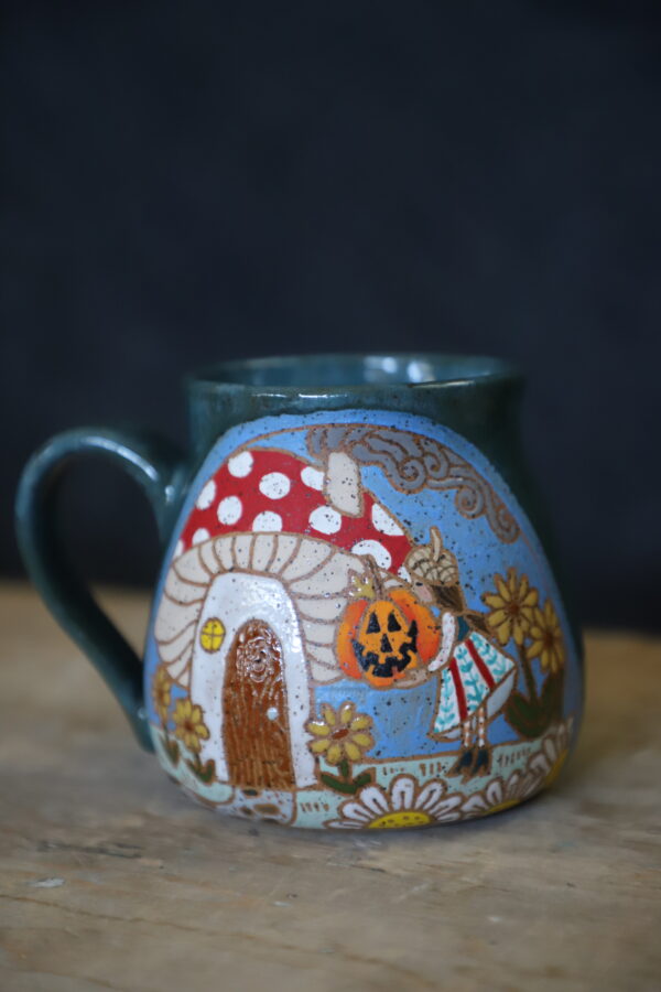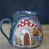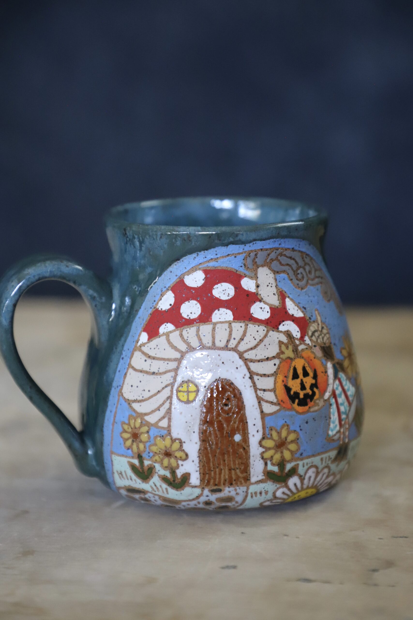 Mushroom cottage mug holds 20oz. Handwashing is always preferred for handmade items. Microwave & top rack dishwasher safe.