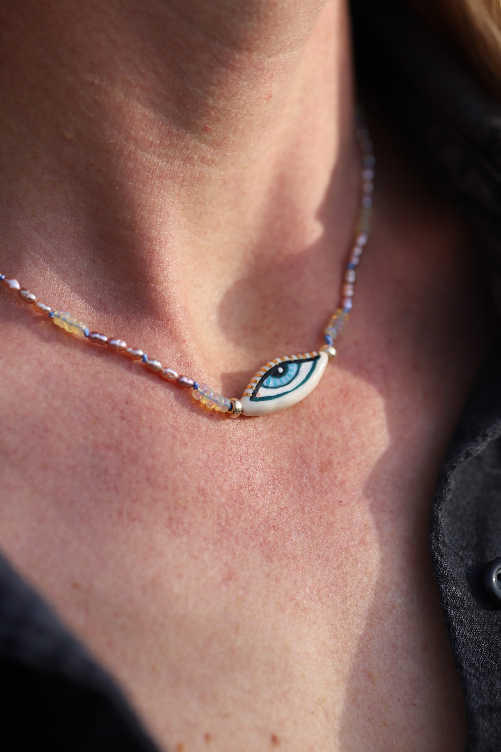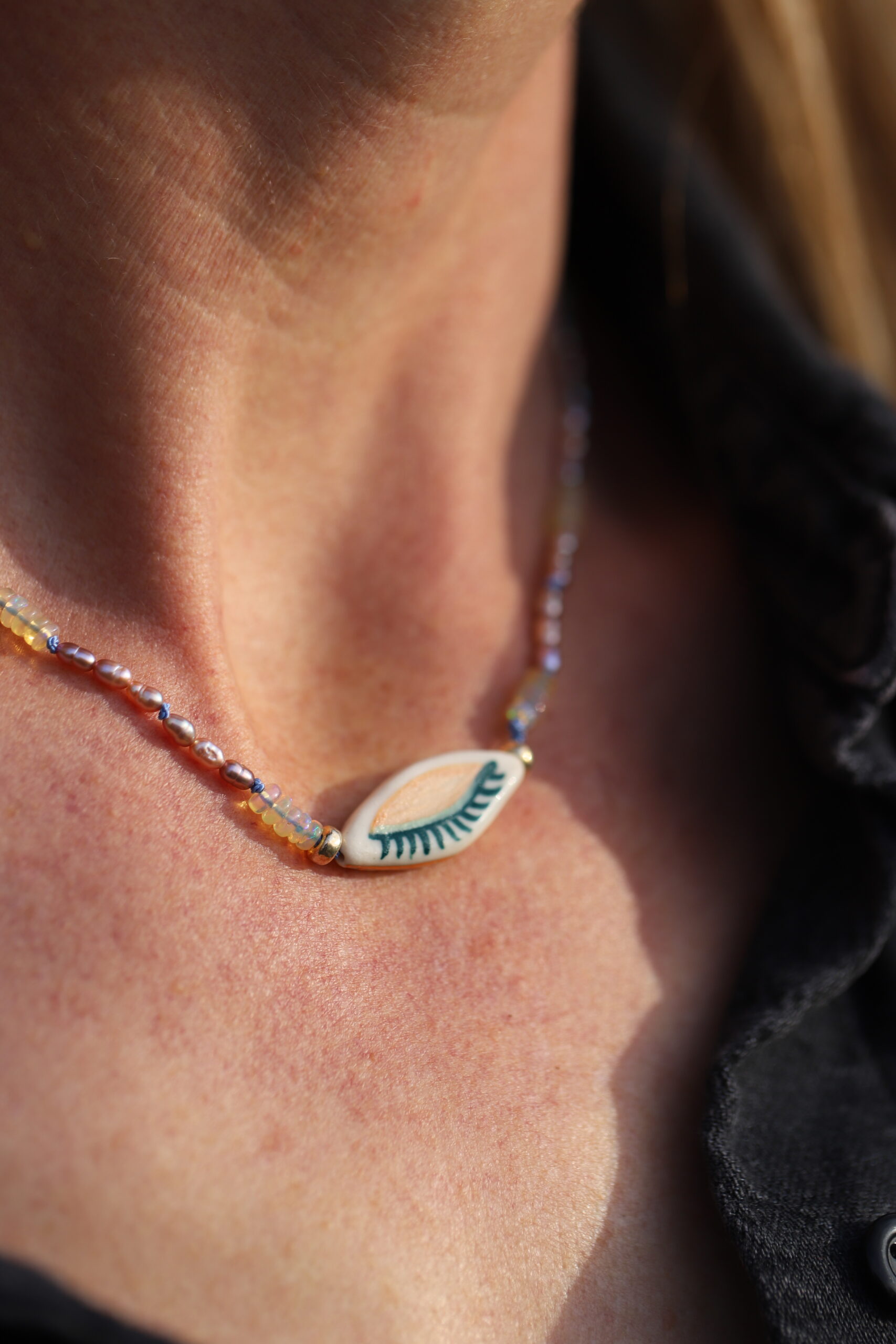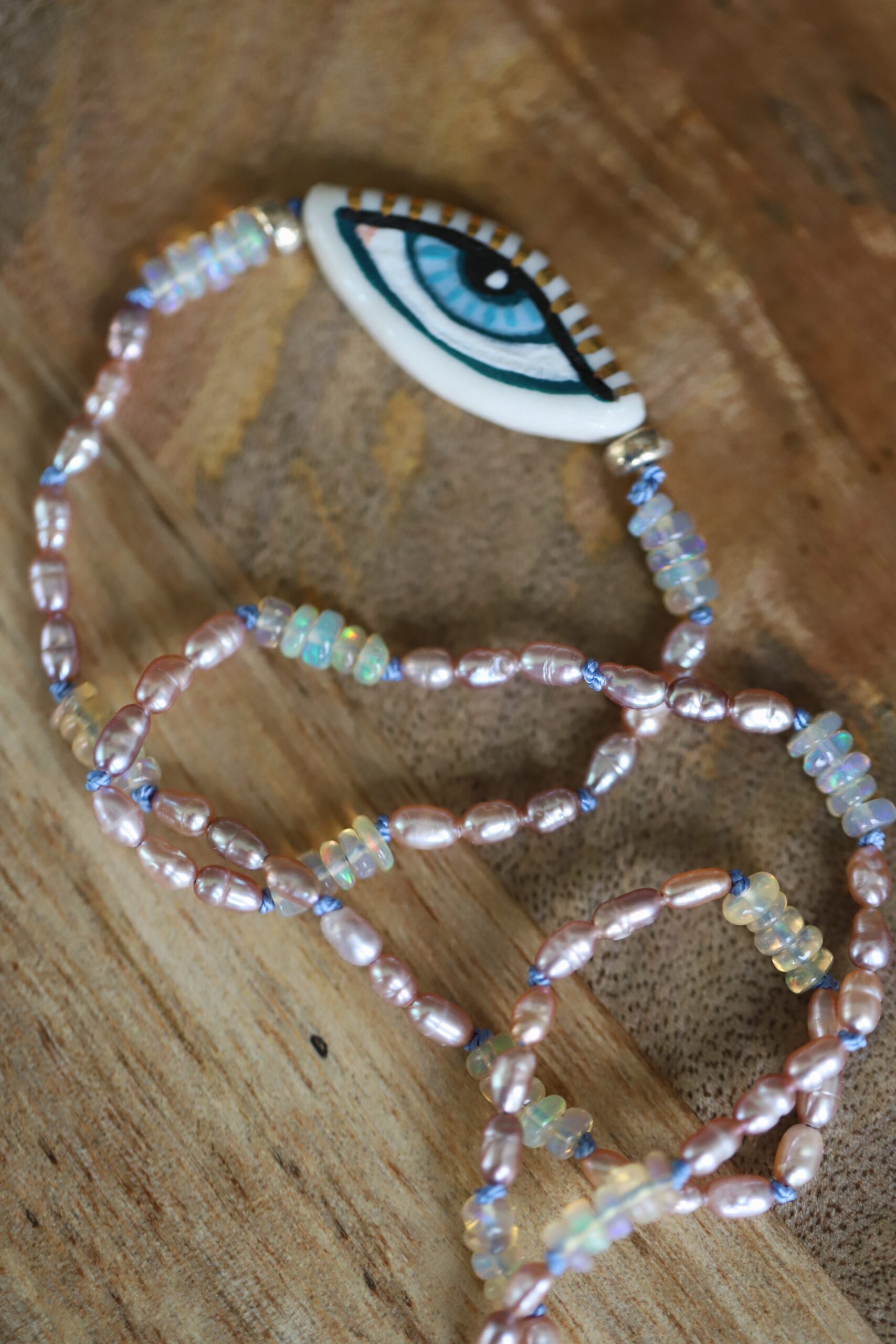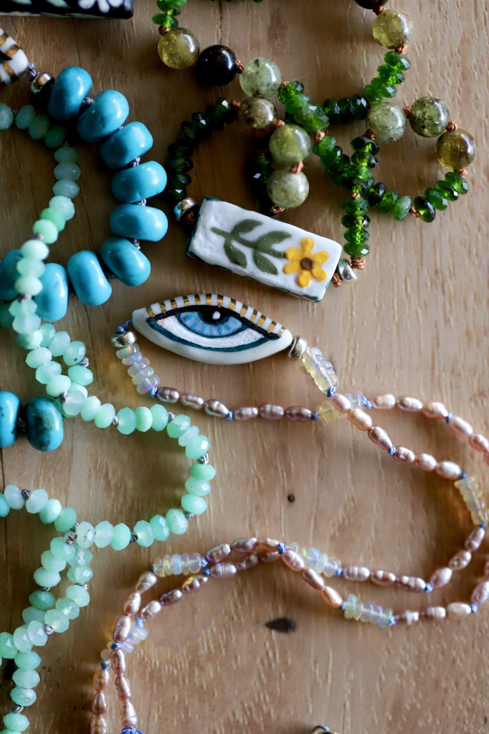 Porcelain, hand painted, bead and semi precious stones. Necklace is strung on silk with afresh water pearls and glowing opals. Measures 8″ bead measures 1″ Hand made with love & joyful hands. Be mindful when wearing silk cord jewelry, not to snag or pull.