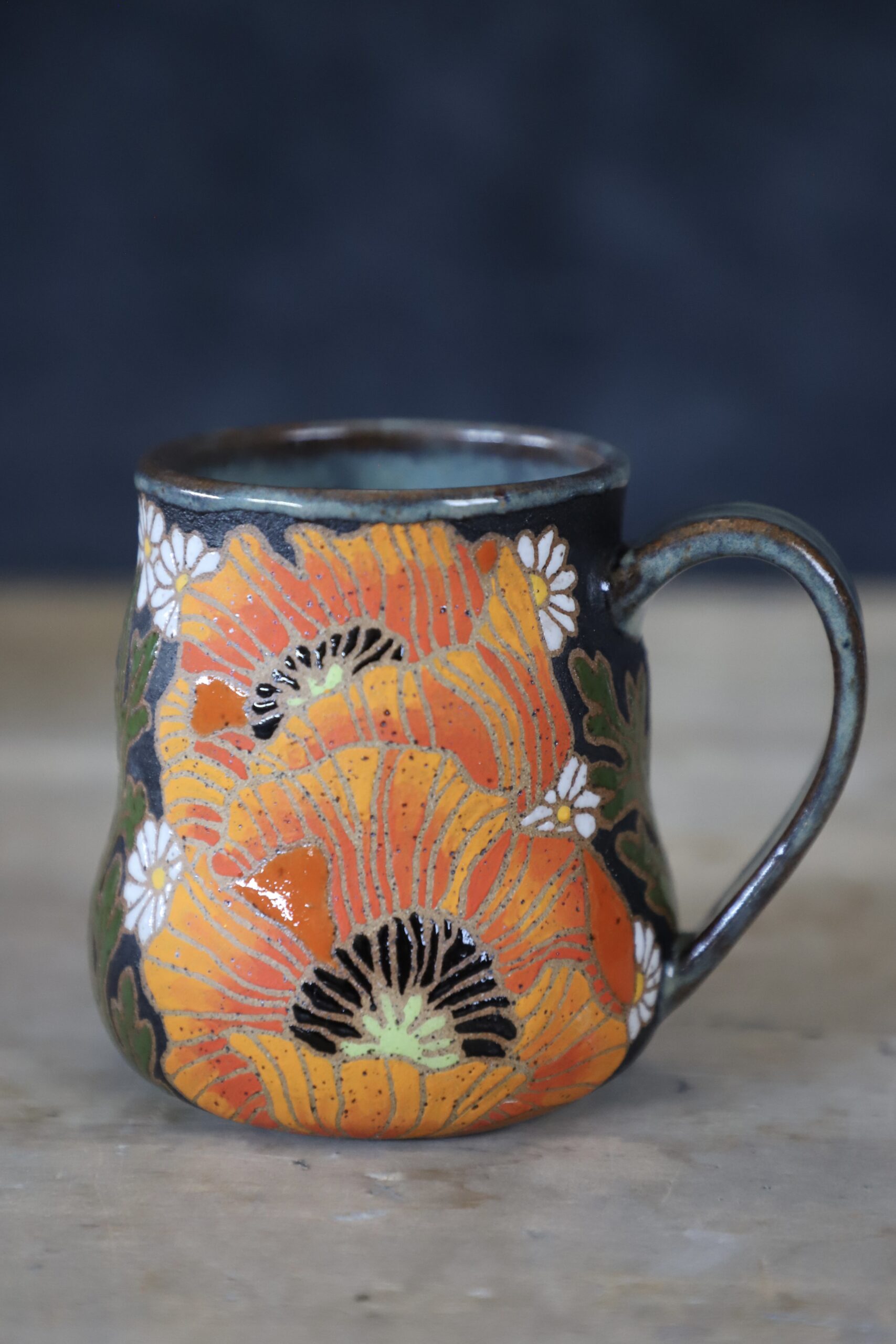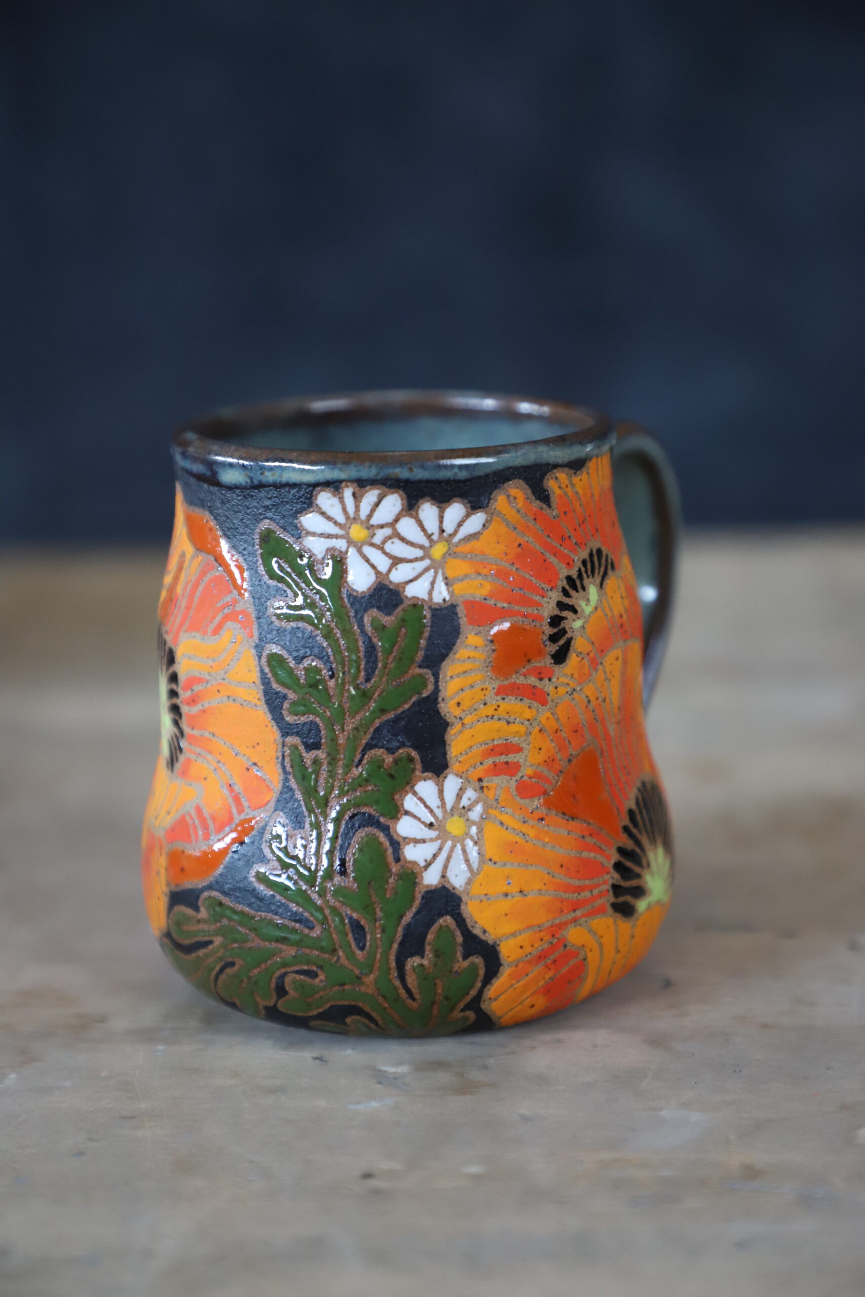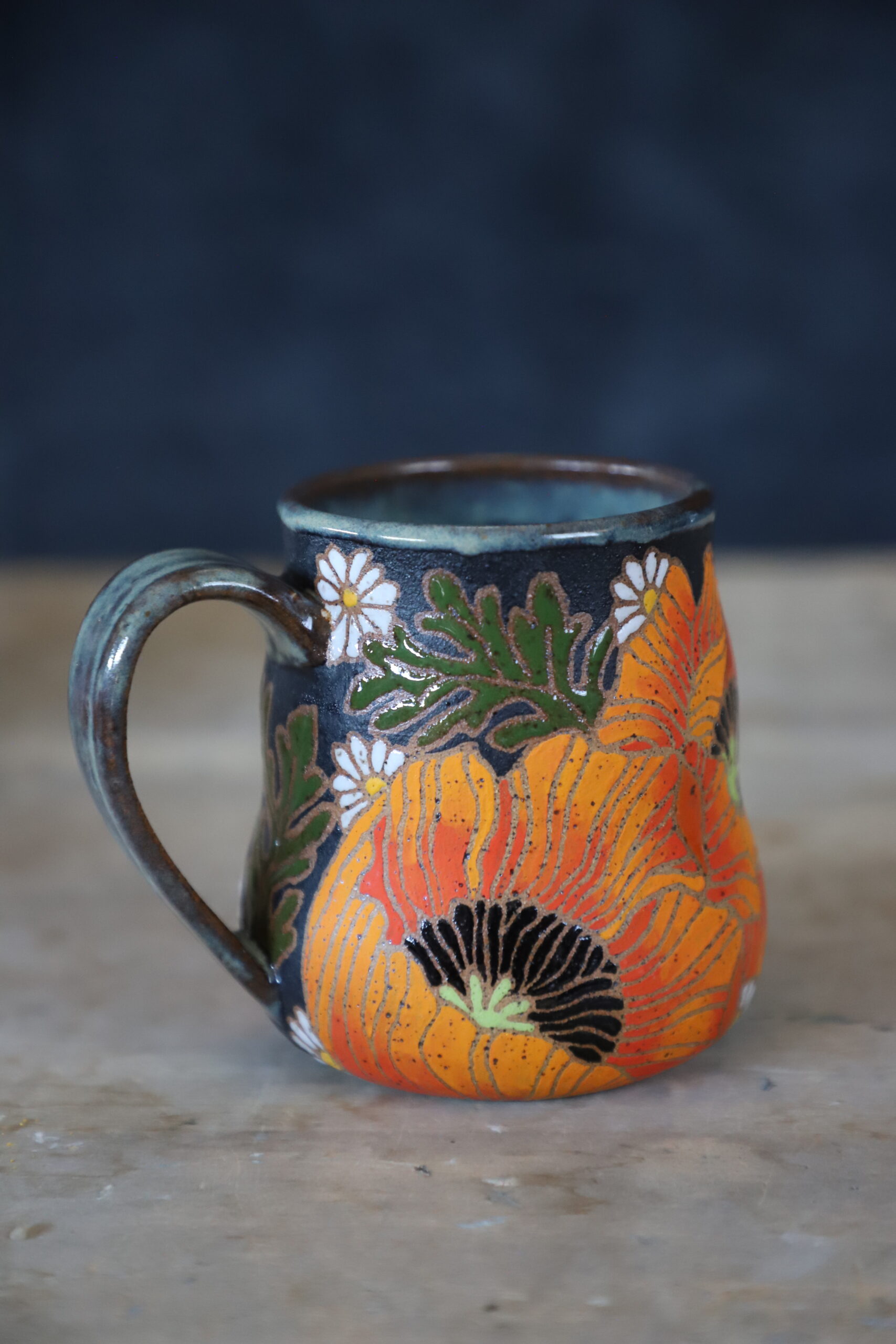 Poppy mug #2 holds 17oz. Made by joyful hands with love. With all handmade goods handwashing is best. Top rack dishwasher and microwave safe.