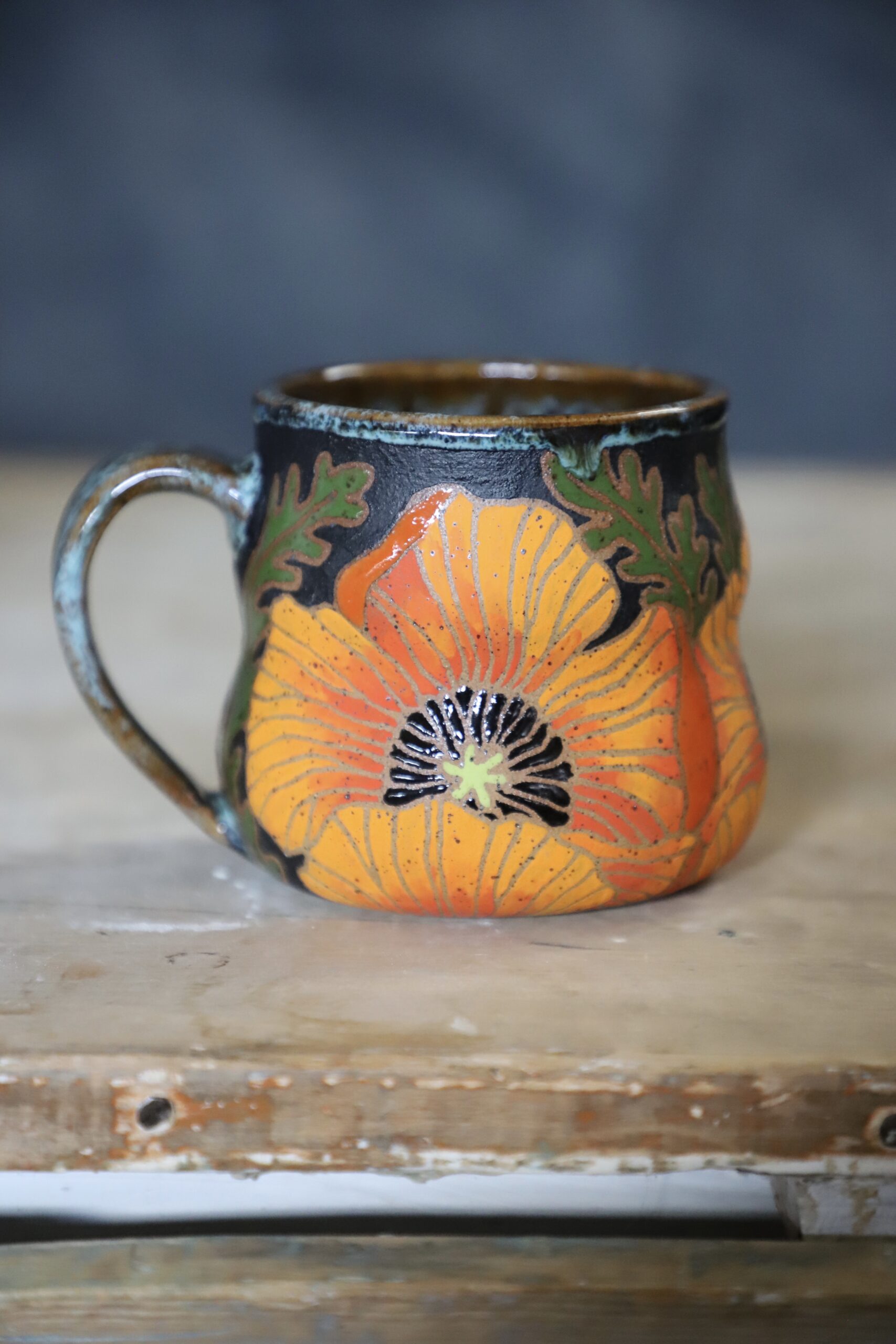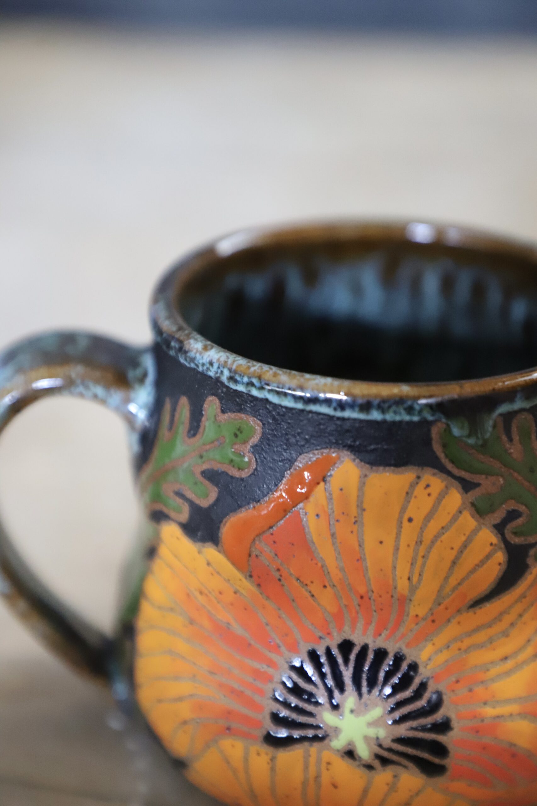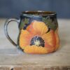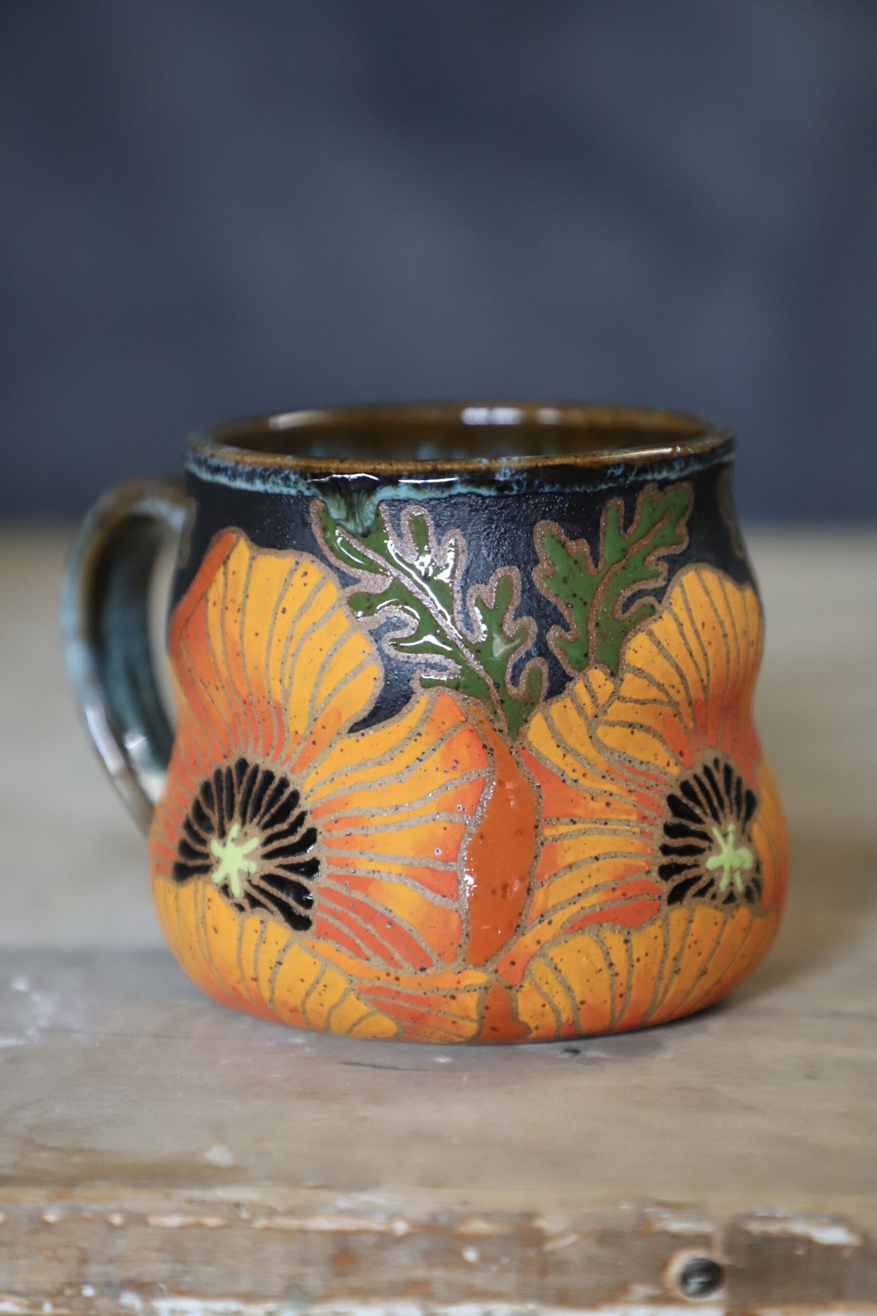 Poppy mug holds 17oz. Microwave and top rack dishwasher safe. Handwashing is always best for the longevity of handmade.