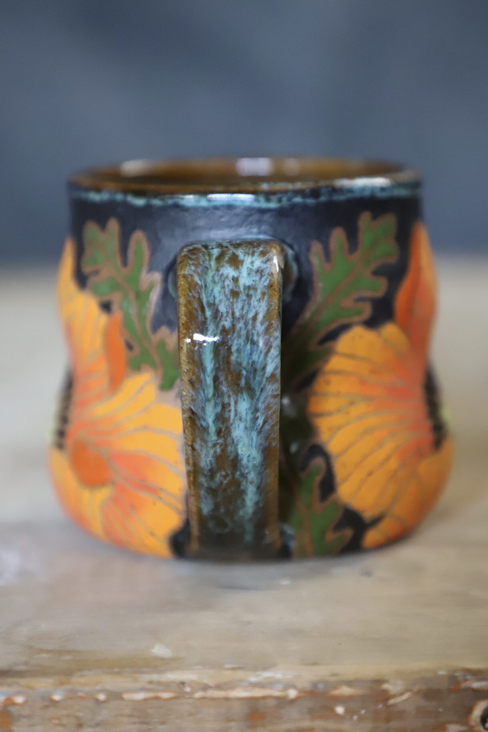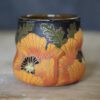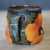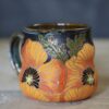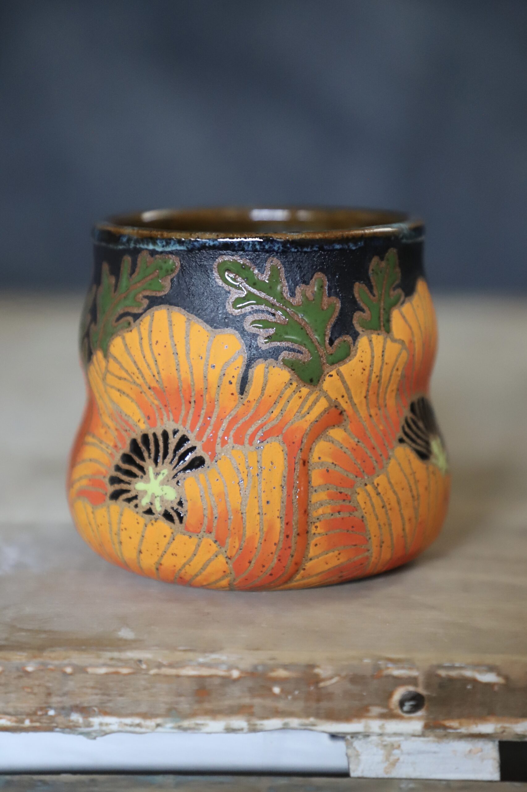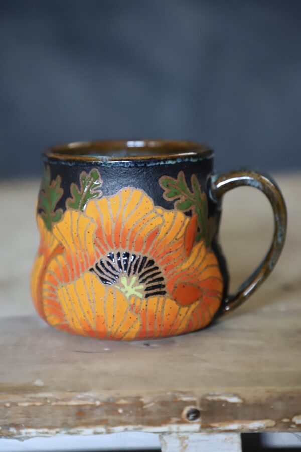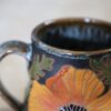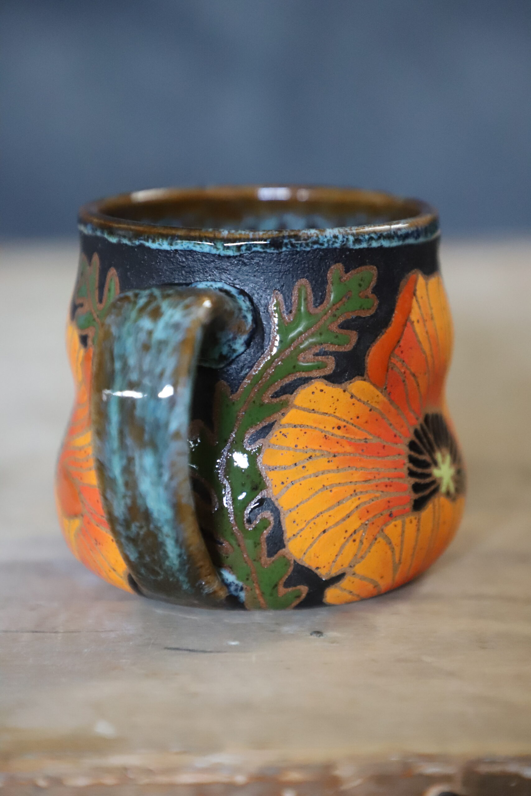 Poppy mug holds 17oz. Microwave and top rack dishwasher safe. Handwashing is always best for the longevity of handmade.