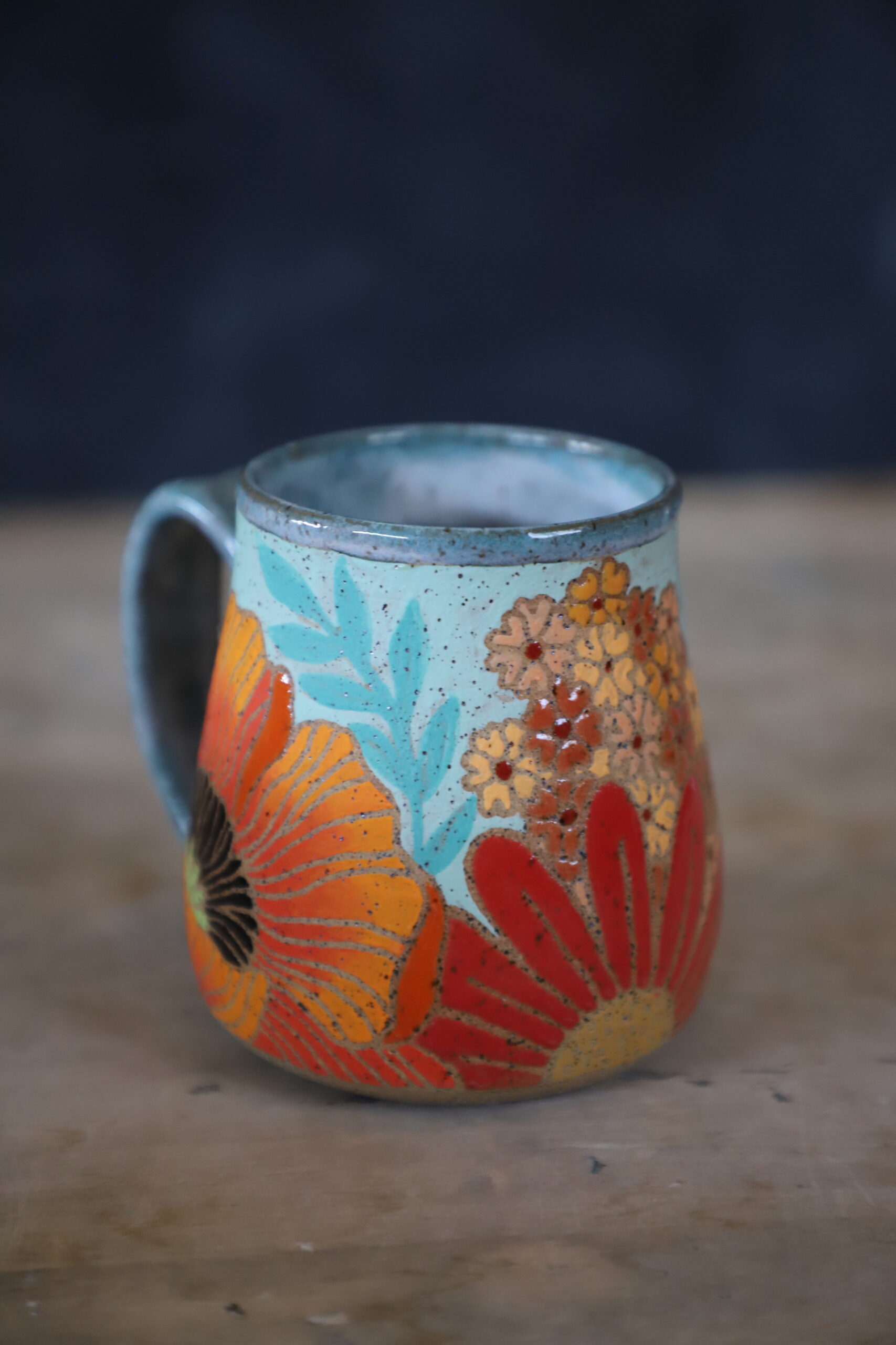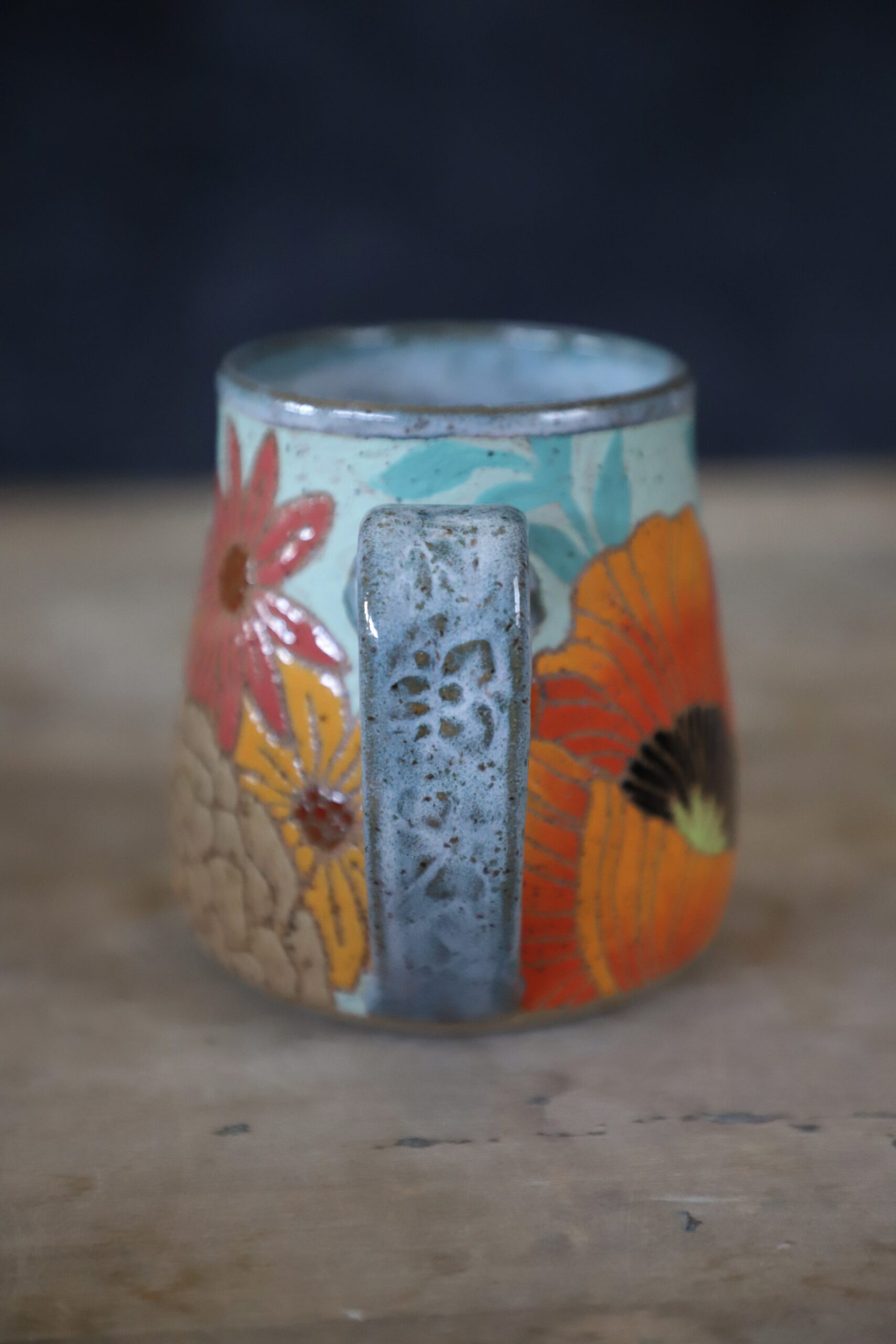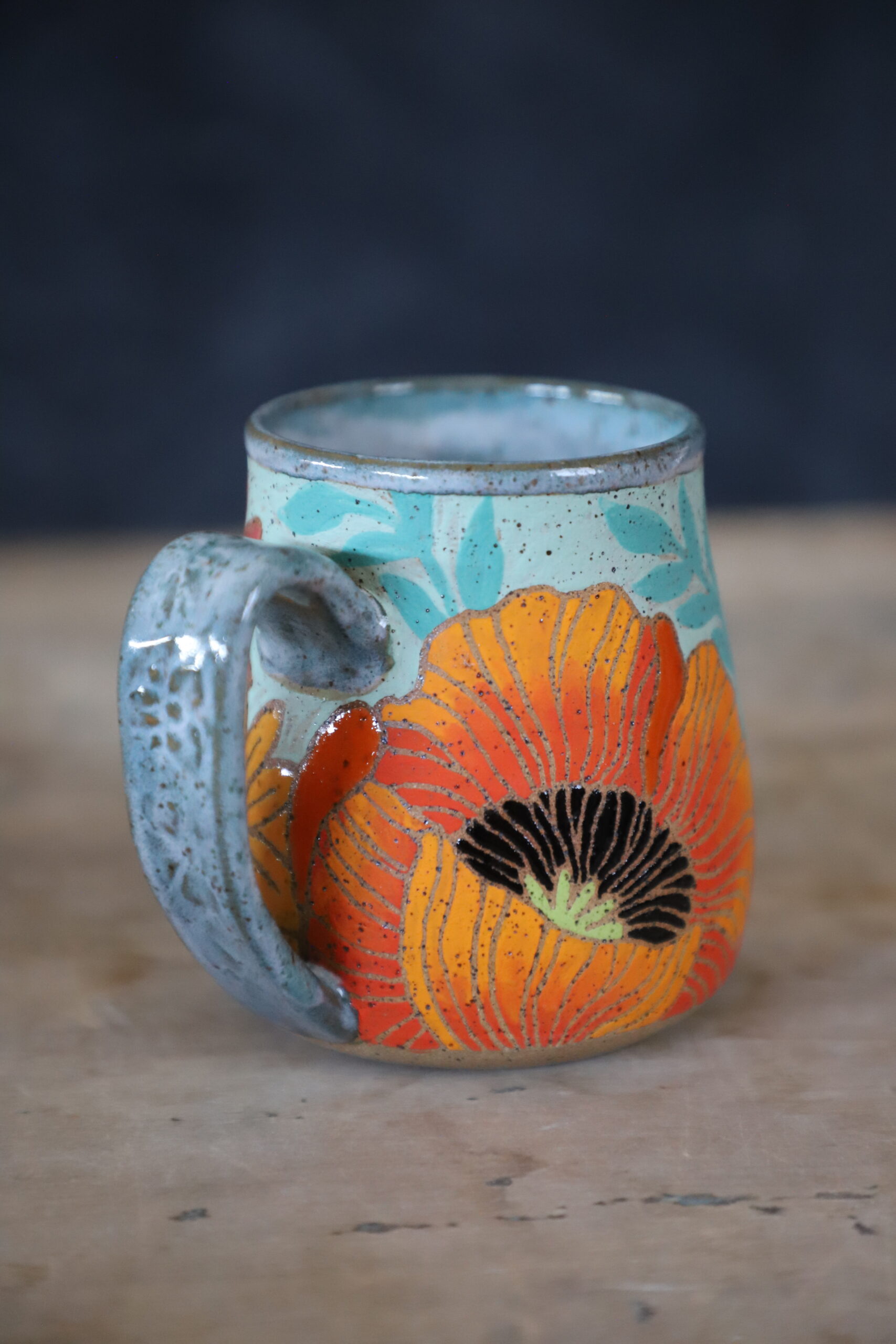 Poppy & wildflower mug holds 15oz. Made by joyful hands with love. With all handmade goods handwashing is best. Top rack dishwasher and microwave safe.