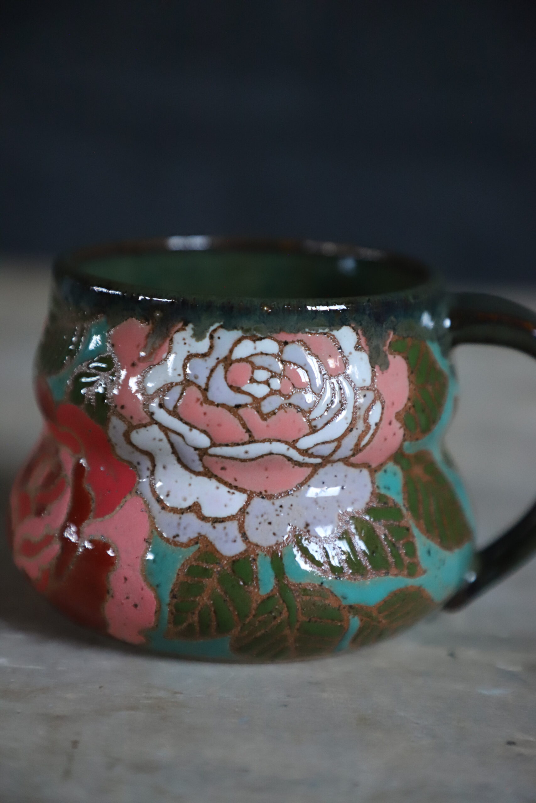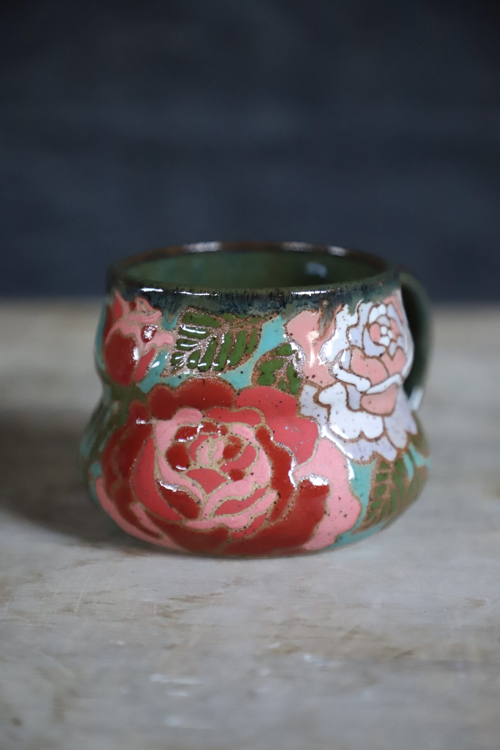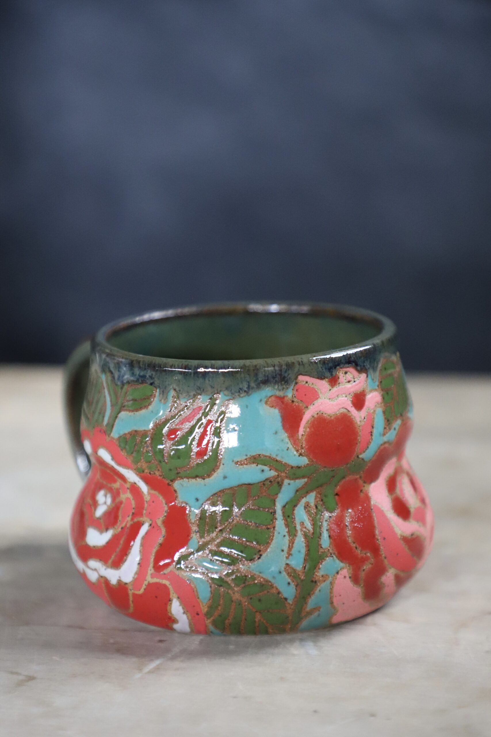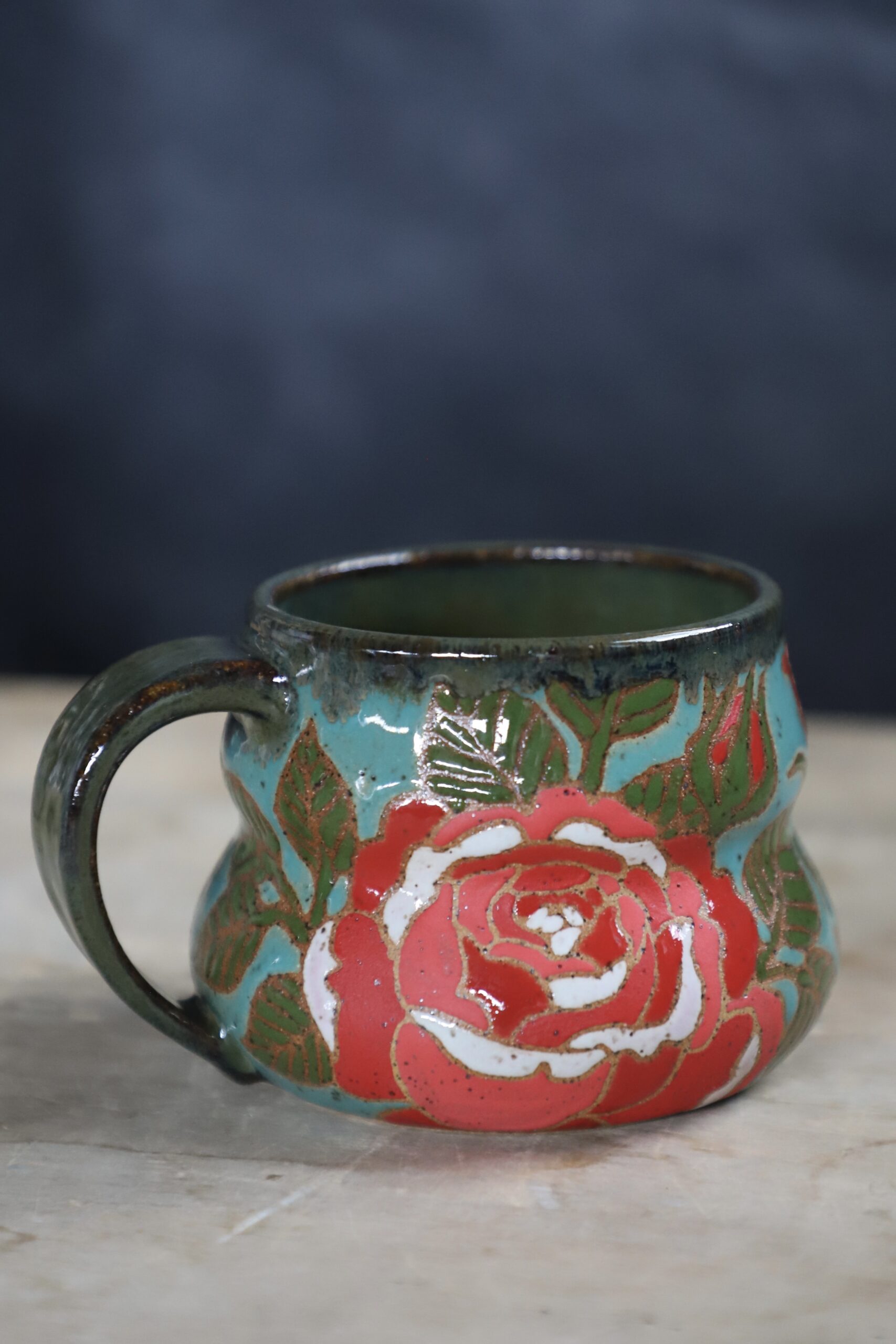 Rose mug holds 16oz. From my heART to you, made with joyful hands. Top rack dishwasher & microwave safe. As with any handmade item handwashing is best to ensure longevity.