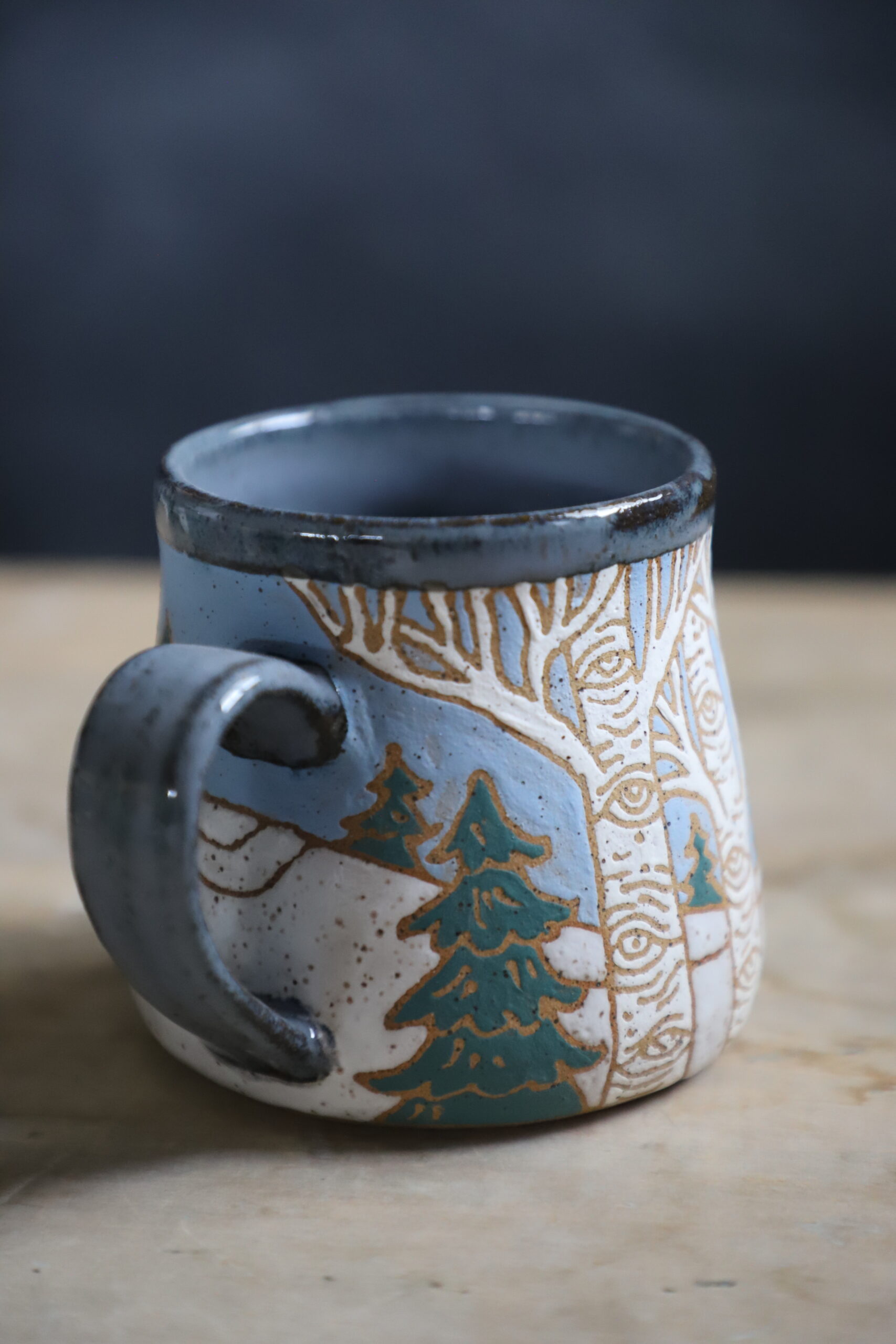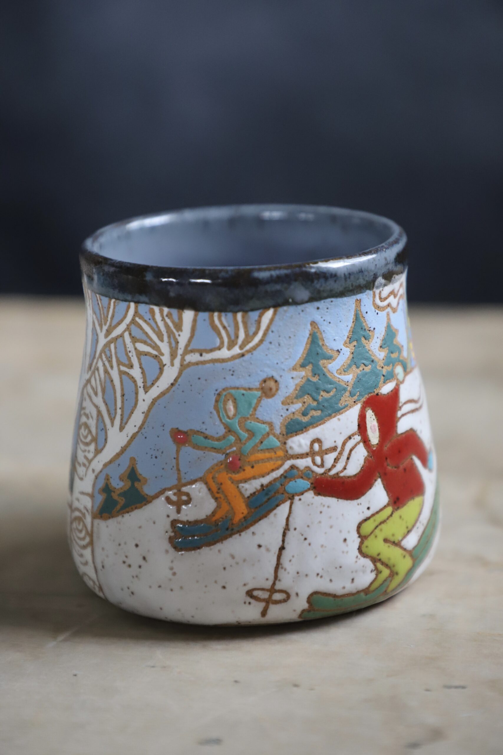 Ski mug holds 18.5oz. From my heART to you, made with joyful hands. Top rack dishwasher & microwave safe. As with any handmade item handwashing is best to ensure longevity.