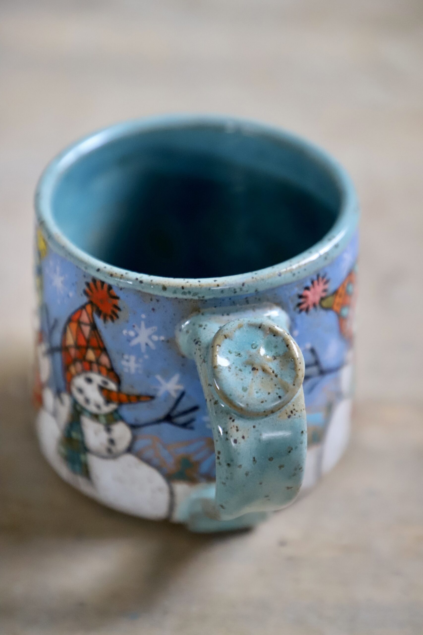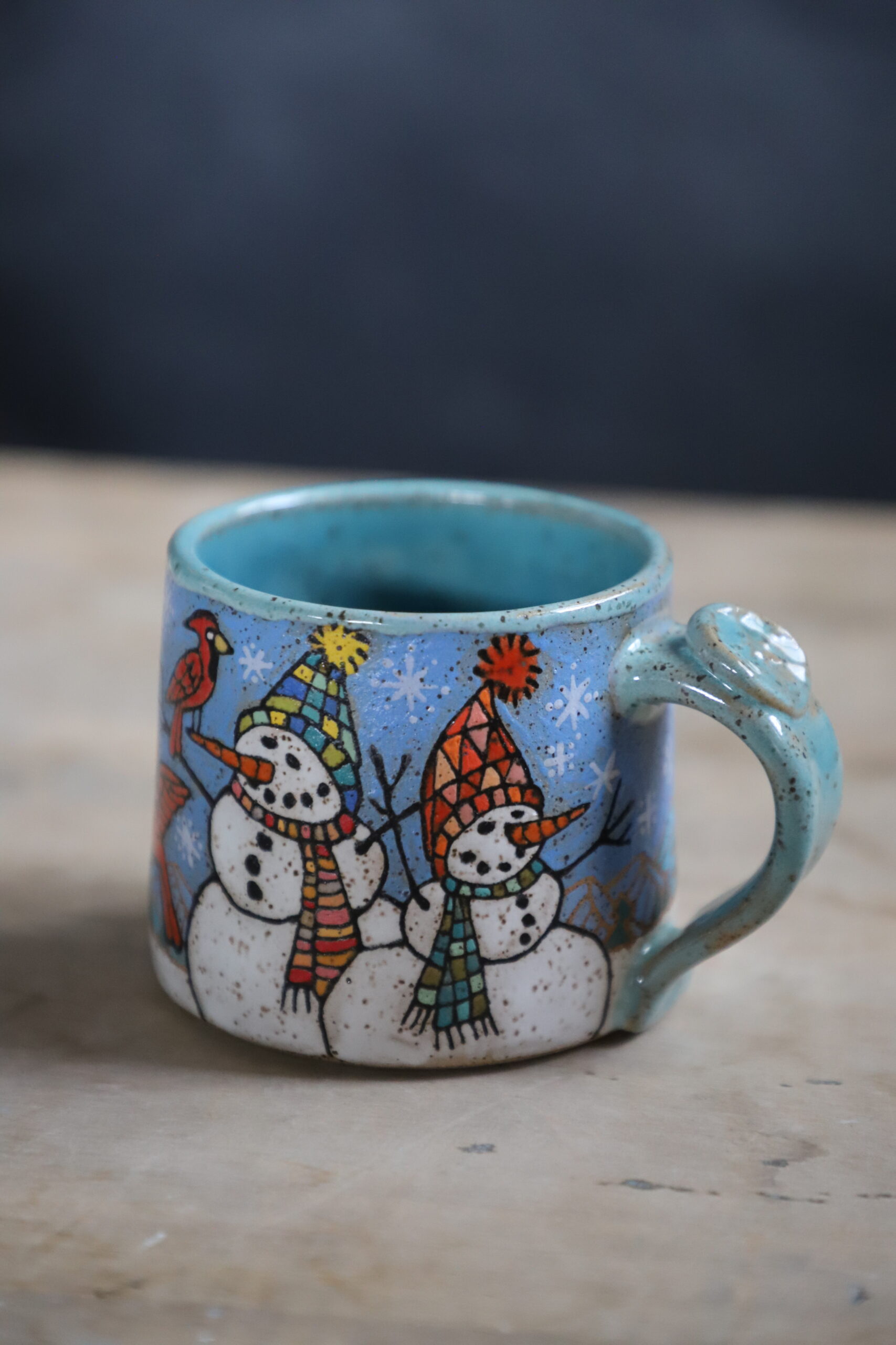 Snowman & cardinal mug holds 12oz. From my heART to you, made with joyful hands. Top rack dishwasher & microwave safe. As with any handmade item handwashing is best to ensure longevity.
