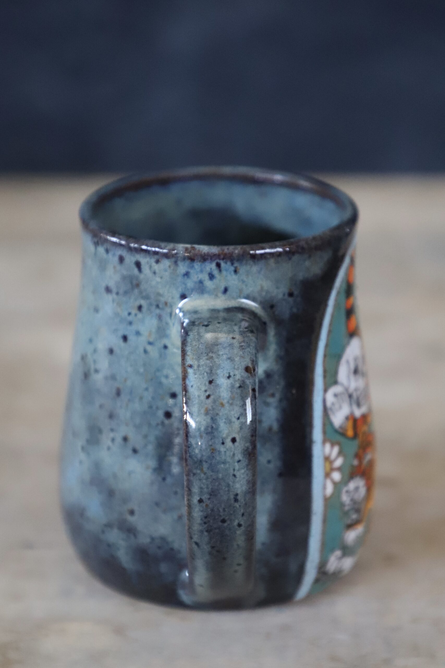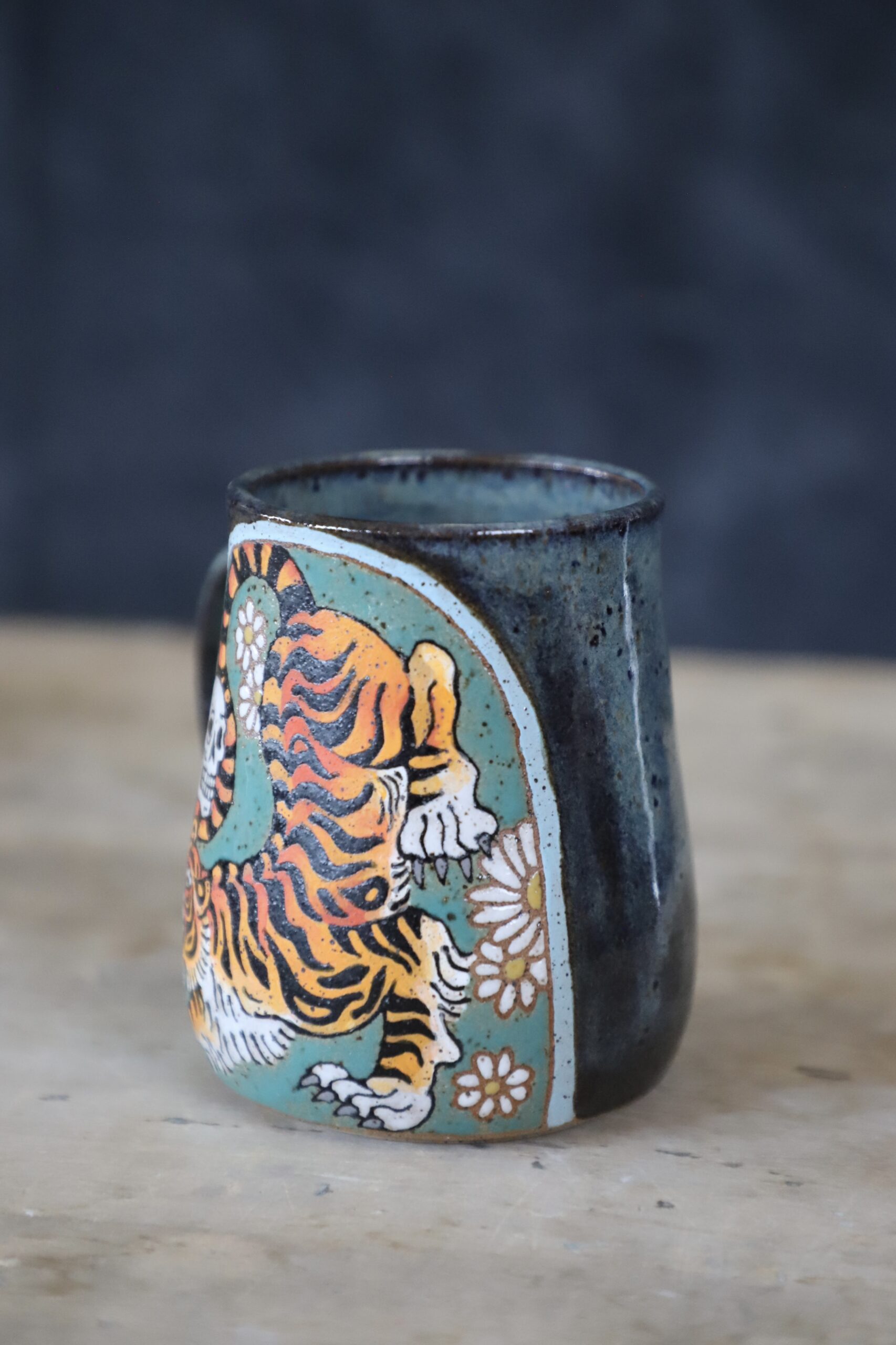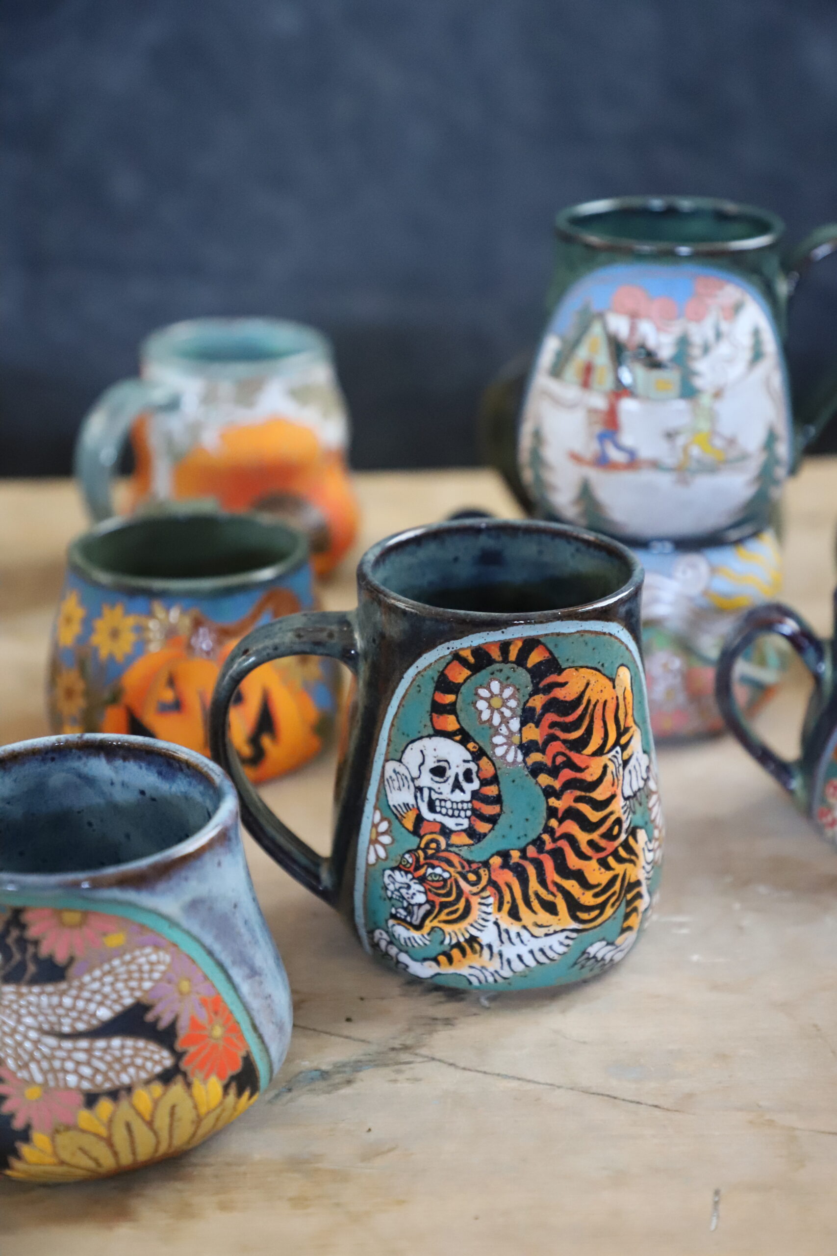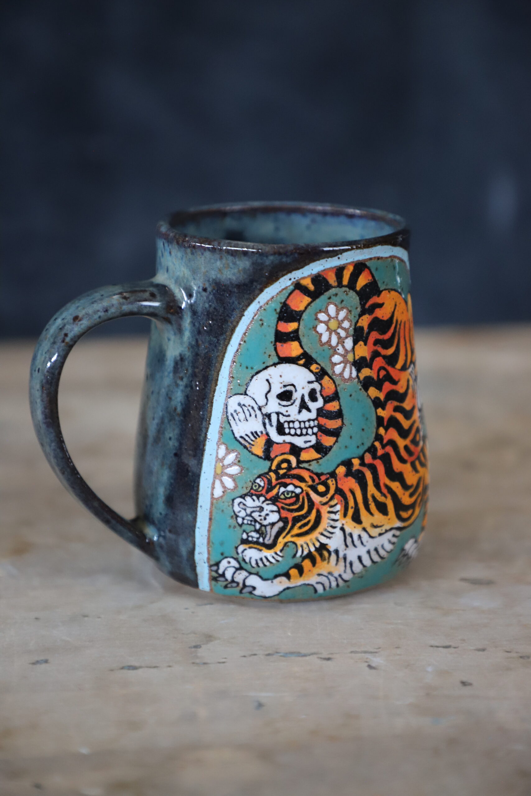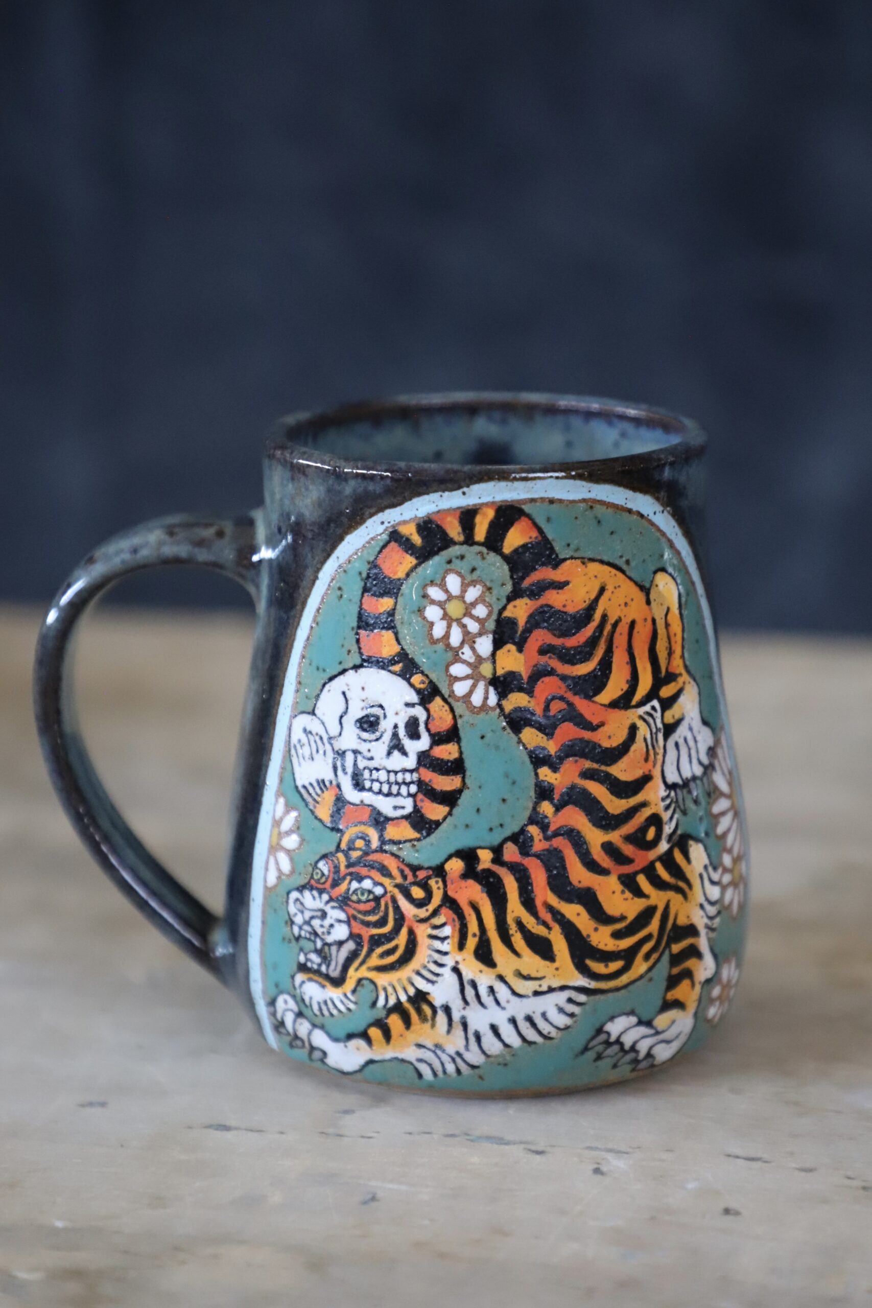 Tiger & skull mug holds 22oz. Made by joyful hands with love. With all handmade goods handwashing is best. Top rack dishwasher and microwave safe.