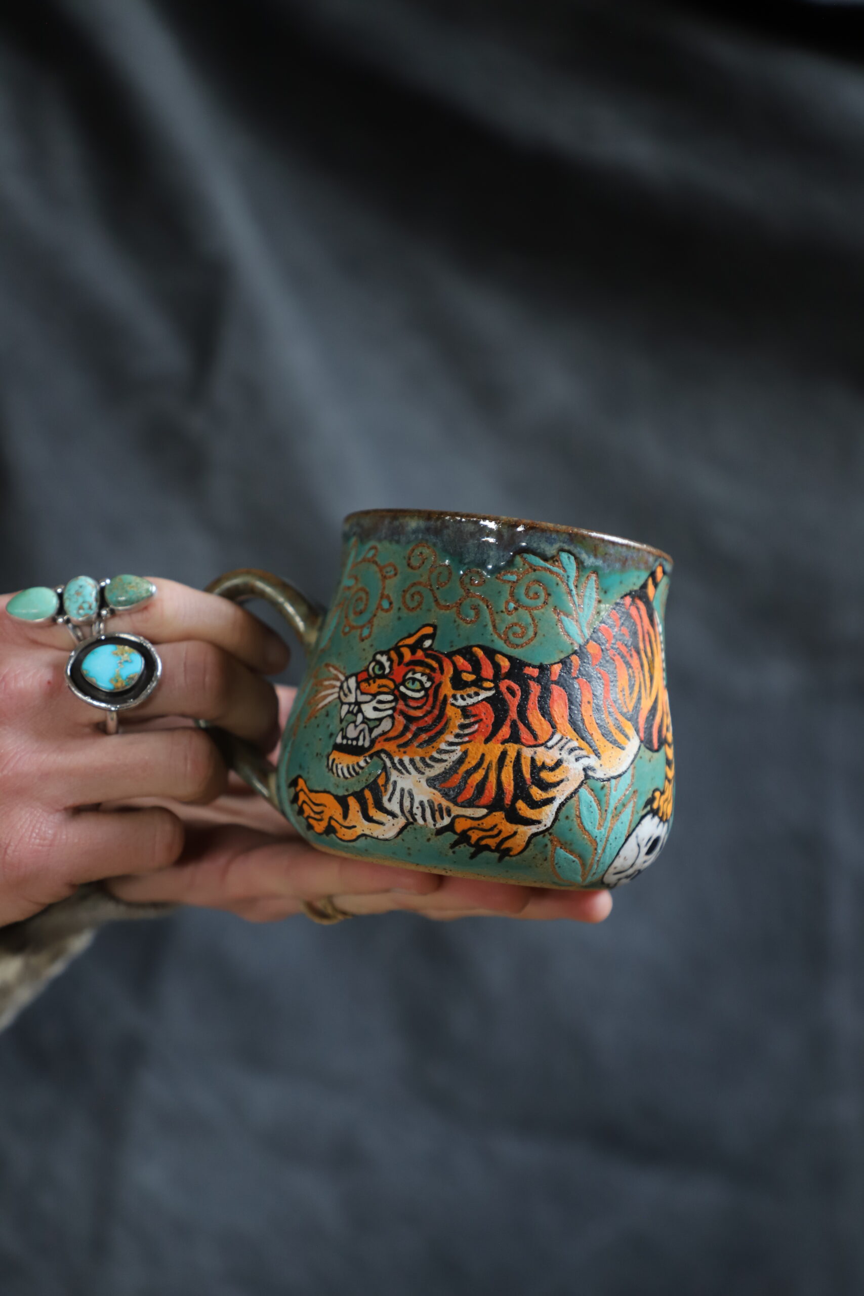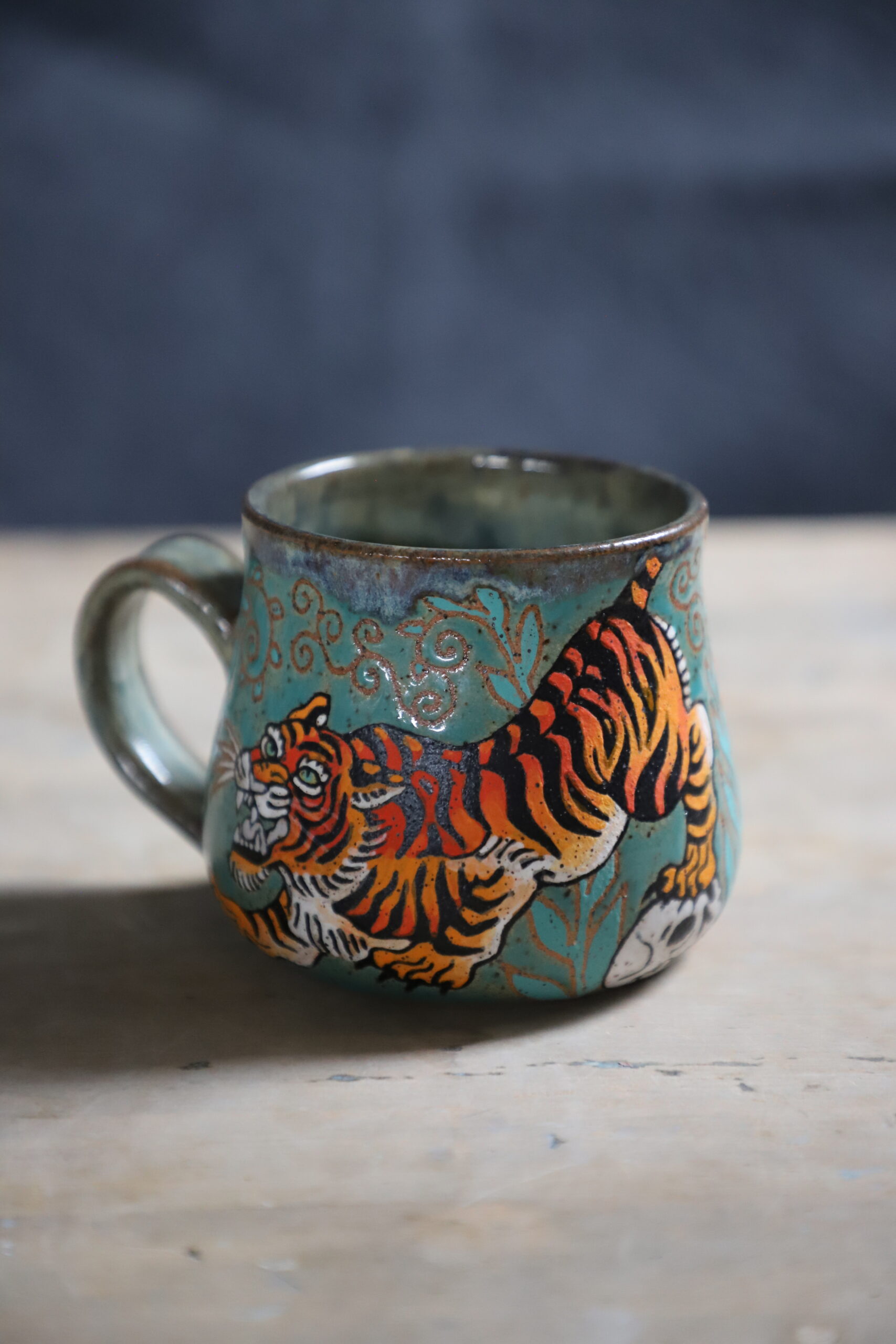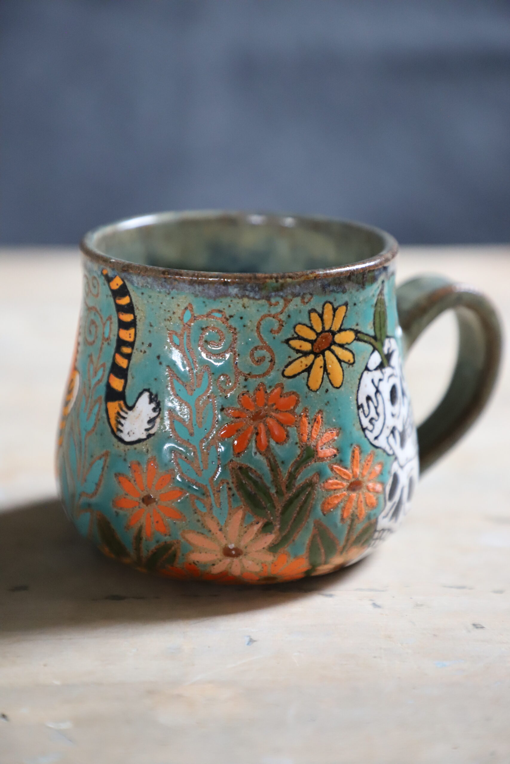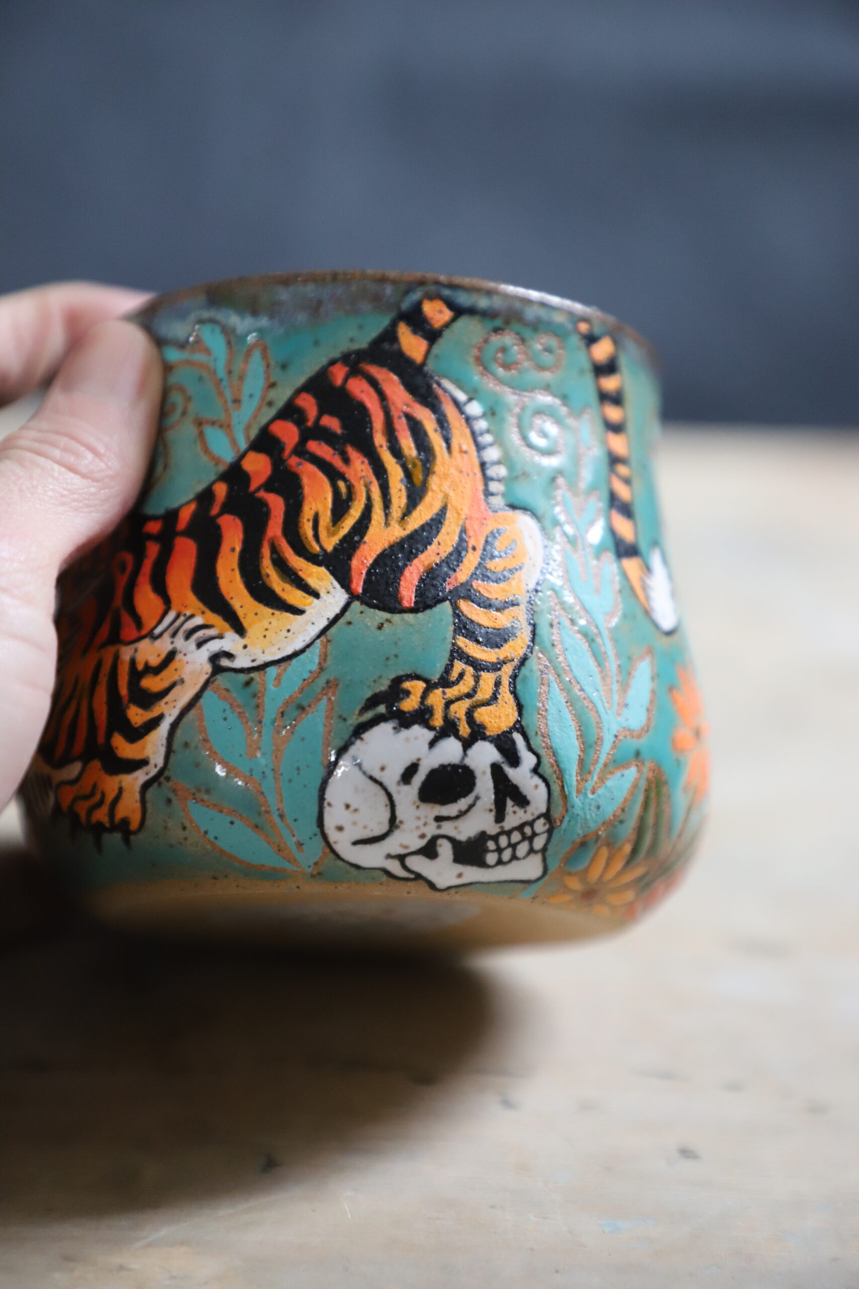 Tiger & skull mug holds 16oz. Handmade with love with joyful hands. Microwave & dishwasher safe. Although handwashing is best for the longevity of handmade pieces.