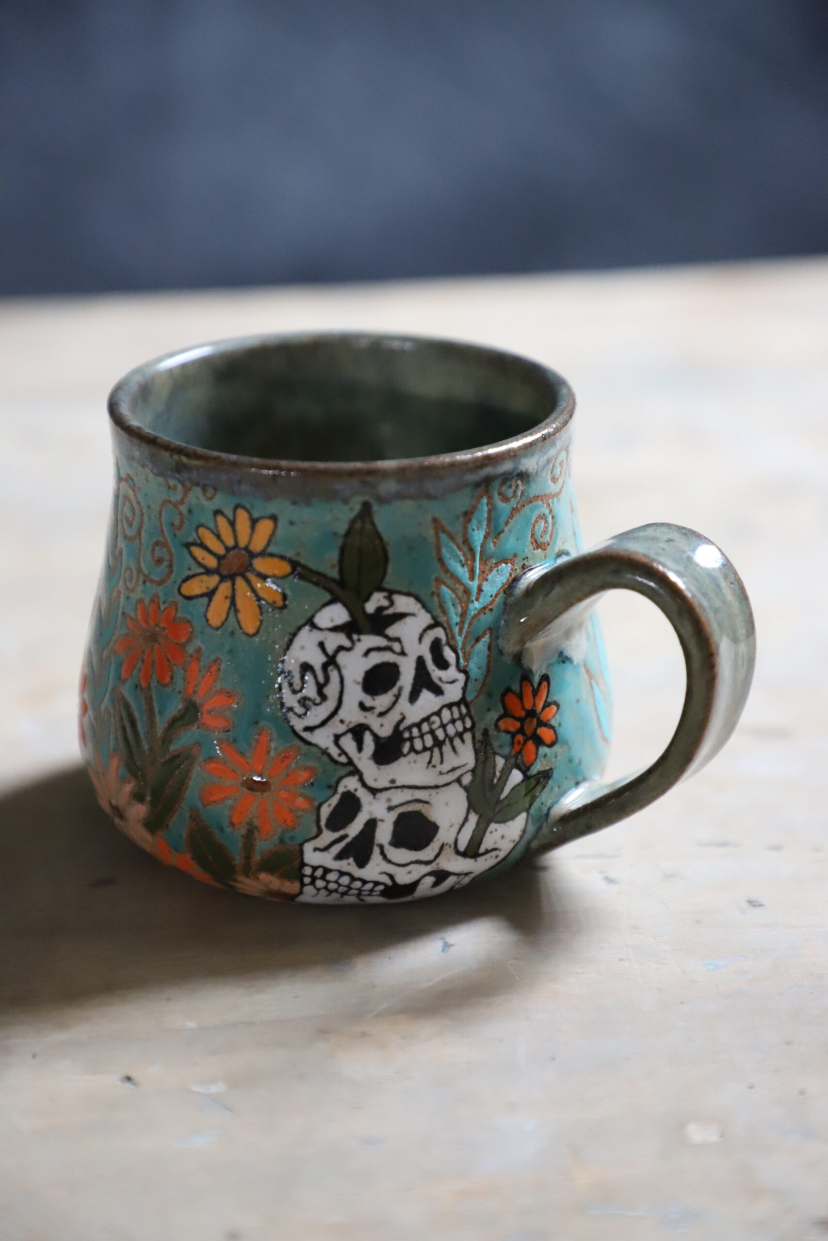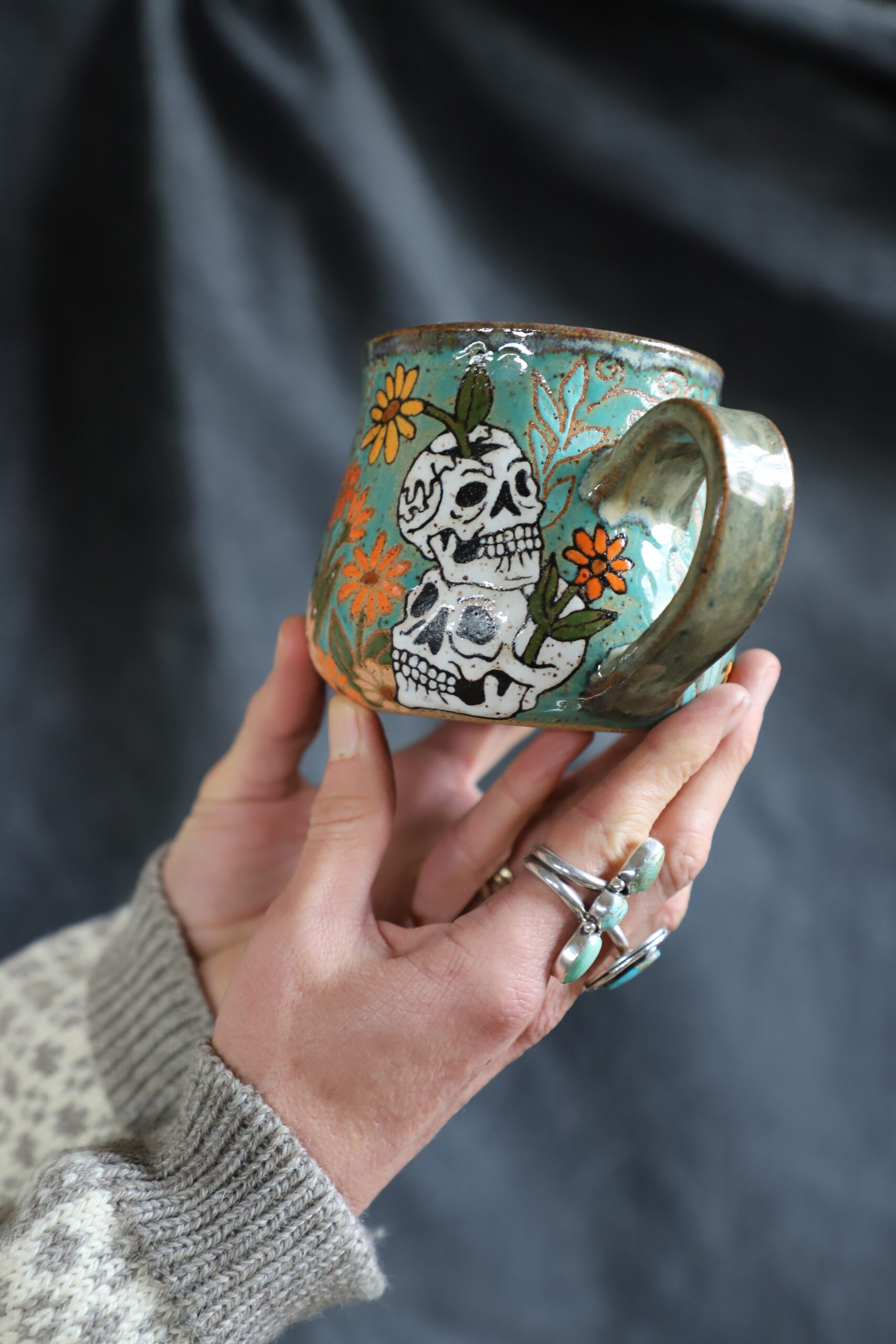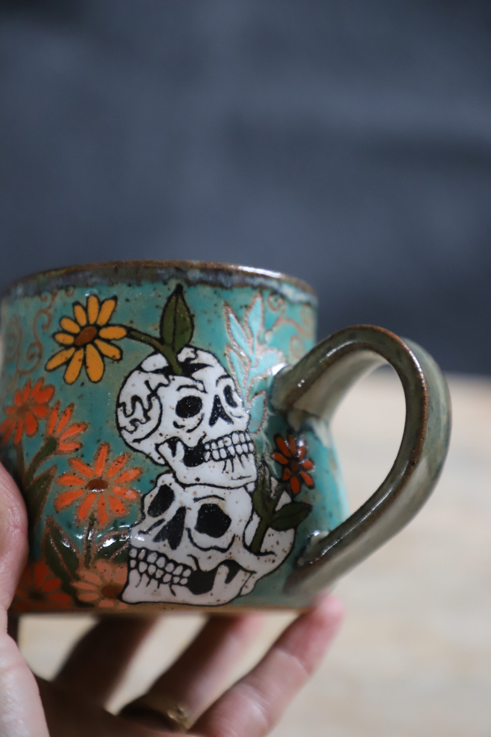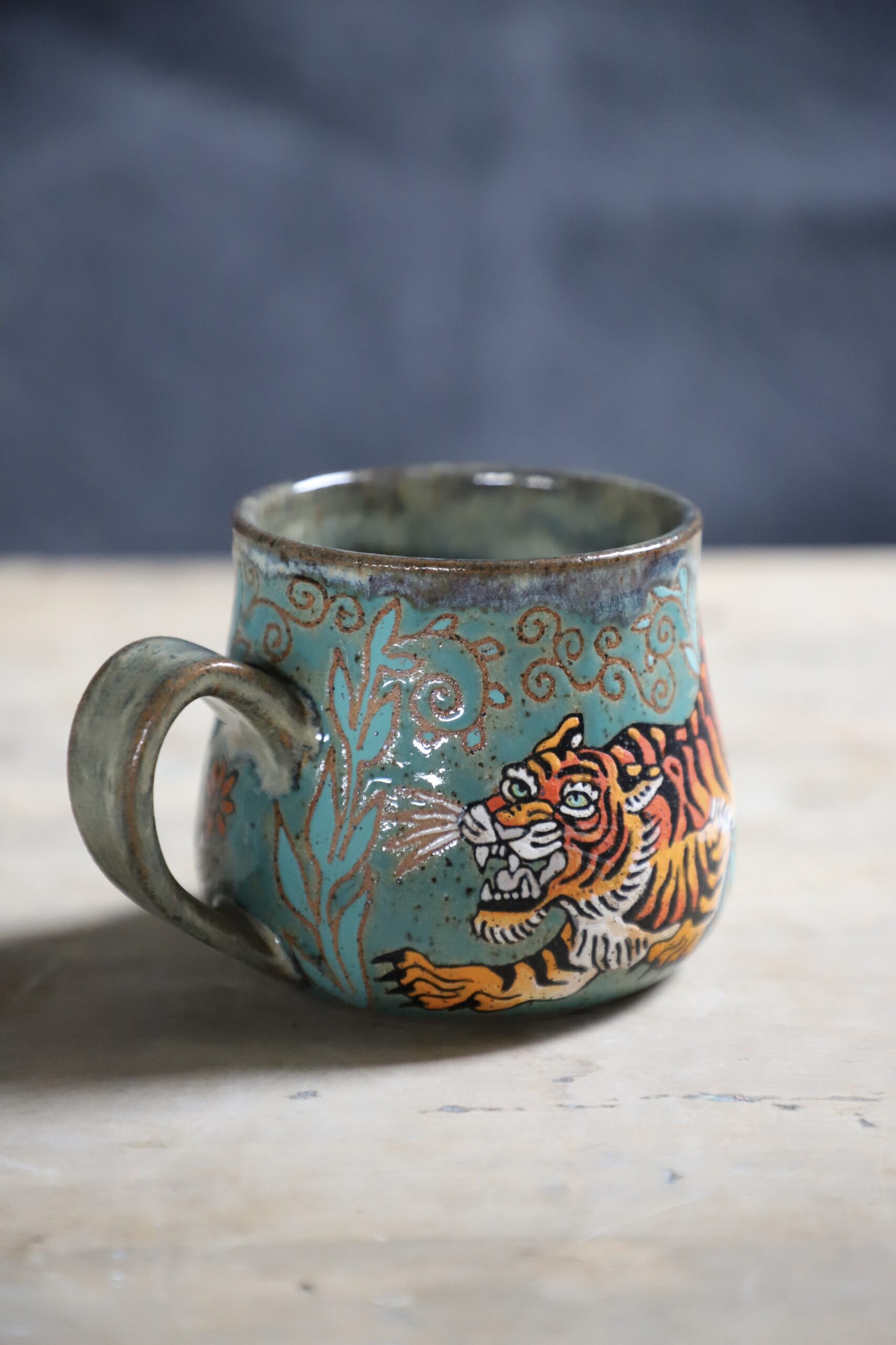Tiger & skull mug holds 16oz. Handmade with love with joyful hands. Microwave & dishwasher safe. Although handwashing is best for the longevity of handmade pieces.