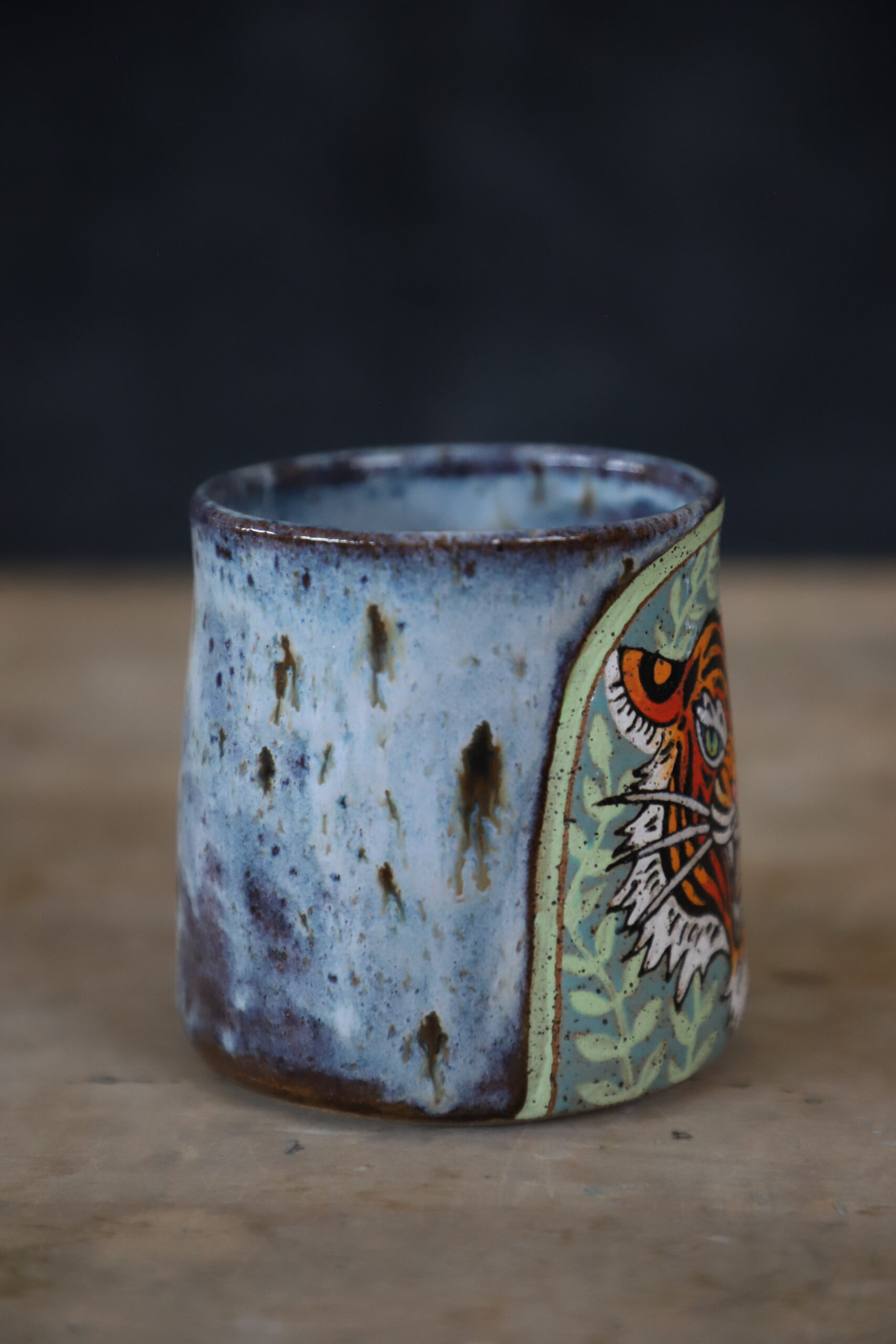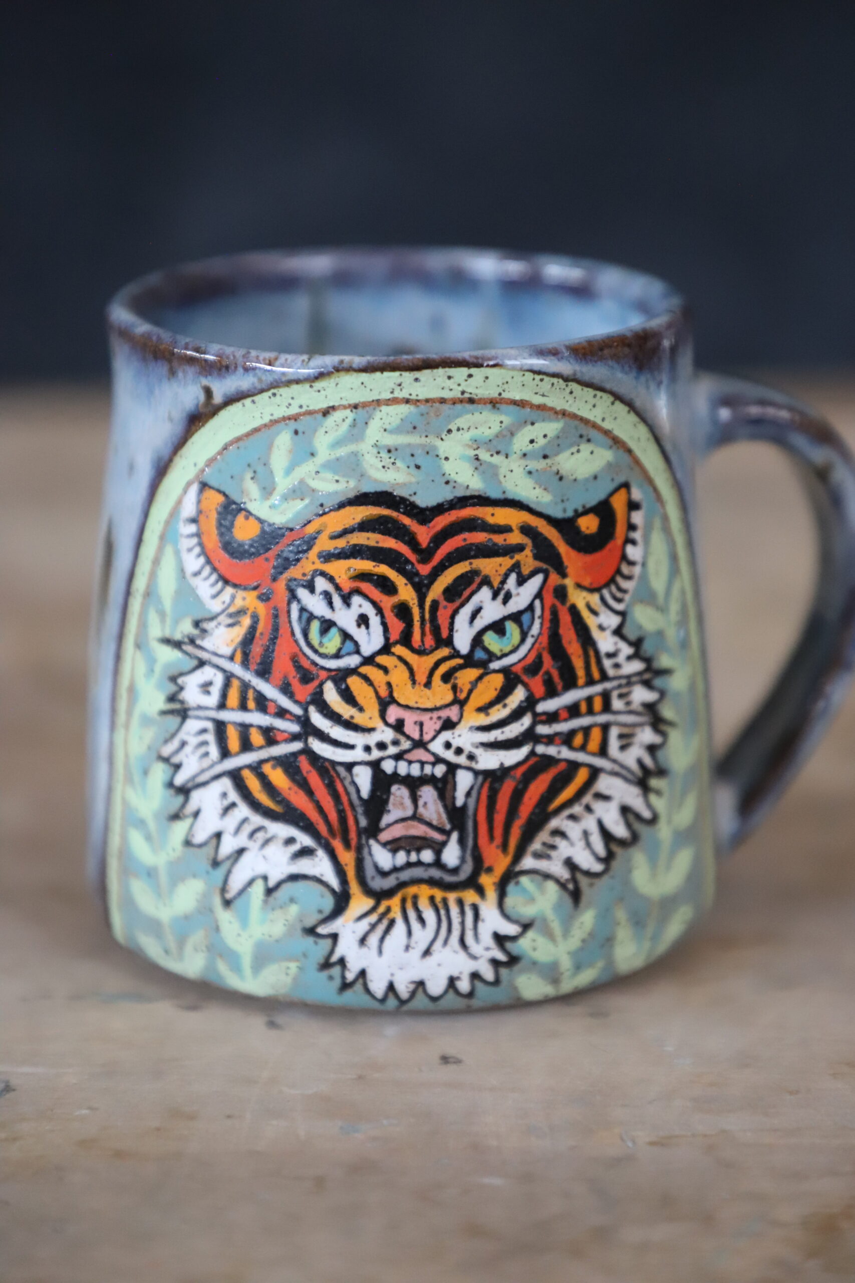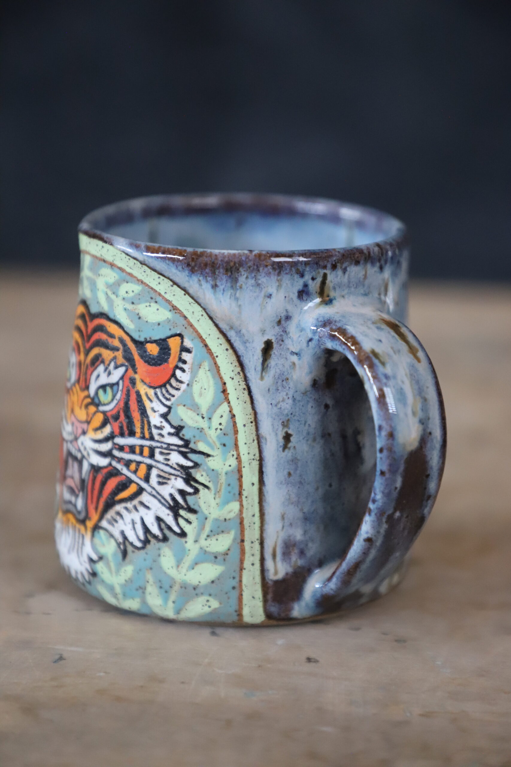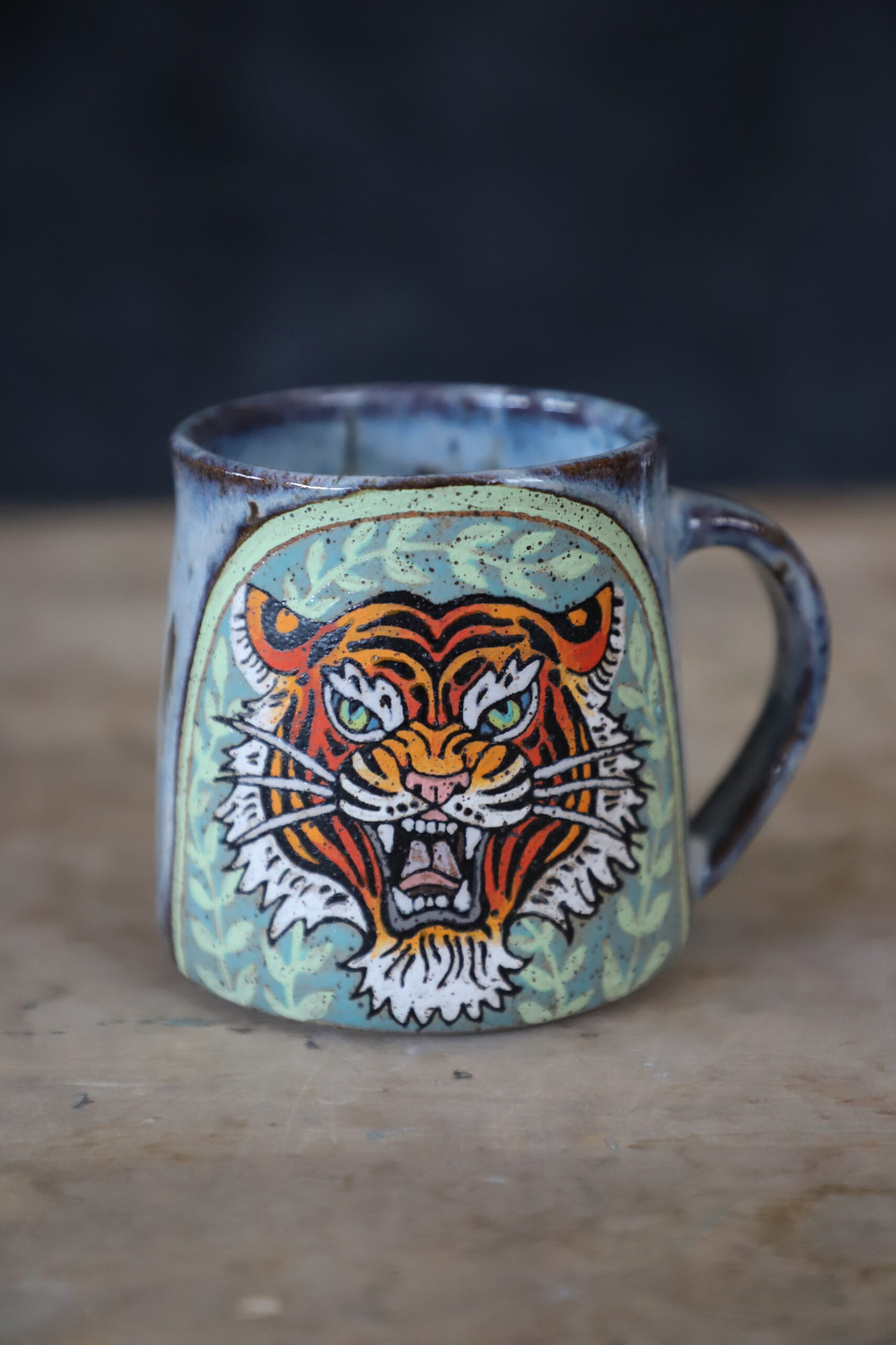 Tiger & vines mug holds 17oz. Made by joyful hands with love. With all handmade goods handwashing is best. Top rack dishwasher and microwave safe.