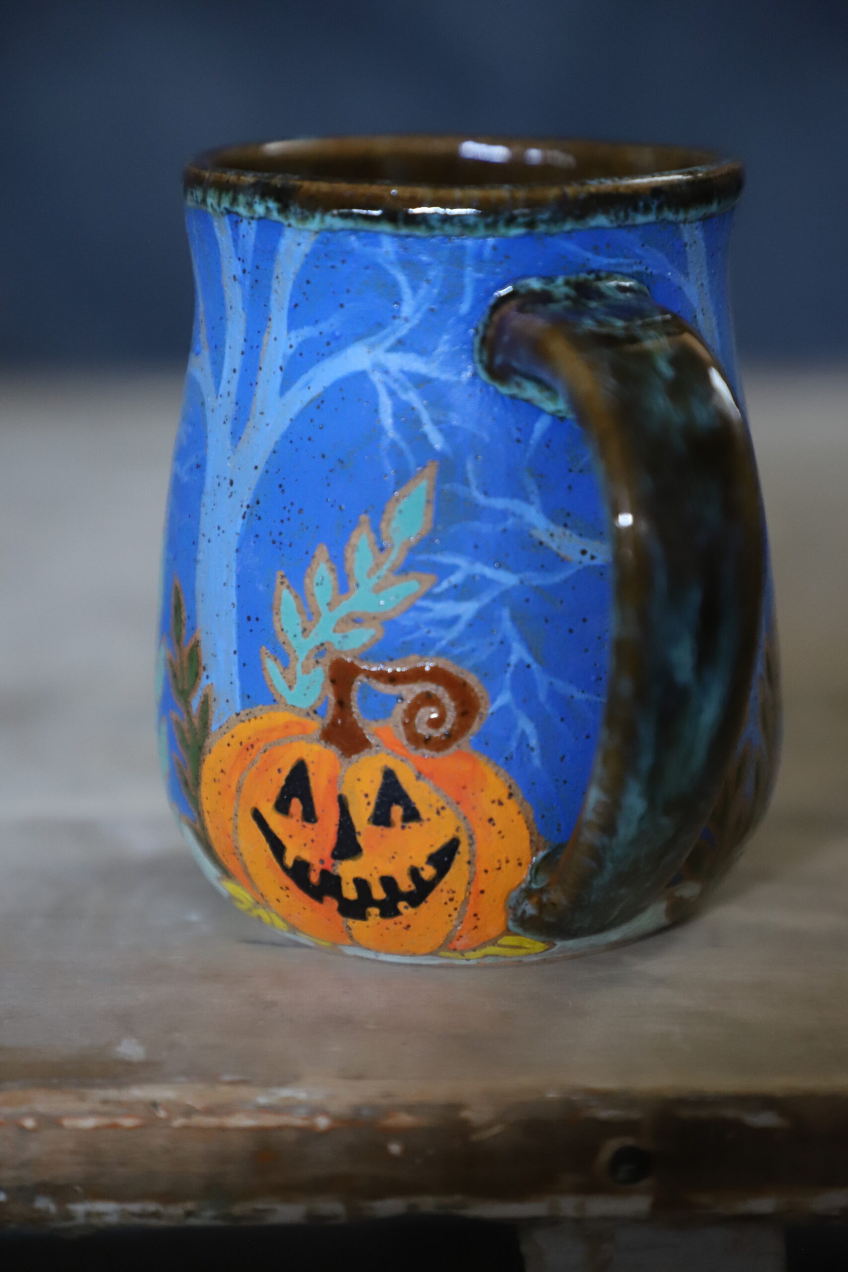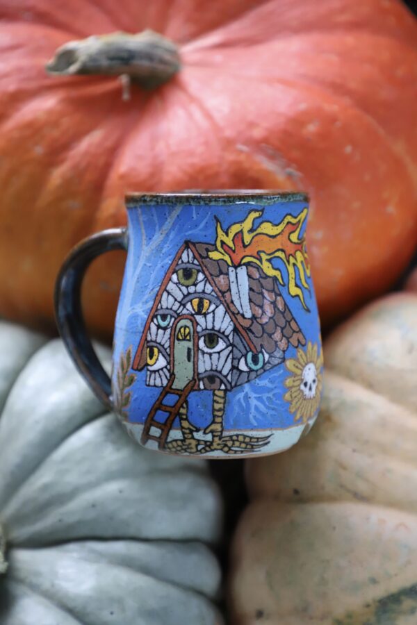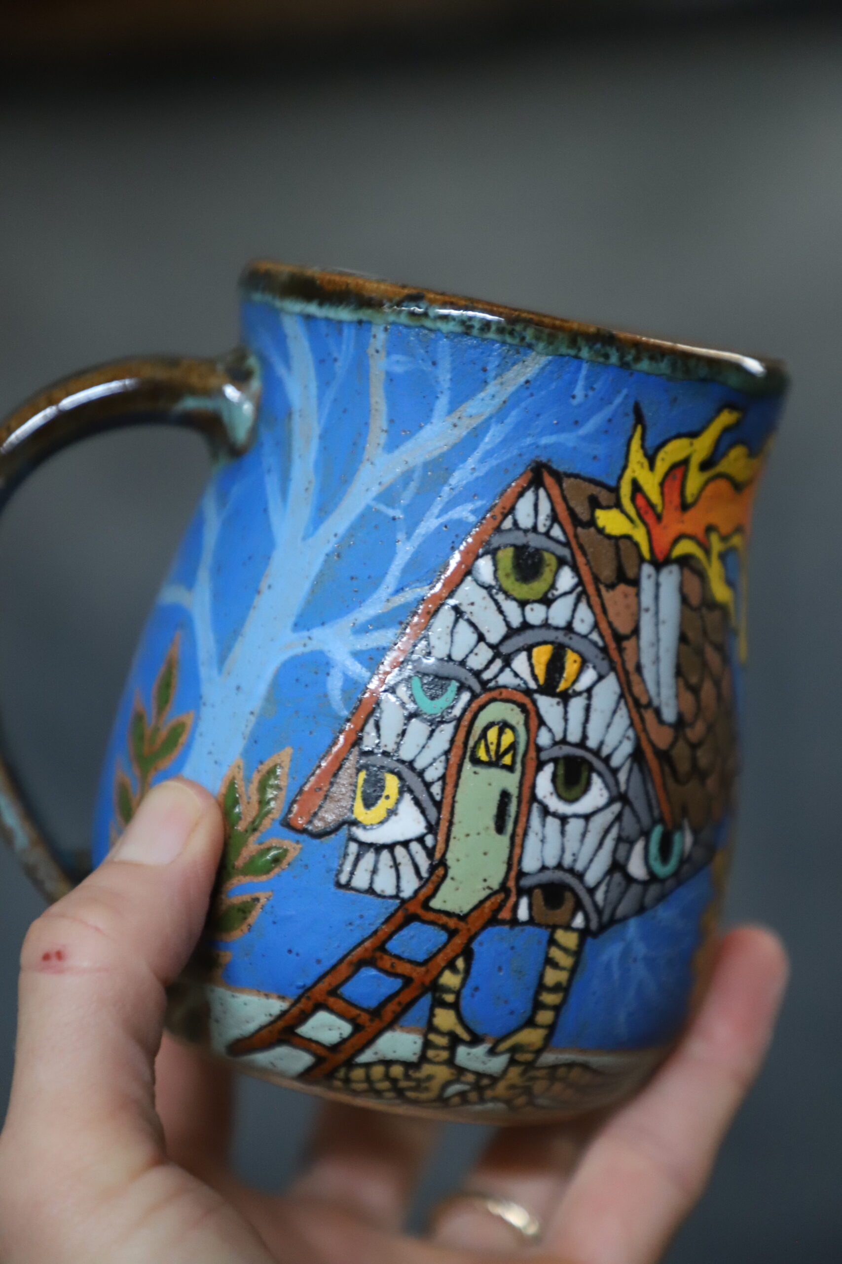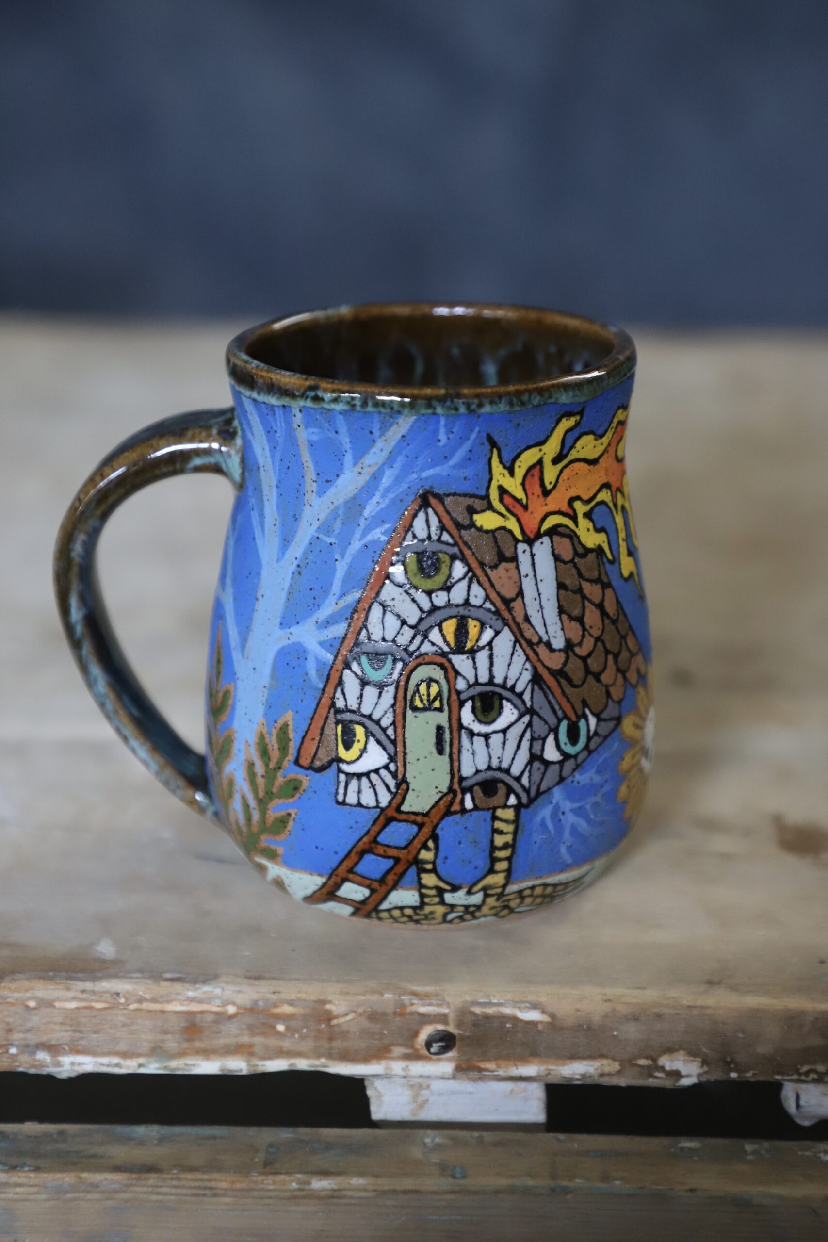 Watchful Baba mug holds 18.5oz. Microwave and top rack dishwasher safe. Handwashing is always best for the longevity of handmade.